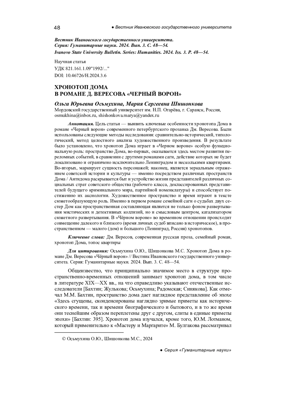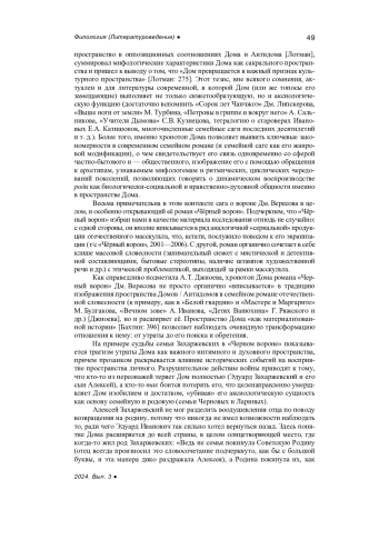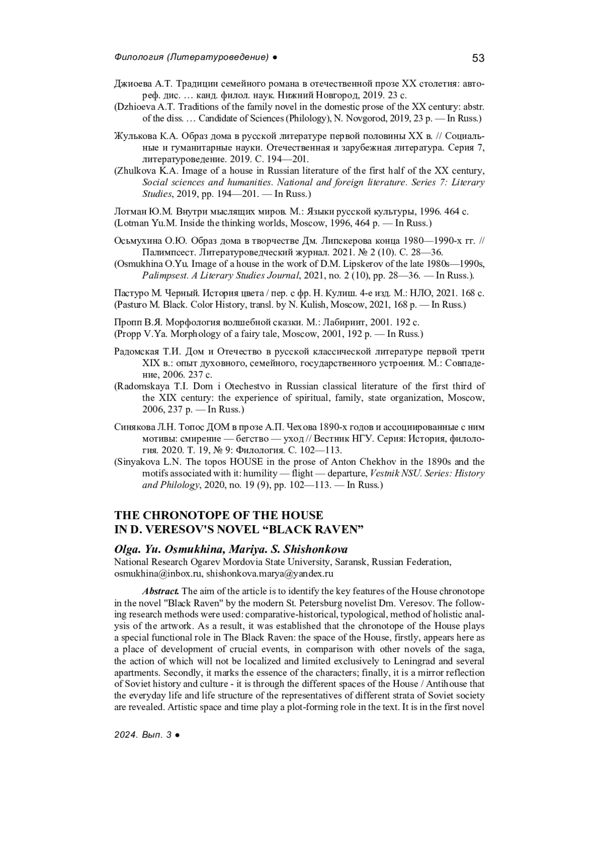 Цель статьи — выявить ключевые особенности хронотопа Дома в романе «Черный ворон» современного петербургского прозаика Дм. Вересова. Были использованы следующие методы исследования: сравнительно-исторический, типологический, метод целостного анализа художественного произведения. В результате было установлено, что хронотоп Дома играет в «Черном вороне» особую функциональную роль: пространство Дома, во-первых, оказывается здесь местом развития переломных событий, в сравнении с другими романами саги, действие которых не будет локализовано и ограничено исключительно Ленинградом и несколькими квартирами. Во-вторых, маркирует сущность персонажей; наконец, является зеркальным отражением советской истории и культуры — именно посредством различных пространств Дома / Антидома раскрывается быт и устройство жизни представителей различных социальных страт советского общества (рабочего класса, деклассированных представителей будущего криминального мира, партийной номенклатуры) и способствует постижению их аксиологии. Художественное пространство и время играют в тексте сюжетообразующую роль. Именно в первом романе семейной саги о судьбах двух сестер Дом как пространственная составляющая является не только фоном развертывания мистических и детективных коллизий, но и смысловым центром, катализатором сюжетного развертывания. В «Чёрном вороне» во временном отношении происходит совмещение далекого и близкого (время личных судеб вписано в историческое), в пространственном — малого (дом) и большого (Ленинград, Россия) хронотопов.