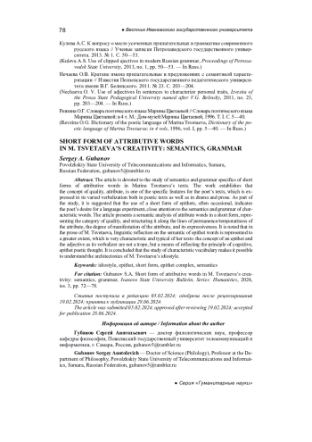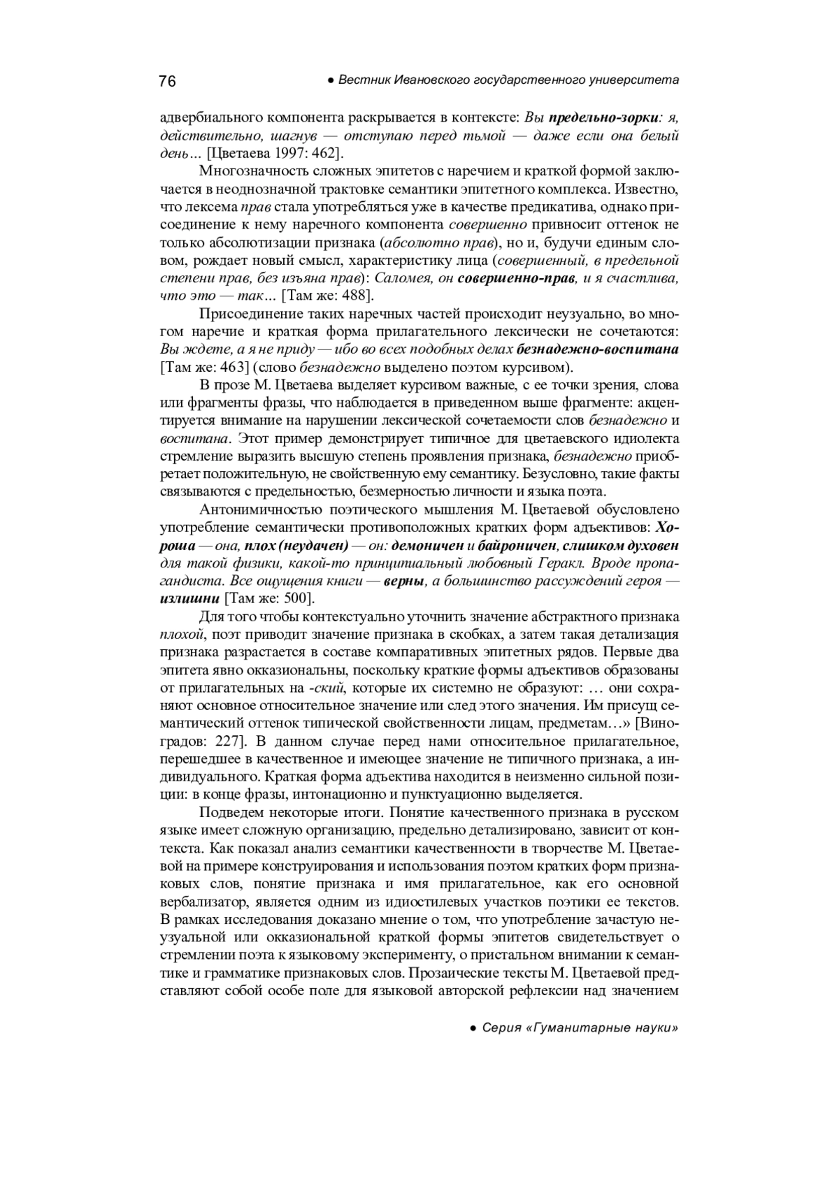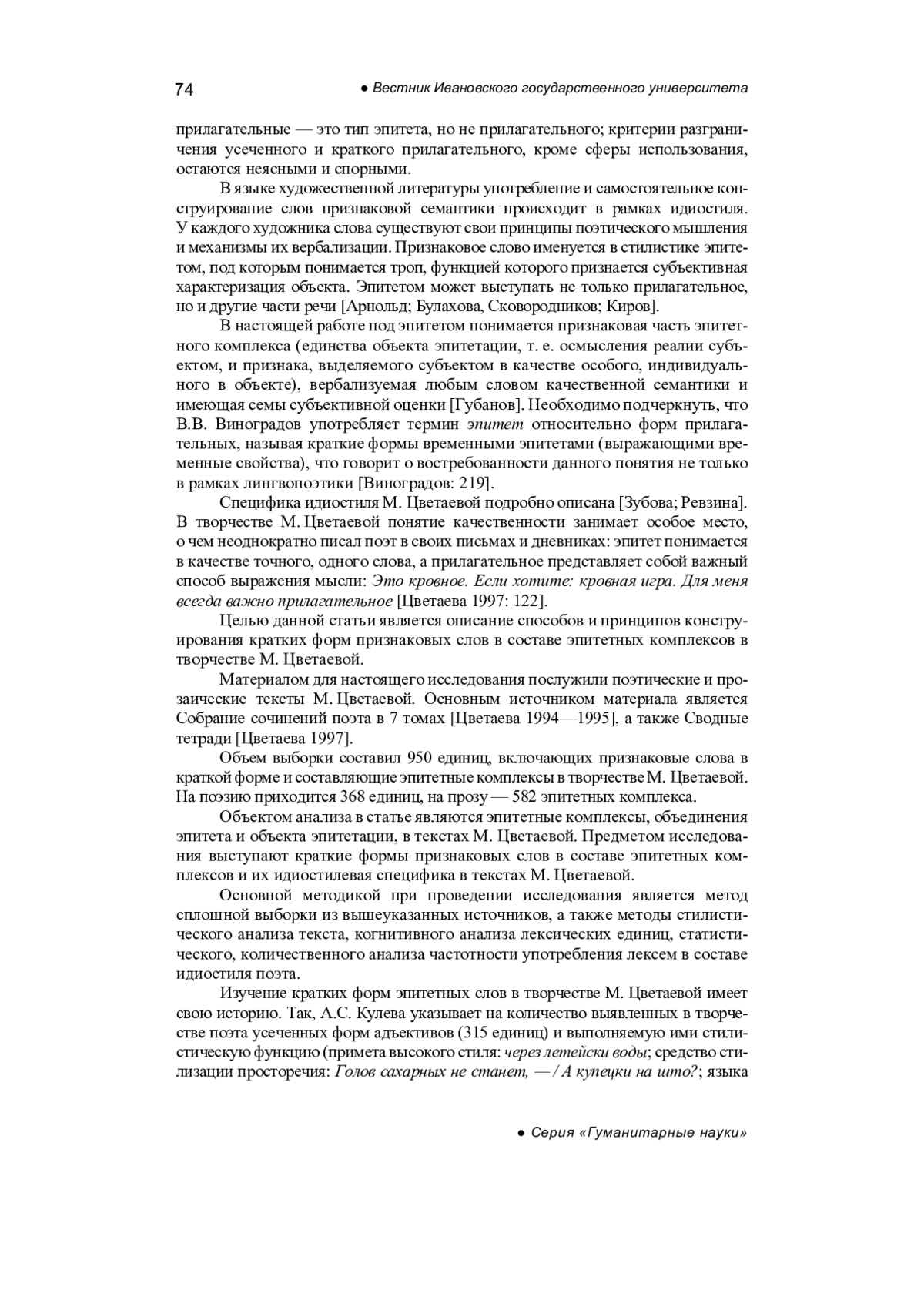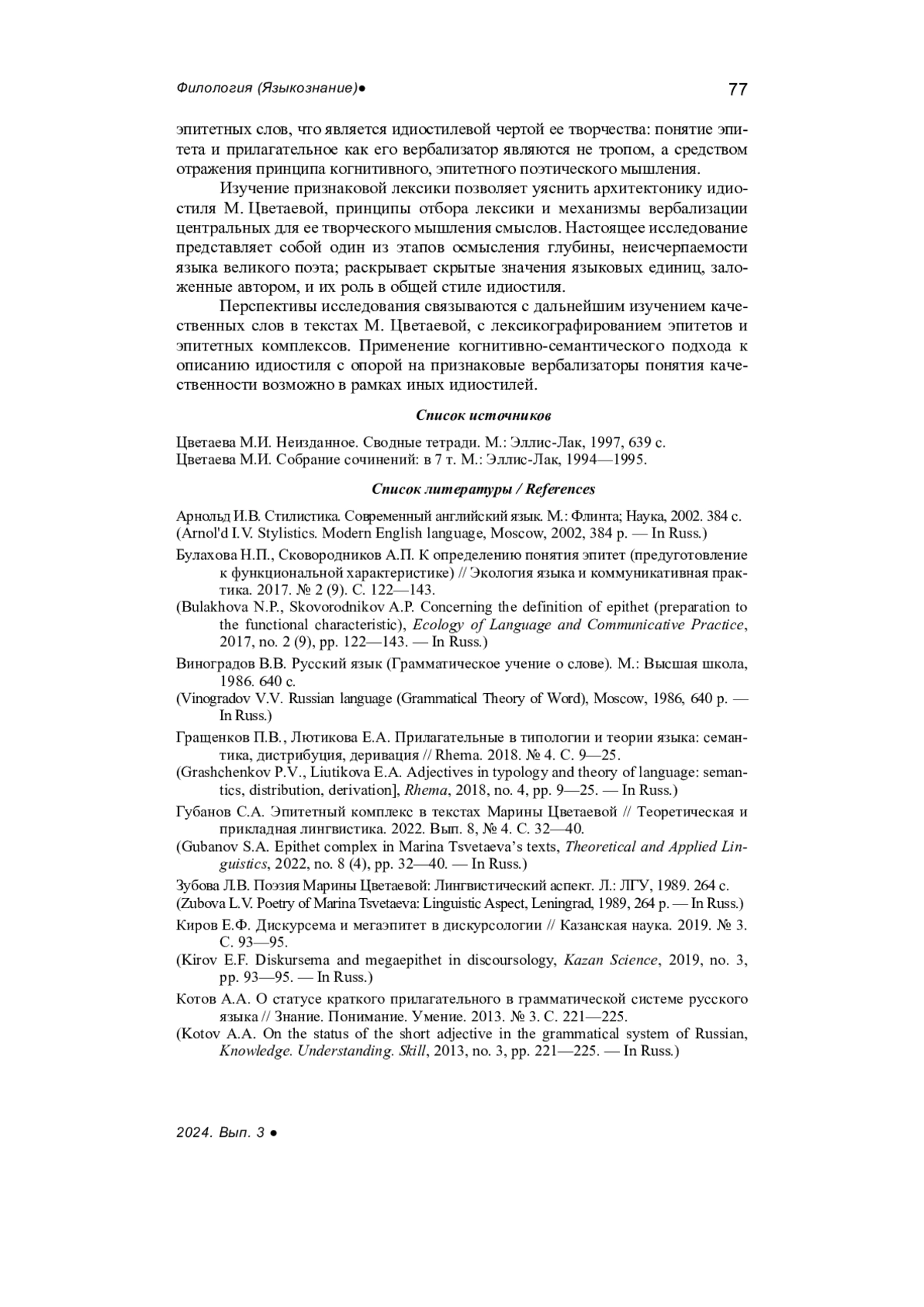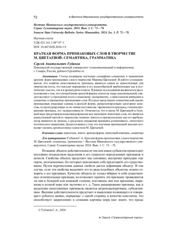ГУБАНОВ С. А. КРАТКАЯ ФОРМА ПРИЗНАКОВЫХ СЛОВ В ТВОРЧЕСТВЕ М. ЦВЕТАЕВОЙ: СЕМАНТИКА, ГРАММАТИКА // ВЕСТНИК ИВАНОВСКОГО ГОСУДАРСТВЕННОГО УНИВЕРСИТЕТА. СЕРИЯ: ГУМАНИТАРНЫЕ НАУКИ. 2024. № 3