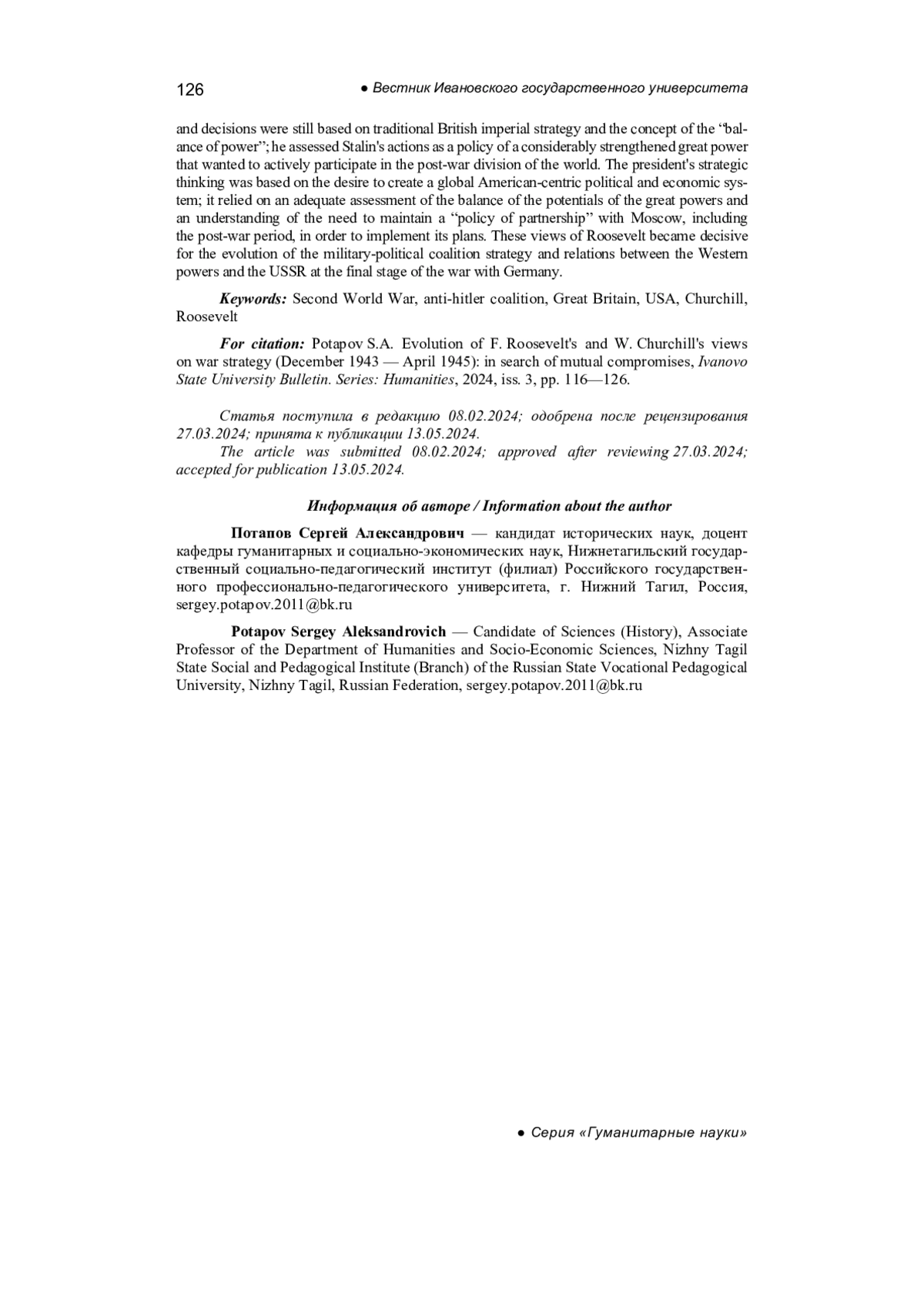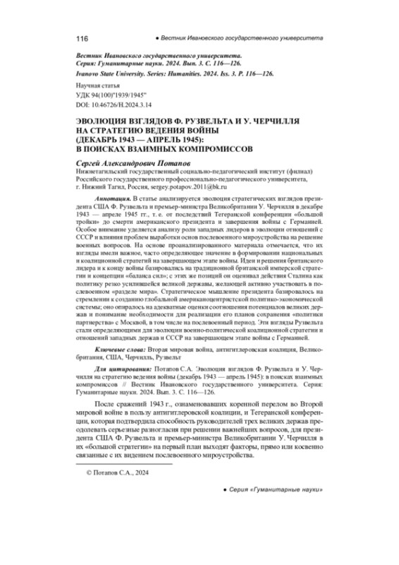 В статье анализируется эволюция стратегических взглядов президента США Ф. Рузвельта и премьер-министра Великобритании У. Черчилля в декабре 1943 — апреле 1945 гг., т. е. от последствий Тегеранской конференции «большой тройки» до смерти американского президента и завершения войны с Германией. Особое внимание уделяется анализу роли западных лидеров в эволюции отношений с СССР и влияния проблем выработки основ послевоенного мироустройства на решение военных вопросов. На основе проанализированного материала отмечается, что их взгляды имели важное, часто определяющее значение в формировании национальных и коалиционной стратегий на завершающем этапе войны. Идеи и решения британского лидера и к концу войны базировались на традиционной британской имперской стратегии и концепции «баланса сил»; с этих же позиций он оценивал действия Сталина как политику резко усилившейся великой державы, желающей активно участвовать в послевоенном «разделе мира». Стратегическое мышление президента базировалось на стремлении к созданию глобальной американоцентристской политико-экономической системы; оно опиралось на адекватные оценки соотношения потенциалов великих держав и понимание необходимости для реализации его планов сохранения «политики партнерства» с Москвой, в том числе на послевоенный период. Эти взгляды Рузвельта стали определяющими для эволюции военно-политической коалиционной стратегии и отношений западных держав и СССР на завершающем этапе войны с Германией.