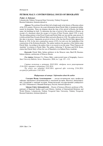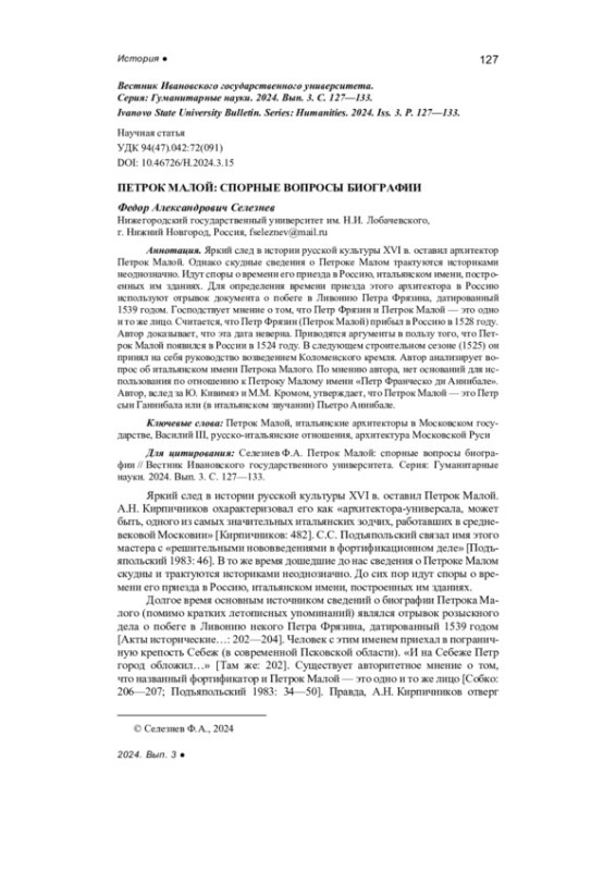 СЕЛЕЗНЕВ Ф. А. ПЕТРОК МАЛОЙ: СПОРНЫЕ ВОПРОСЫ БИОГРАФИИ // ВЕСТНИК ИВАНОВСКОГО ГОСУДАРСТВЕННОГО УНИВЕРСИТЕТА. СЕРИЯ: ГУМАНИТАРНЫЕ НАУКИ. 2024. № 3