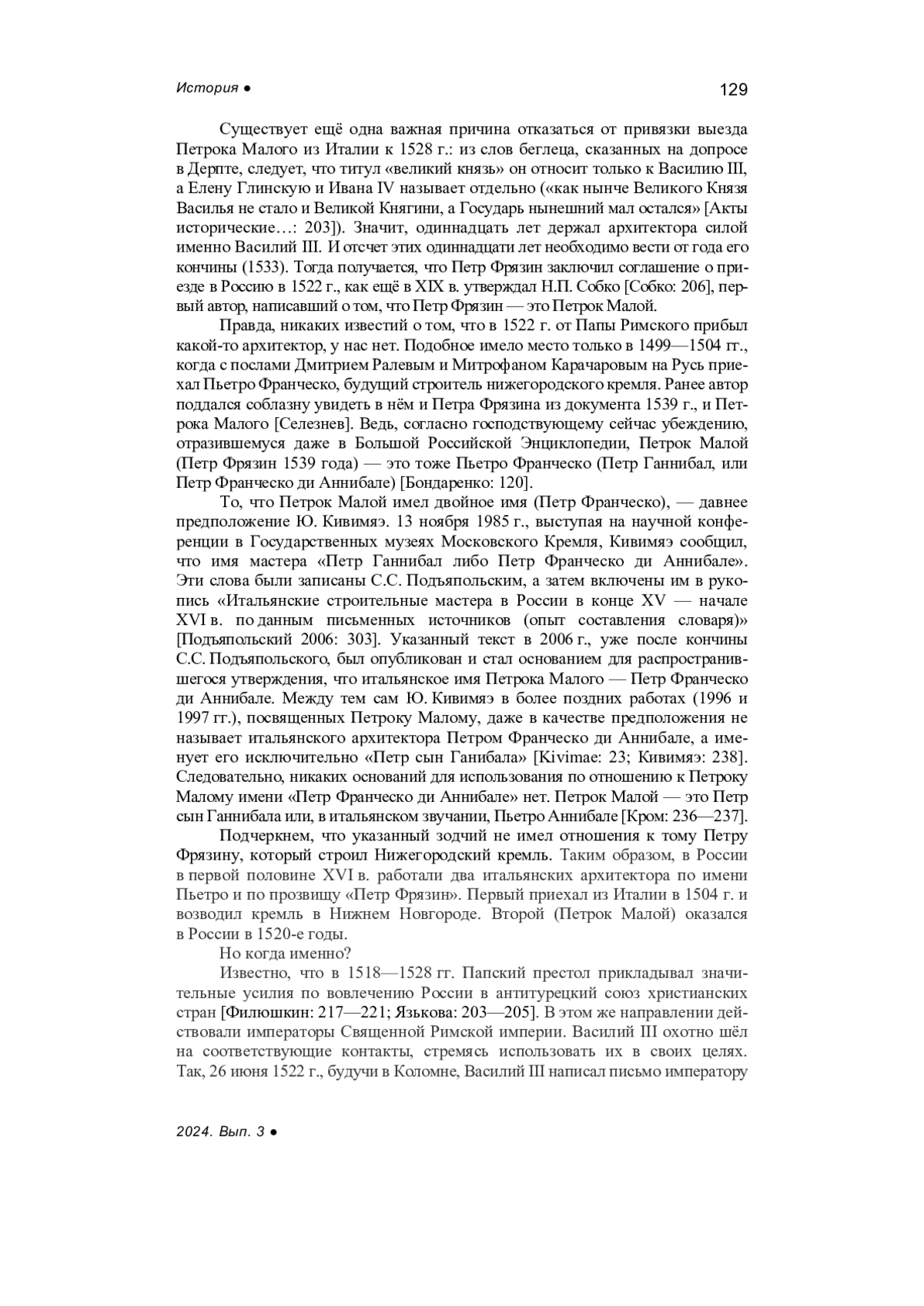 Яркий след в истории русской культуры XVI в. оставил архитектор Петрок Малой. Однако скудные сведения о Петроке Малом трактуются историками неоднозначно. Идут споры о времени его приезда в Россию, итальянском имени, построенных им зданиях. Для определения времени приезда этого архитектора в Россию используют отрывок документа о побеге в Ливонию Петра Фрязина, датированный 1539 годом. Господствует мнение о том, что Петр Фрязин и Петрок Малой — это одно и то же лицо. Считается, что Петр Фрязин (Петрок Малой) прибыл в Россию в 1528 году. Автор доказывает, что эта дата неверна. Приводятся аргументы в пользу того, что Петрок Малой появился в России в 1524 году. В следующем строительном сезоне (1525) он принял на себя руководство возведением Коломенского кремля. Автор анализирует вопрос об итальянском имени Петрока Малого. По мнению автора, нет оснований для использования по отношению к Петроку Малому имени «Петр Франческо ди Аннибале». Автор, вслед за Ю. Кивимяэ и М. М. Кромом, утверждает, что Петрок Малой — это Петр сын Ганнибала или (в итальянском звучании) Пьетро Аннибале.