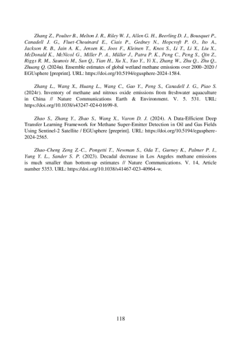 174. Zhang Z., Poulter B., Melton J. R., Riley W. J., Allen G. H., Beerling D. J., Bousquet P., Canadell J. G., Fluet-Chouinard E., Ciais P., Gedney N., Hopcroft P. O., Ito A., Jackson R. B., Jain A. K., Jensen K., Joos F., Kleinen T., Knox S., Li T., Li X., Liu X., McDonald K., McNicol G., Miller P. A., Muller J., Patra P. K., Peng C., Peng S., Qin Z., Riggs R. M., Saunois M., Sun Q., Tian H., Xu X., Yao Y., Yi X., Zhang W., Zhu Q., Zhu Q., Zhuang Q. (2024в). Ensemble estimates of global wetland methane emissions over 2000-2020 / EGUsphere [preprint]. DOI: 10.5194/egusphere-2024-1584