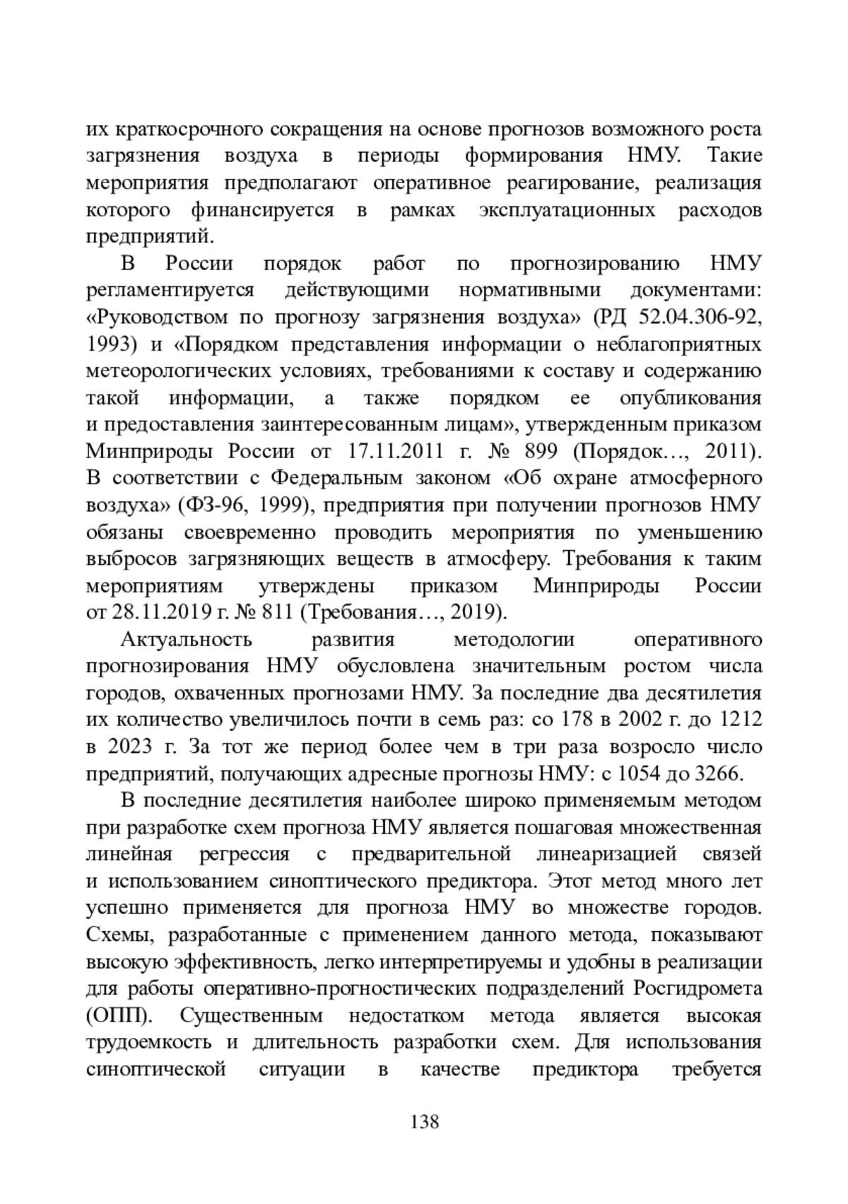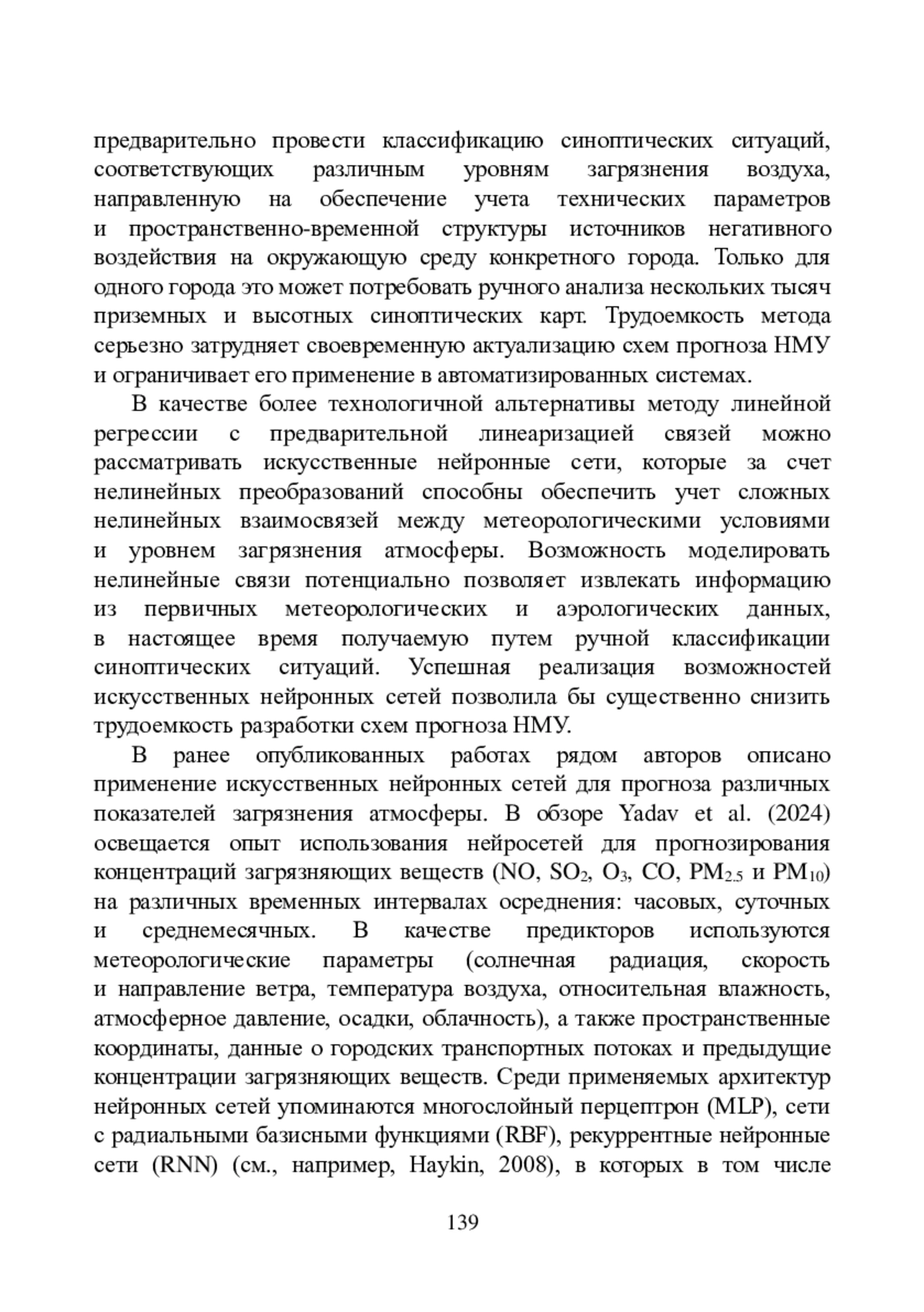 Предложен новый метод оперативного прогноза неблагоприятных метеорологических условий (НМУ) на основе искусственных нейронных сетей. Проведен сравнительный анализ трех подходов: пошаговой линейной регрессии с предварительной линеаризацией связей и синоптическим предиктором, а также многослойного перцептрона - с включением и без включения синоптического предиктора. Обучение и тестирование моделей проведено на данных девяти городов (суммарно более 35 лет наблюдений). Все подходы показали достаточную эффективность, при этом нейросетевые схемы обеспечили лучшую предупрежденность НМУ при меньшем числе ложных тревог. Результаты демонстрируют перспективность автоматизации учета крупномасштабных атмосферных процессов вместо традиционной ручной классификации синоптических ситуаций.