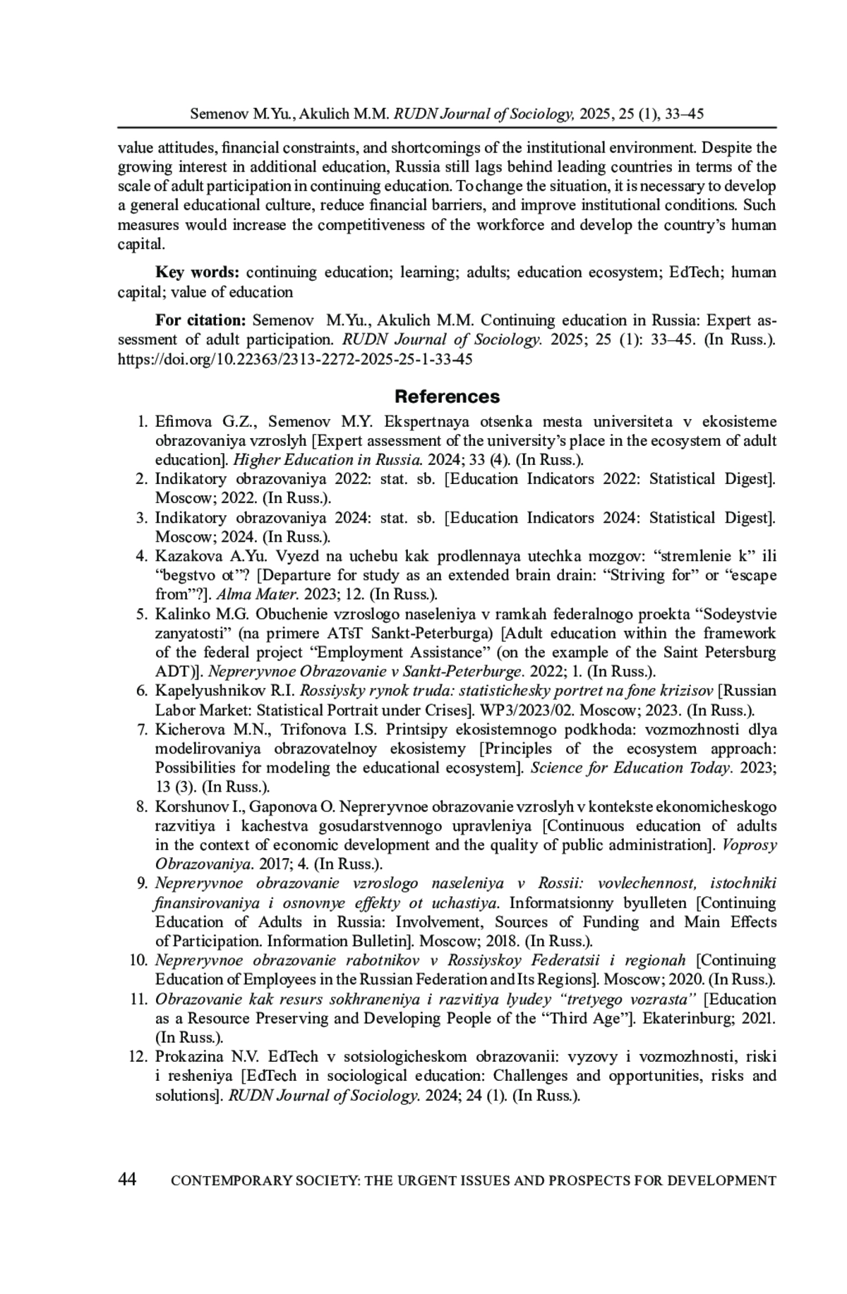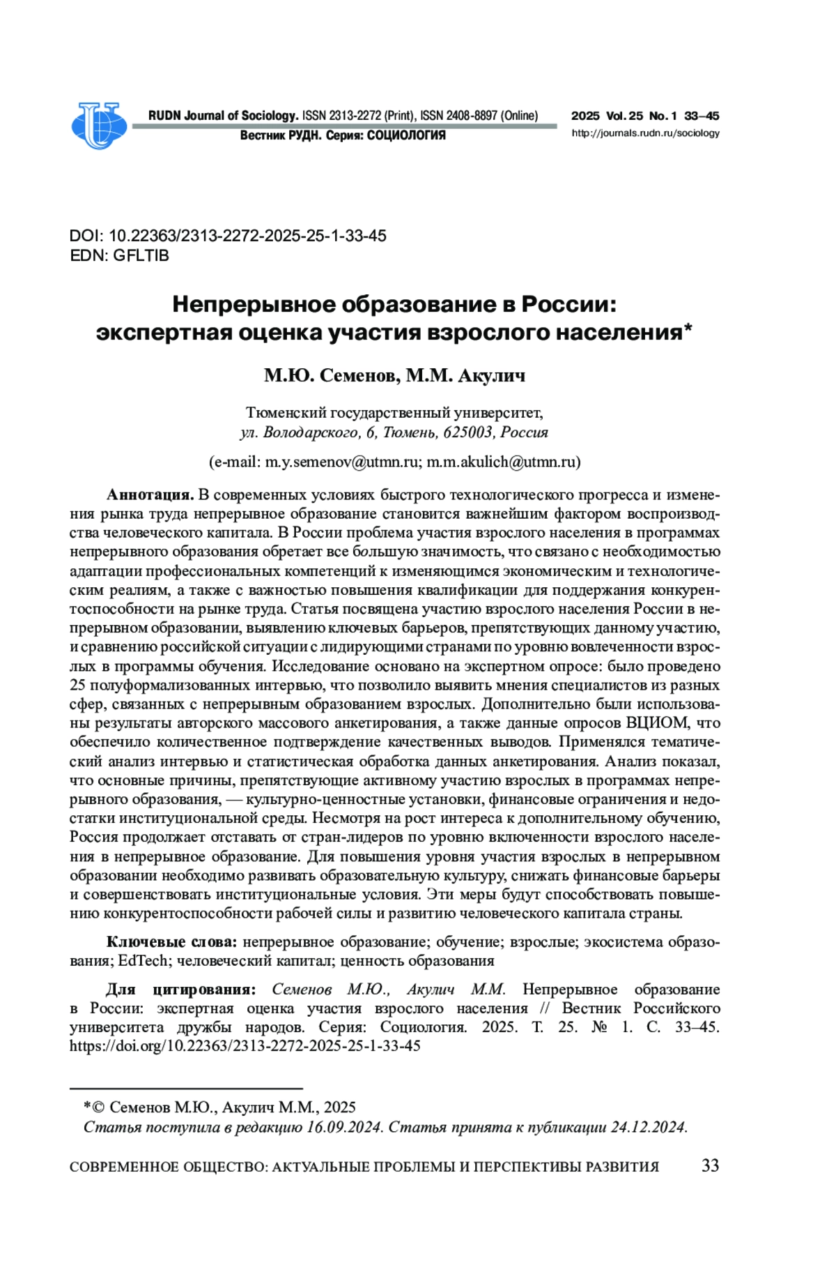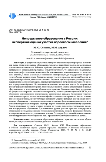 СЕМЁНОВ М. Ю., АКУЛИЧ М. М. НЕПРЕРЫВНОЕ ОБРАЗОВАНИЕ В РОССИИ: ЭКСПЕРТНАЯ ОЦЕНКА УЧАСТИЯ ВЗРОСЛОГО НАСЕЛЕНИЯ // ВЕСТНИК РОССИЙСКОГО УНИВЕРСИТЕТА ДРУЖБЫ НАРОДОВ. СЕРИЯ: СОЦИОЛОГИЯ. 2025. Т. 25 № 1