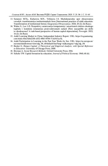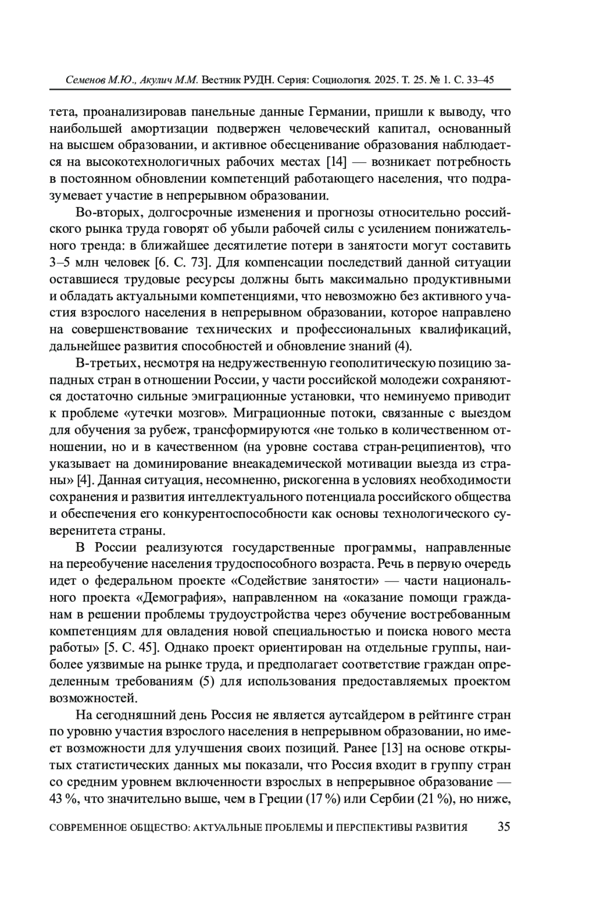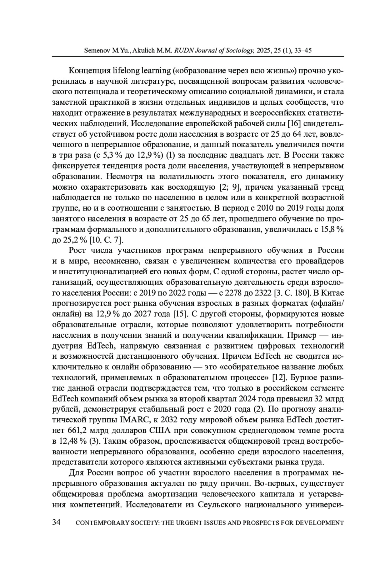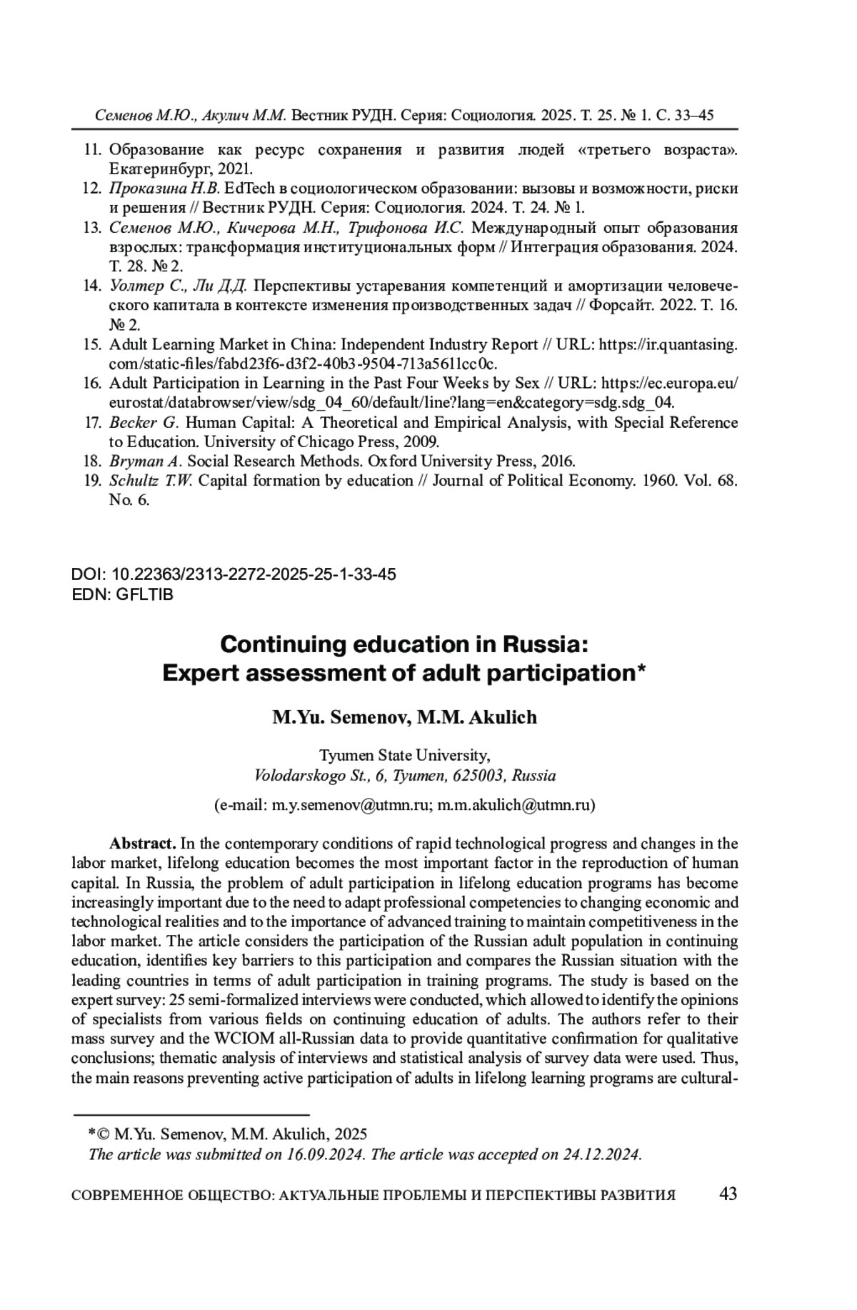 СЕМЁНОВ М. Ю., АКУЛИЧ М. М. НЕПРЕРЫВНОЕ ОБРАЗОВАНИЕ В РОССИИ: ЭКСПЕРТНАЯ ОЦЕНКА УЧАСТИЯ ВЗРОСЛОГО НАСЕЛЕНИЯ // ВЕСТНИК РОССИЙСКОГО УНИВЕРСИТЕТА ДРУЖБЫ НАРОДОВ. СЕРИЯ: СОЦИОЛОГИЯ. 2025. Т. 25 № 1