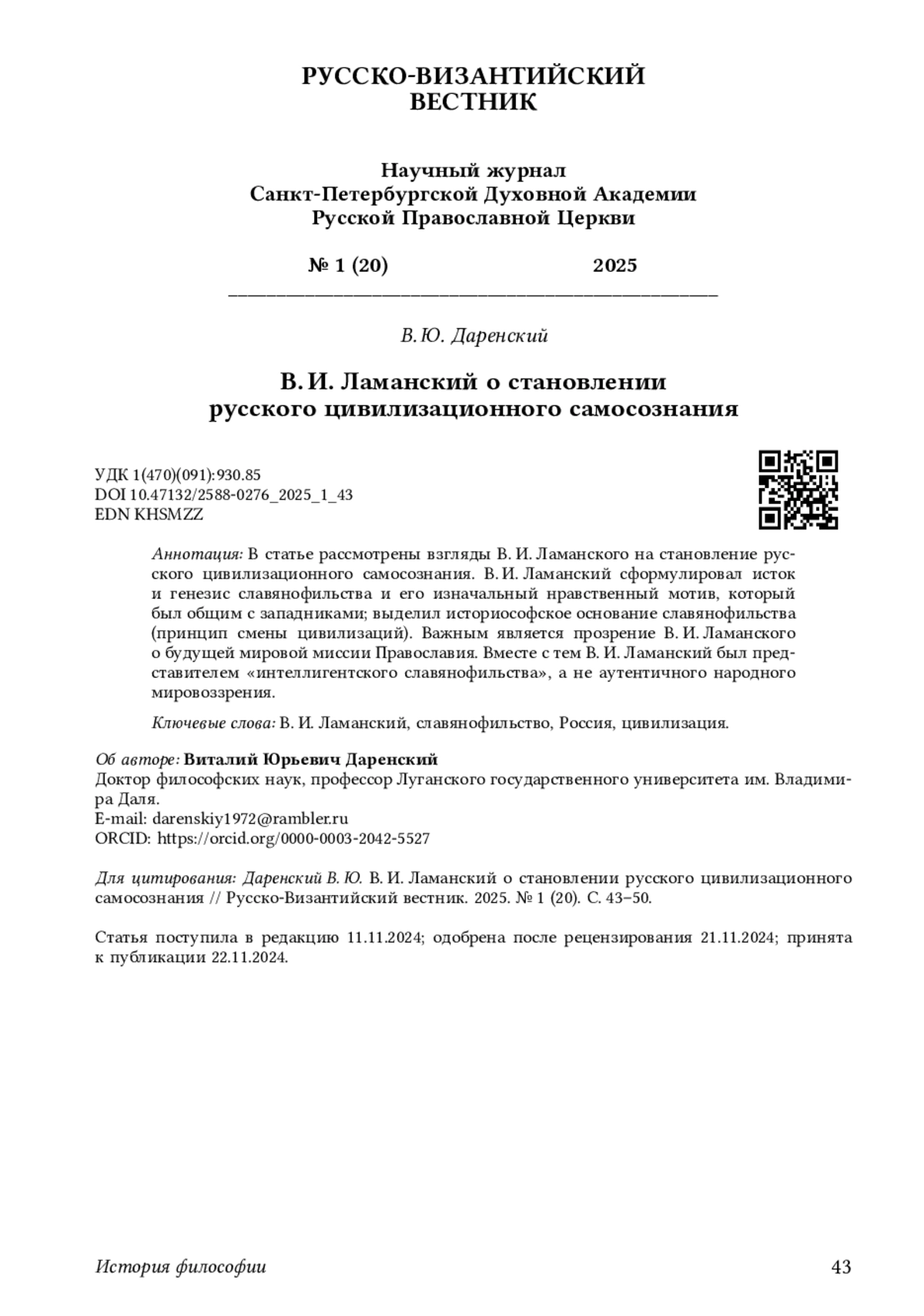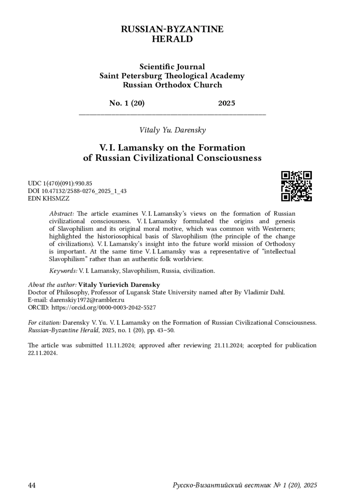 В статье рассмотрены взгляды В. И. Ламанского на становление русского цивилизационного самосознания. В. И. Ламанский сформулировал исток и генезис славянофильства и его изначальный нравственный мотив, который был общим с западниками; выделил историософское основание славянофильства (принцип смены цивилизаций). Важным является прозрение В. И. Ламанского о будущей мировой миссии Православия. Вместе с тем В. И. Ламанский был представителем «интеллигентского славянофильства», а не аутентичного народного мировоззрения.