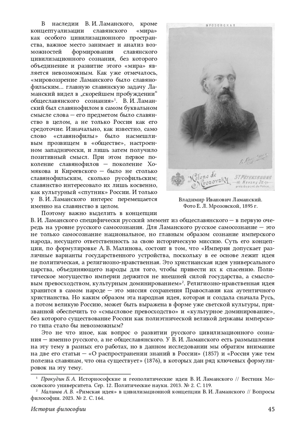 4. Малинов А. В. “Римская идея” в цивилизационной концепции В. И. Ламанского // Вопросы философии. 2023. № 2. С. 155-166. EDN: NTJIRY