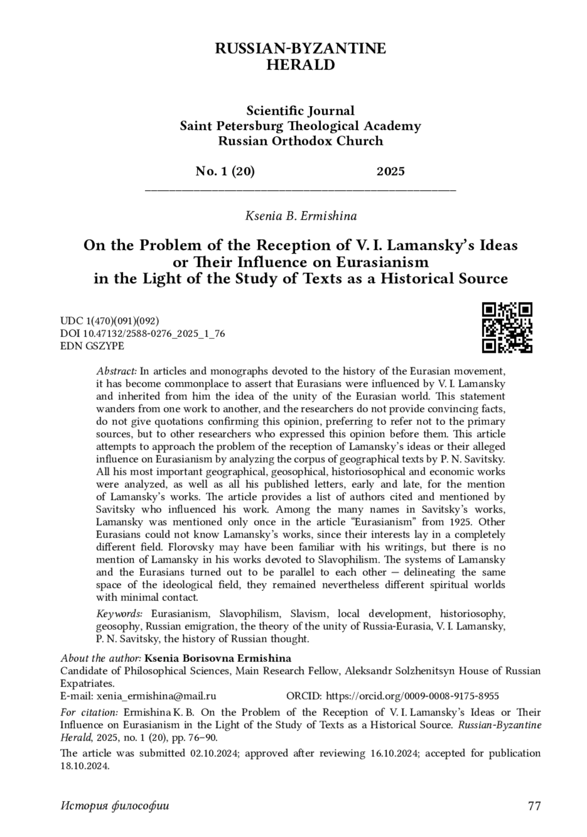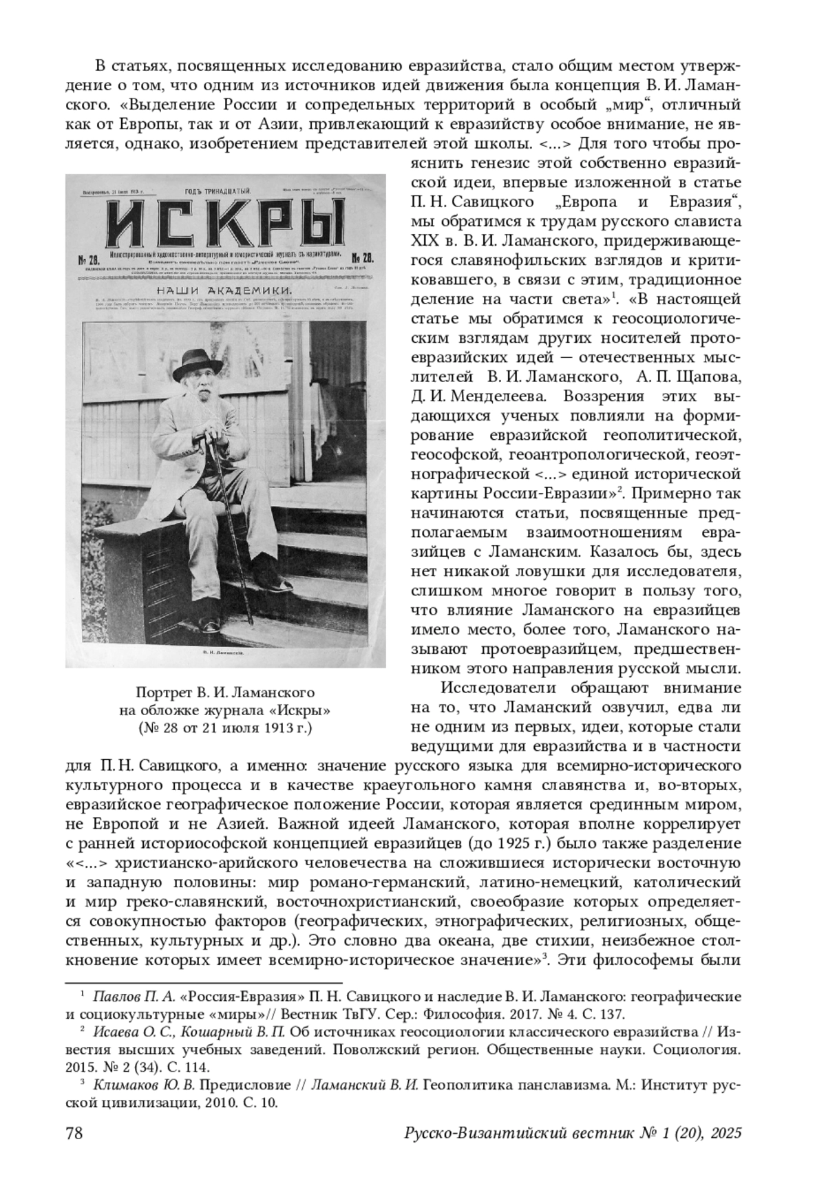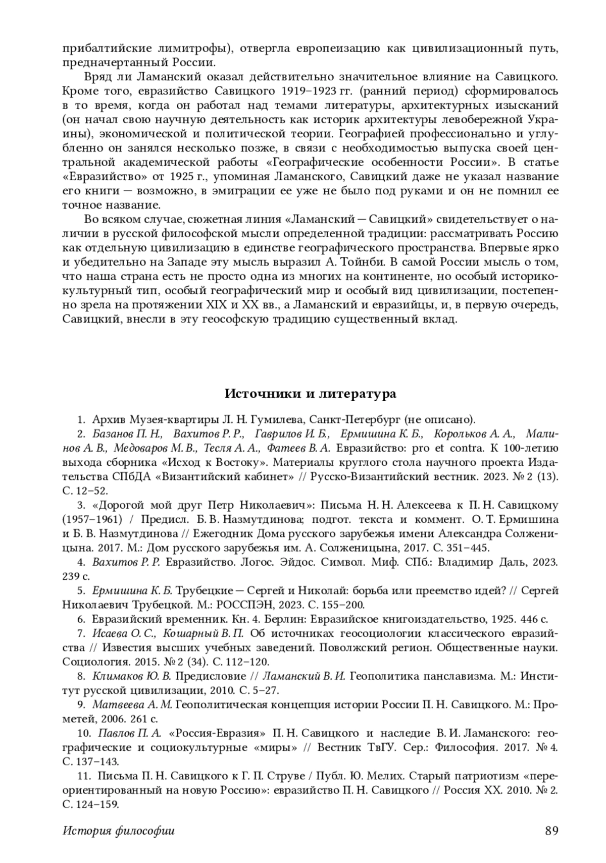 10. Павлов П. А. “Россия-Евразия” П. Н. Савицкого и наследие В. И. Ламанского: географические и социокультурные “миры” // Вестник ТвГУ. Сер.: Философия. 2017. № 4. С. 137-143.