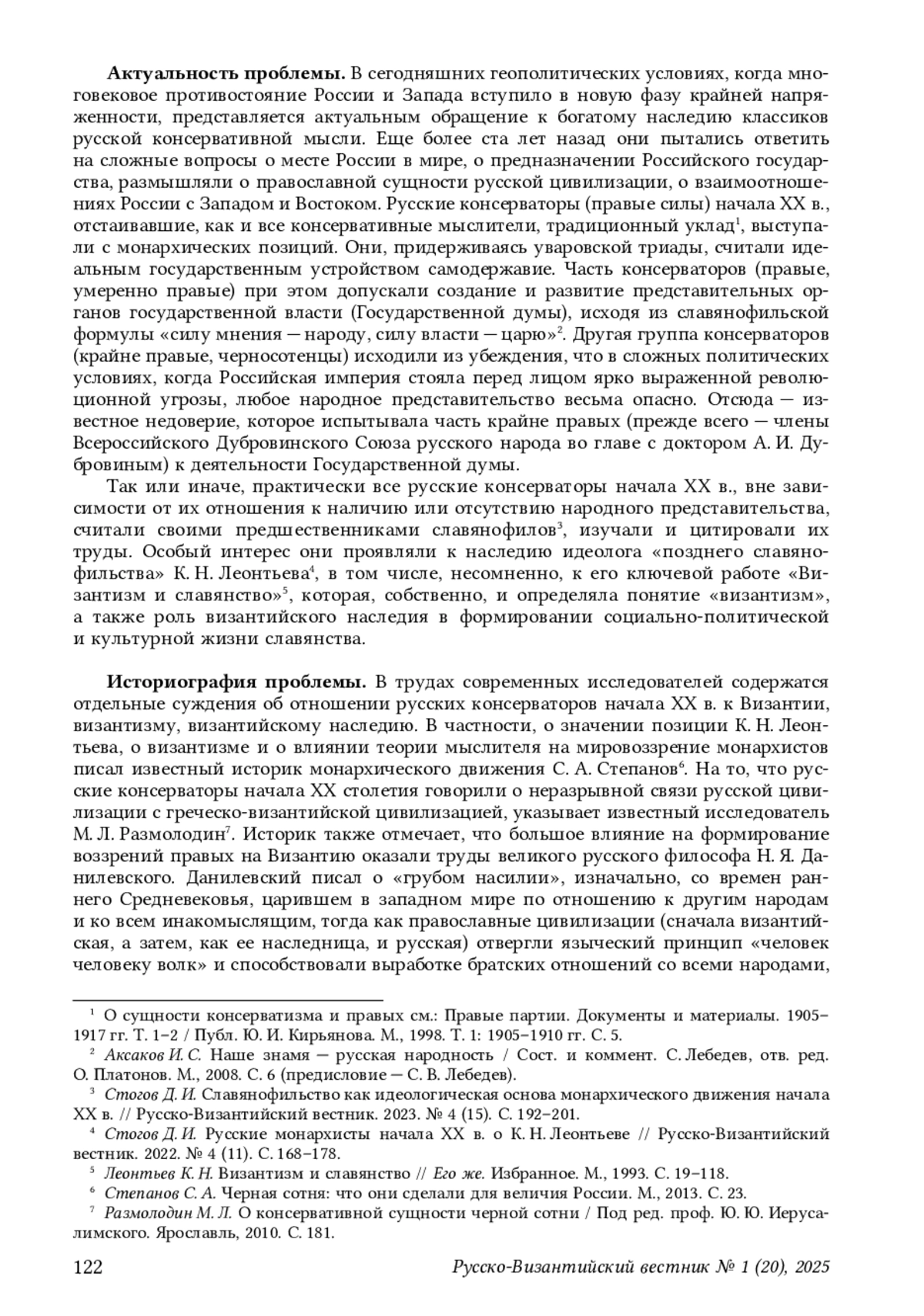 24. Стосов Д. И. Русские монархисты начала XX в. о К. Н. Леонтьеве // Русско-Византийский вестник. 2022. № 4 (11). С. 168-178. EDN: TAHKXX