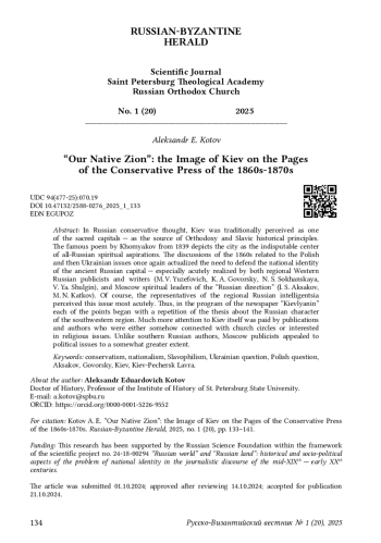 В русской консервативной мысли Киев традиционно занимал место одной из сакральных столиц — как источник православия и славянских исторических начал. Знаменитое хомяковское стихотворение 1839 г. рисует город как бесспорное средоточие общерусских духовных устремлений. Дискуссии 1860‑х гг., связанные с польским, а затем и украинским вопросами, вновь актуализировали необходимость отстаивания национальной принадлежности древнерусской столицы, осознаваемую как региональными западнорусскими публицистами и писателями (М. В. Юзефович, К. А. Говорский, Н. С. Соханская, В. Я. Шульгин), так и московскими духовными вождями «русского направления» (И. С. Аксаков, М. Н. Катков). Наиболее остро воспринимали этот вопрос, разумеется, представители региональной русской интеллигенции. Так, в программе газеты «Киевлянин» каждый из пунктов начинался с повторения тезиса о русском характере юго-западного края. Куда больше внимания собственно Киеву уделяли издания и авторы, либо так или иначе связанные с церковными кругами, либо интересовавшиеся религиозной проблематикой. В отличие от южнорусских авторов, московские публицисты в несколько большей степени апеллировали к политической проблематике.