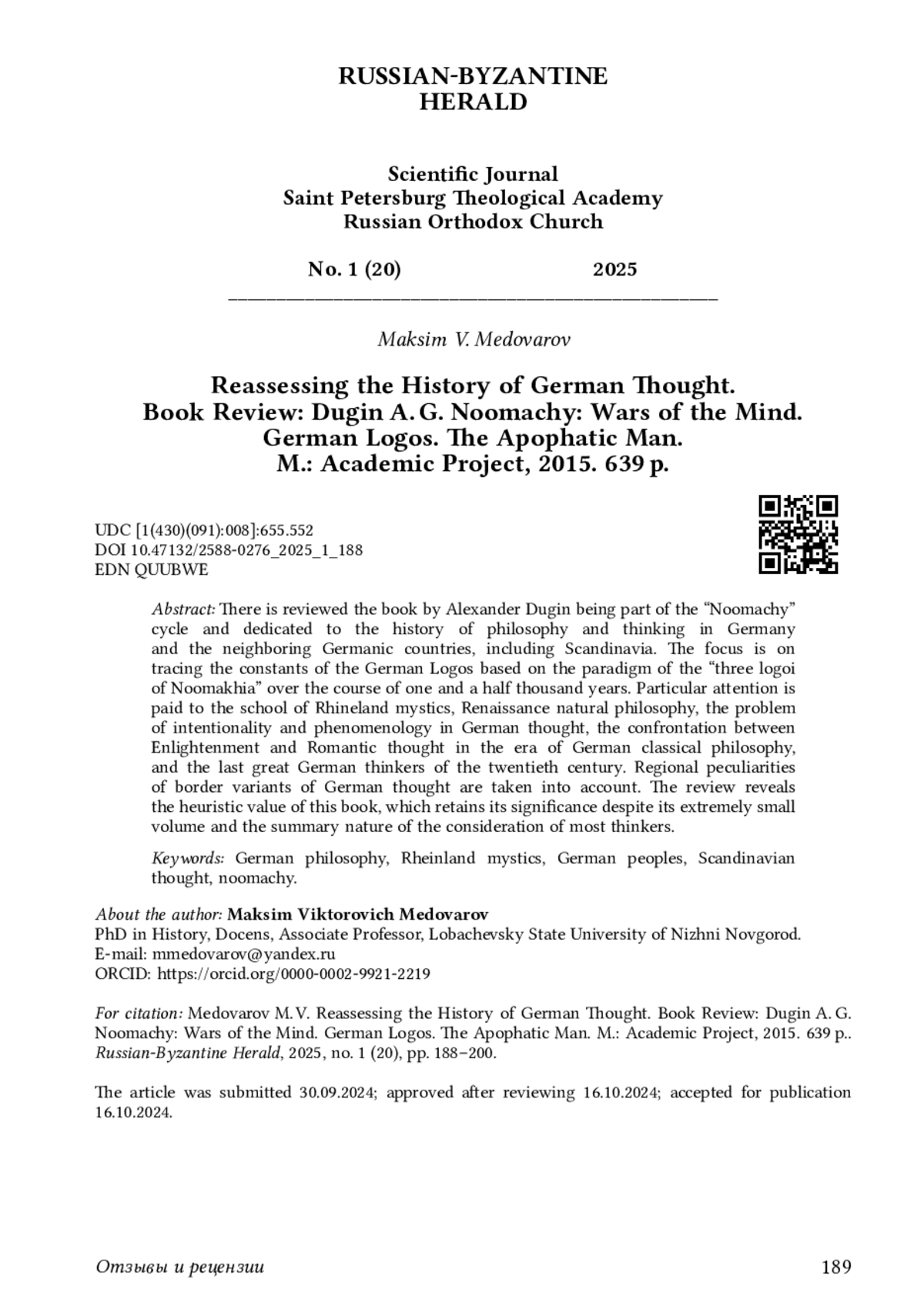 МЕДОВАРОВ М. В. ПЕРЕОЦЕНКА ИСТОРИИ НЕМЕЦКОЙ МЫСЛИ. РЕЦЕНЗИЯ НА КНИГУ: ДУГИН А. Г. НООМАХИЯ: ВОЙНЫ УМА. ГЕРМАНСКИЙ ЛОГОС. ЧЕЛОВЕК АПОФАТИЧЕСКИЙ. М.: АКАДЕМИЧЕСКИЙ ПРОЕКТ, 2015. 639 С. // РУССКО-ВИЗАНТИЙСКИЙ ВЕСТНИК. 2025. № 1 (20)