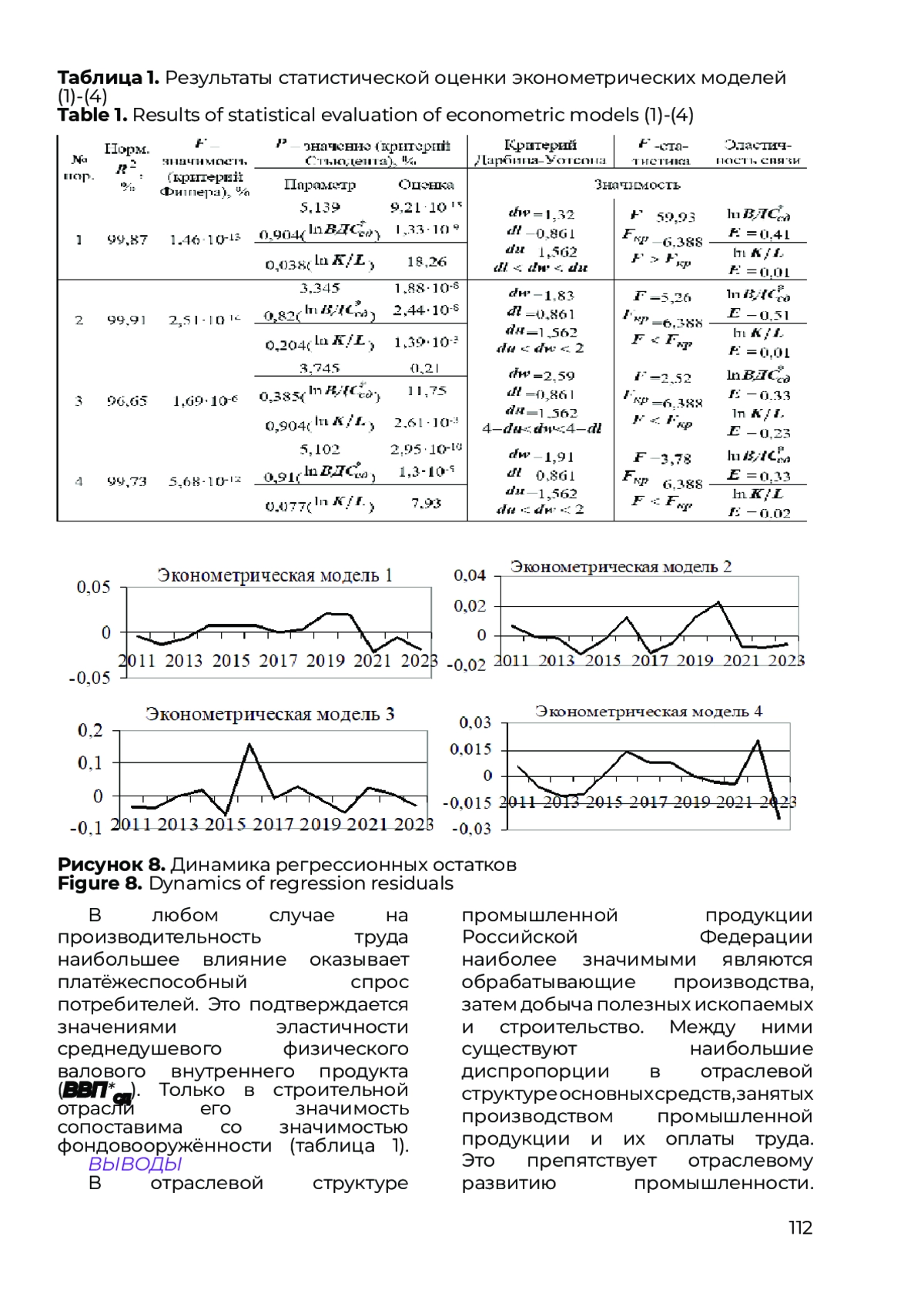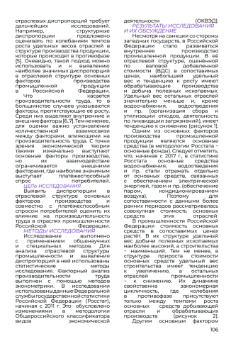Определено, что в производстве промышленной продукции наиболее значимыми являются обрабатывающие отрасли, затем добывающие, а потом строительная отрасль. Между ними возникают наибольшие диспропорции в отраслевой структуре основных факторов производства и оплате труда. Выявлено, что в обрабатывающей отрасли производительность труда одна из самых низких после строительства, а влияние научно-технического прогресса во всех отраслях промышленности незначительно. Обосновано, что наиболее значимым фактором, ограничивающим рост производительности труда, является платёжеспособный спрос потребителей. Исключение составляет строительная отрасль, где наравне с ним значимой является фондоотдача.