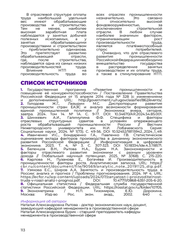 15. Karlova, N., Puzanova, E., Bogacheva, I. Productivity in industry: growth factors. Analytical note. URL: https://cbr.ru/content/document/file/90569/analytic_note_20191125_dip.pdf.(In Russ.).