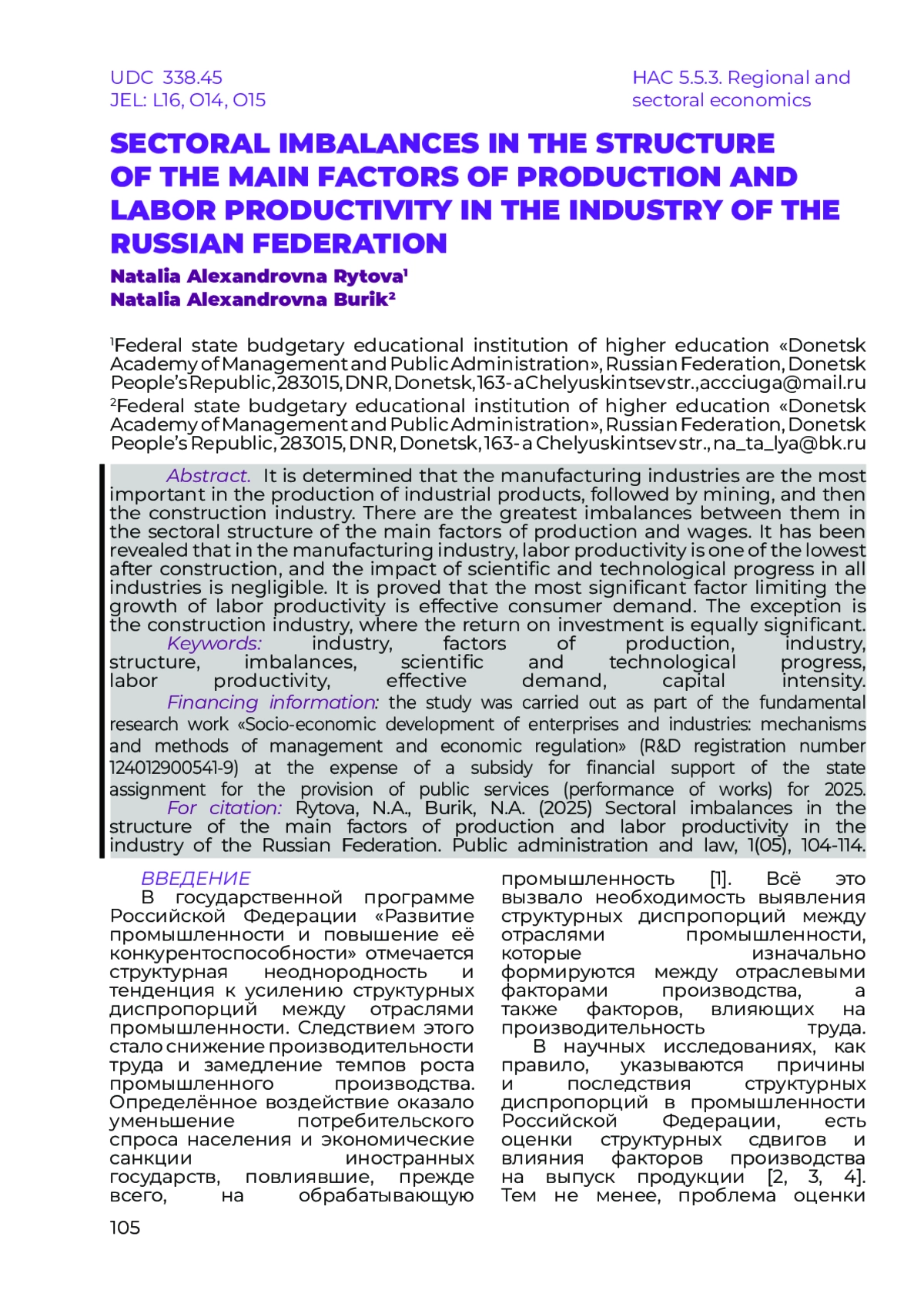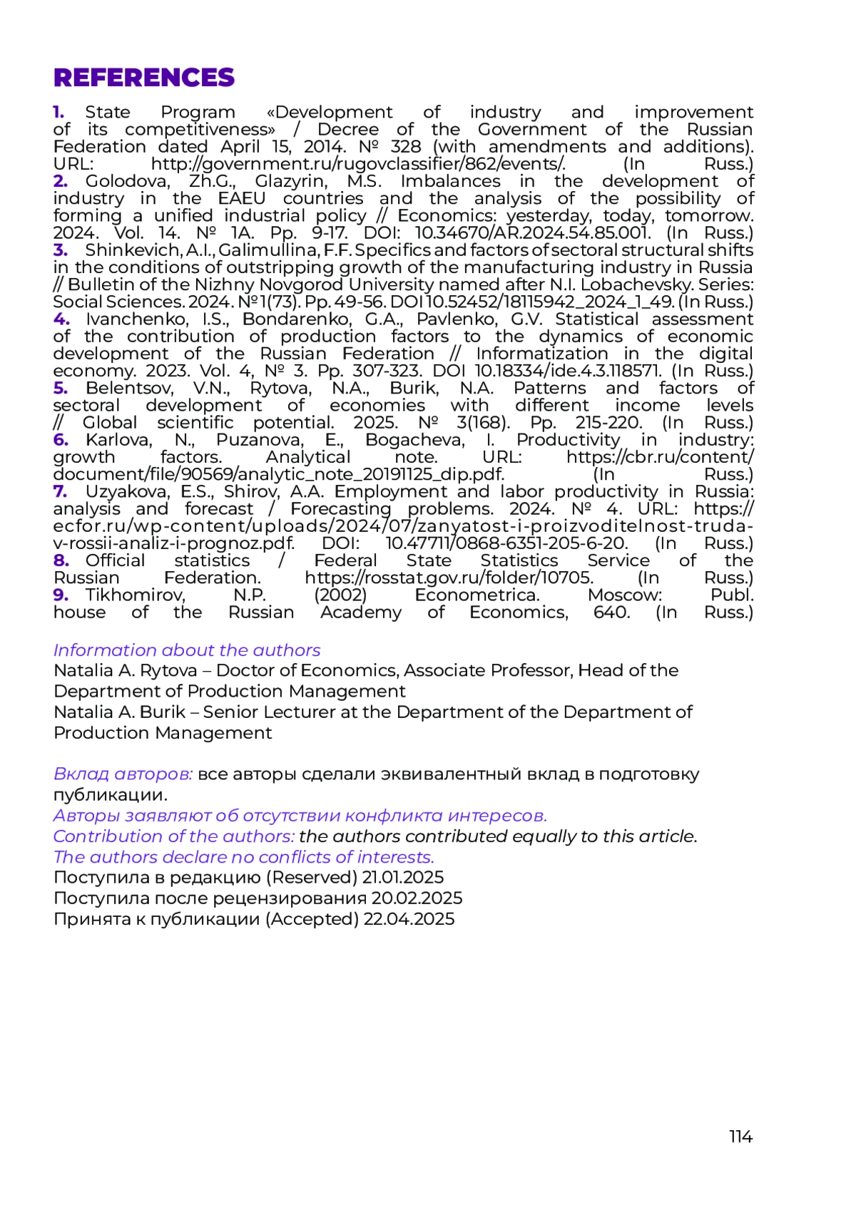 14. Belentsov, V.N., Rytova, N.A., Burik, N.A. Patterns and factors of sectoral development of economies with different income levels // Global scientific potential. 2025. № 3(168). Pp. 215-220. (In Russ.).