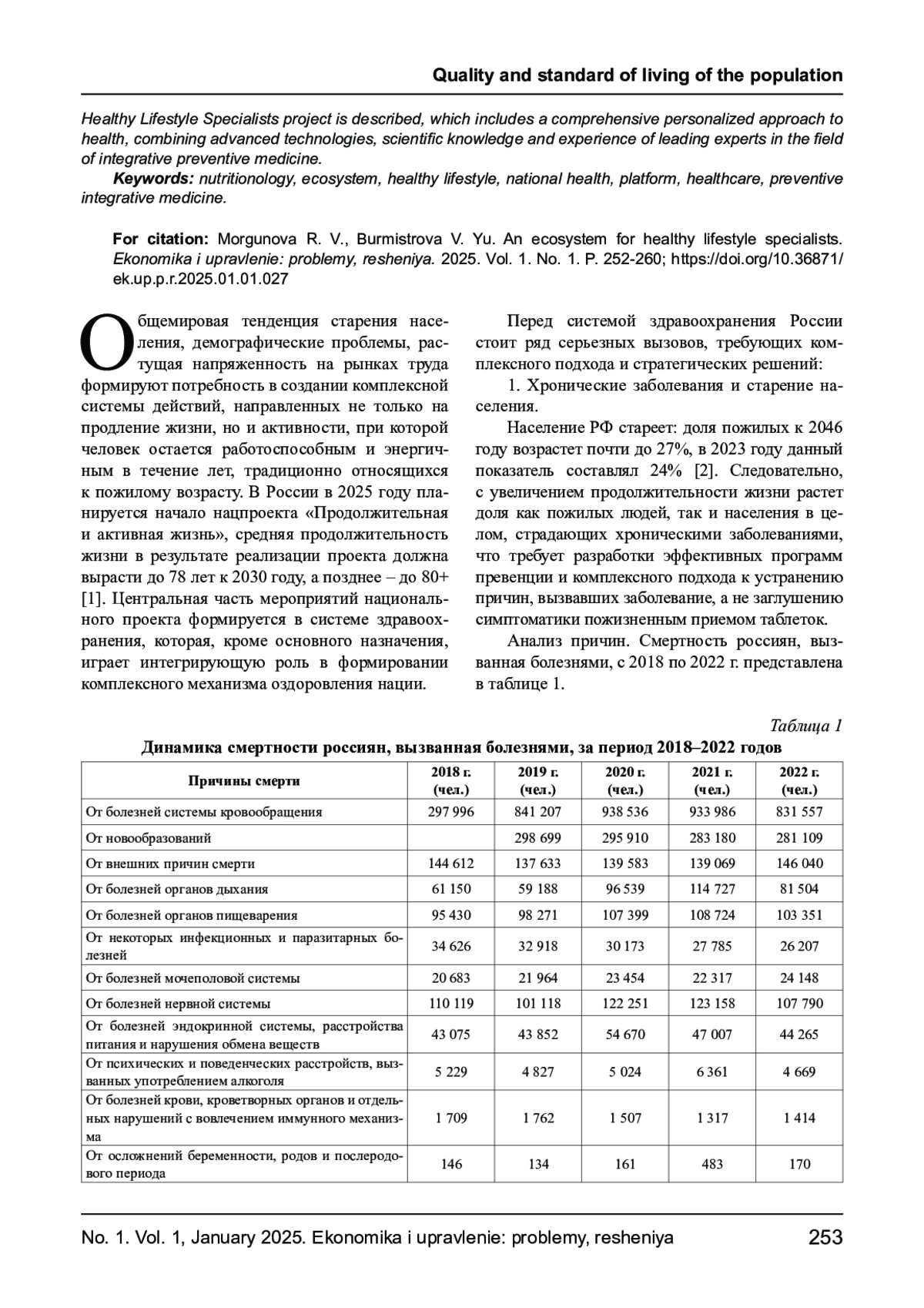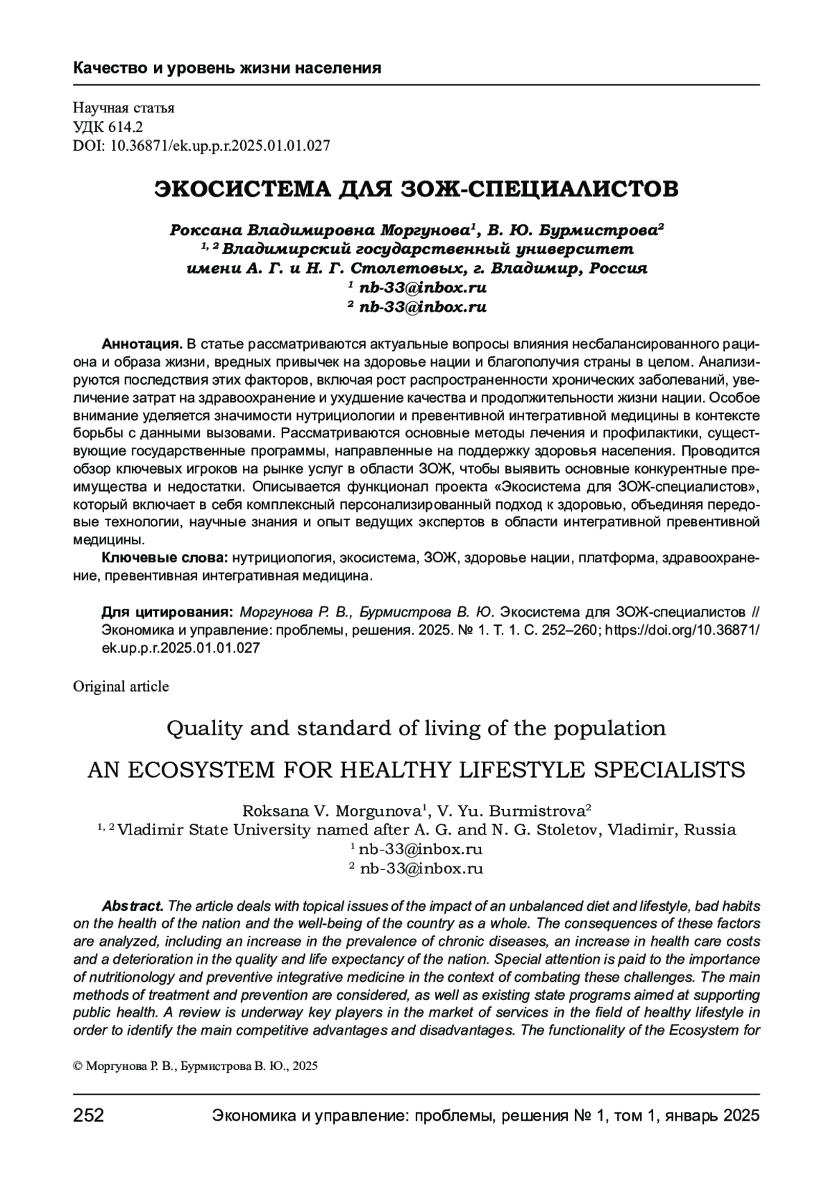 МОРГУНОВА Р. В., БУРМИСТРОВА В. Ю. ЭКОСИСТЕМА ДЛЯ ЗОЖ-СПЕЦИАЛИСТОВ // ЭКОНОМИКА И УПРАВЛЕНИЕ: ПРОБЛЕМЫ, РЕШЕНИЯ. 2025. ТОМ 1 № 1