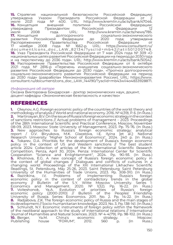 21. Martirosyan, B.V. On the issue of Russia’s foreign economic strategy in the context of sanctions restrictions // Actual problems of management - 2023: Proceedings of the 28th International Scientific and Practical Conference, Moscow, November 08-09, 2023. Moscow: State University of Management, 2023. Pp. 75-76. (In Russ.).
