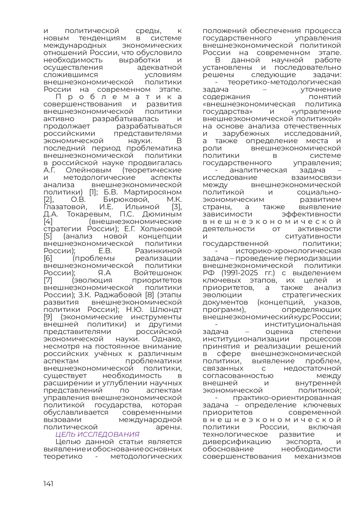 25. Razinkina, I.V. Problems of implementing Russia’s foreign economic policy in the context of contradictory trends in the global economy // Bulletin of the S.Y. Witte Moscow University. Series 1: Economics and Management. 2020. № 1(32). Pp. 16-22. (In Russ.).