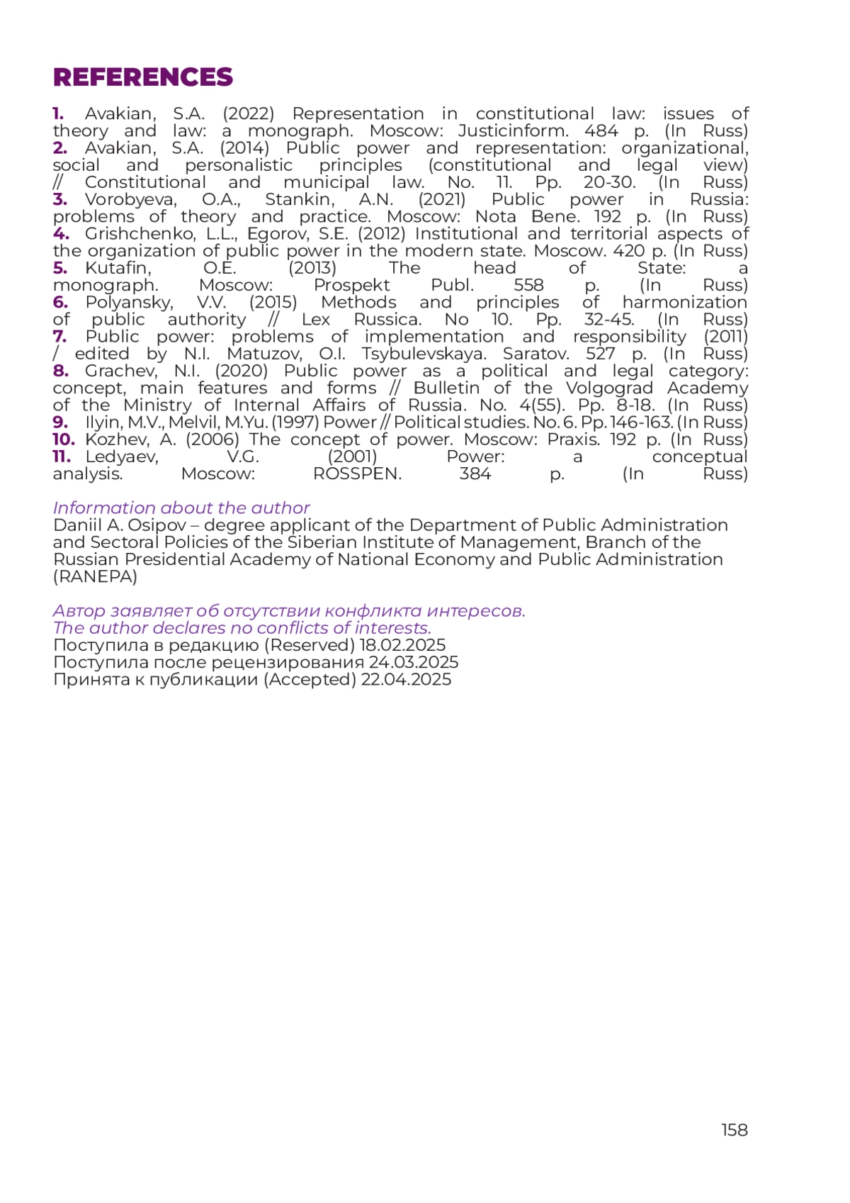 2. Авакьян С.А. Публичная власть и представительство: организационные, социальные и персоналистские начала (конституционно-правовой взгляд) // Конституционное и муниципальное право. 2014. № 11. С. 20-30.