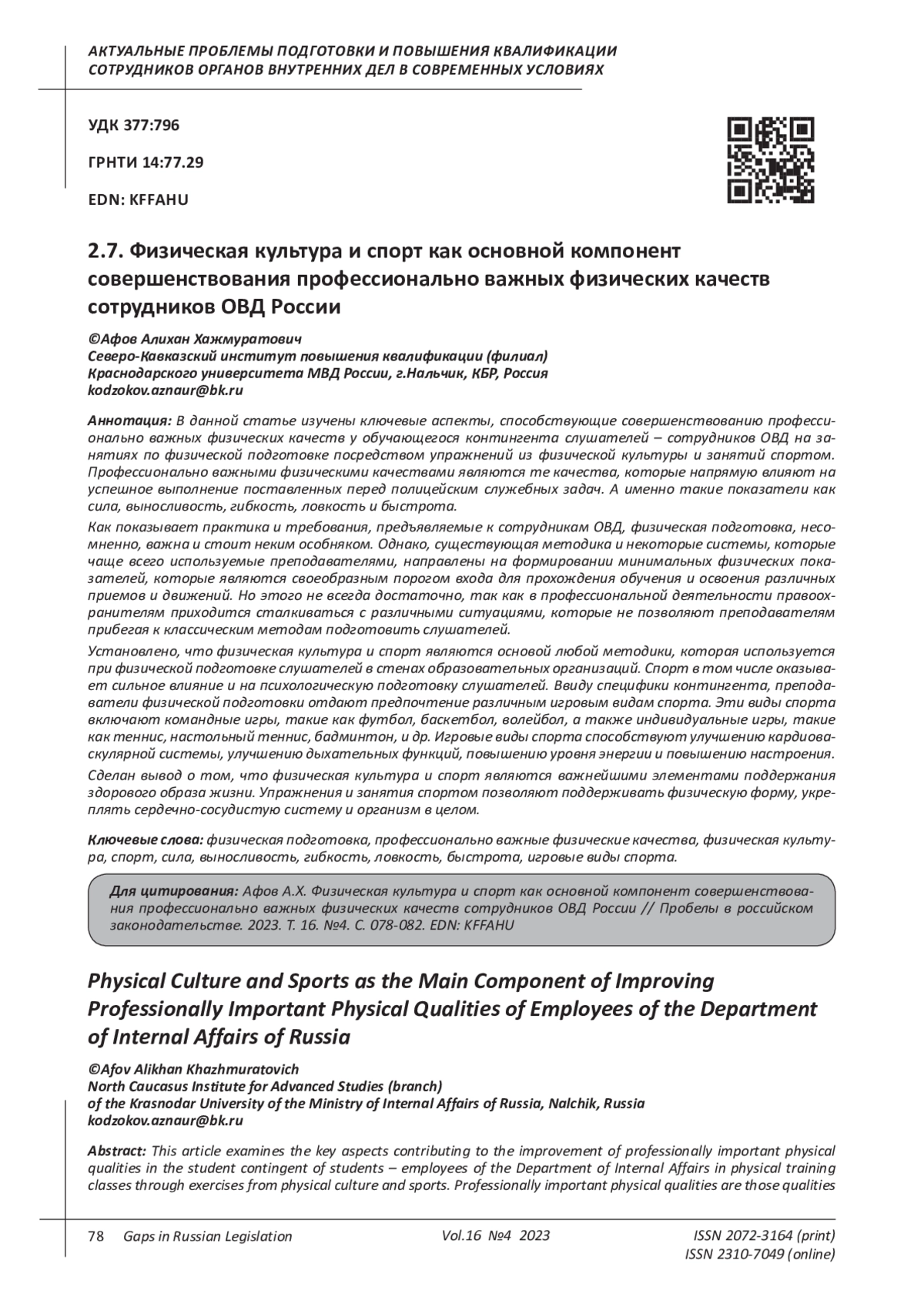 4. Кодзоков А.Х., Доттуев Т.И., Бештоев Р.О. Формирование профессионально значимых физических качеств у сотрудников органов внутренних дел // Индустриальная экономика. 2021. Т. 2. № 4. С. 153-158. EDN: SRURXO