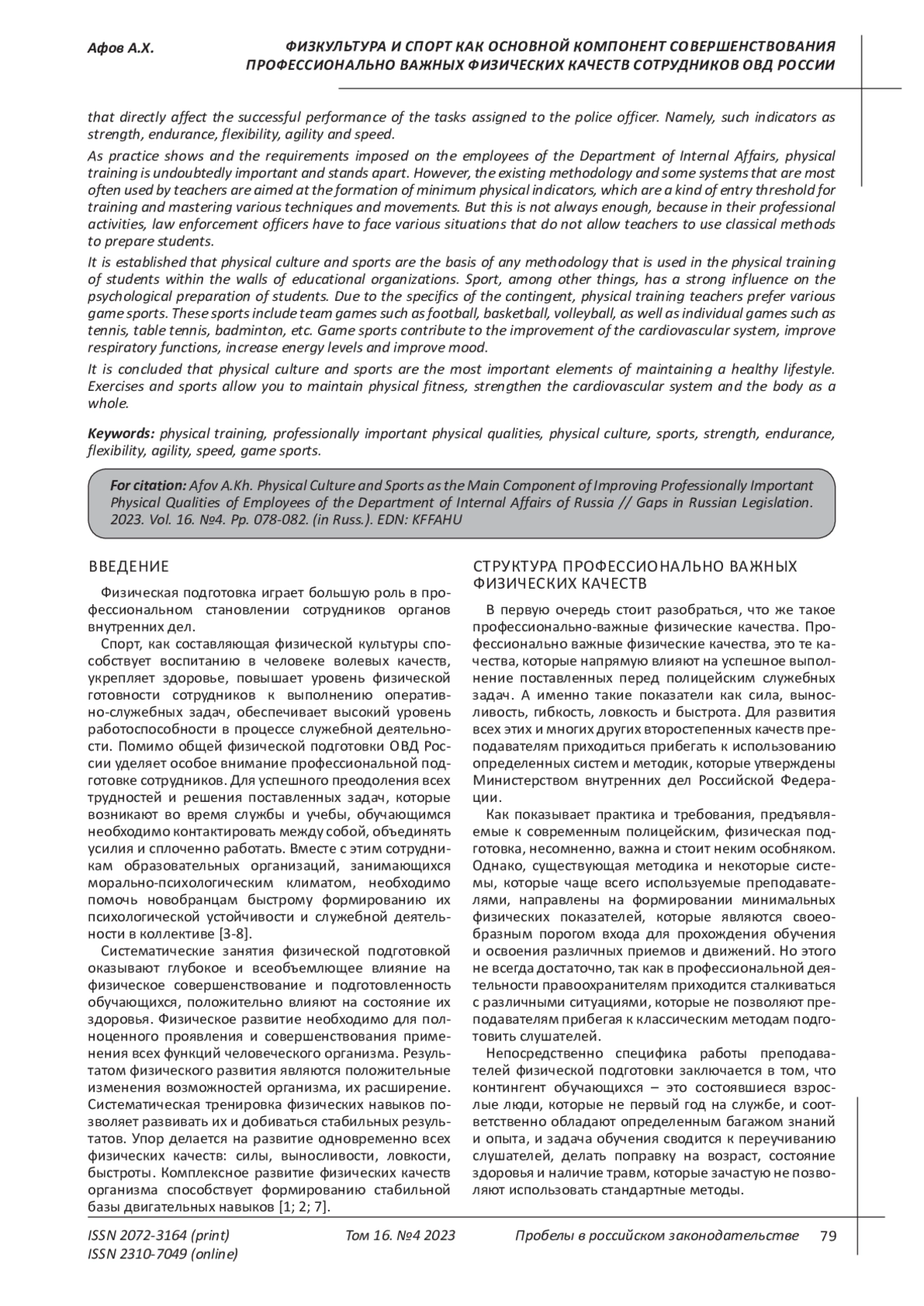 Krymshokalov A.Z., Tkhazeplov R.L. Actual problems of formation of professionally important physical qualities in police officers // In the collection: The best pedagogical work of 2021. Collection of articles of the International Research Competition. Penza, 2021. pp. 124-127.