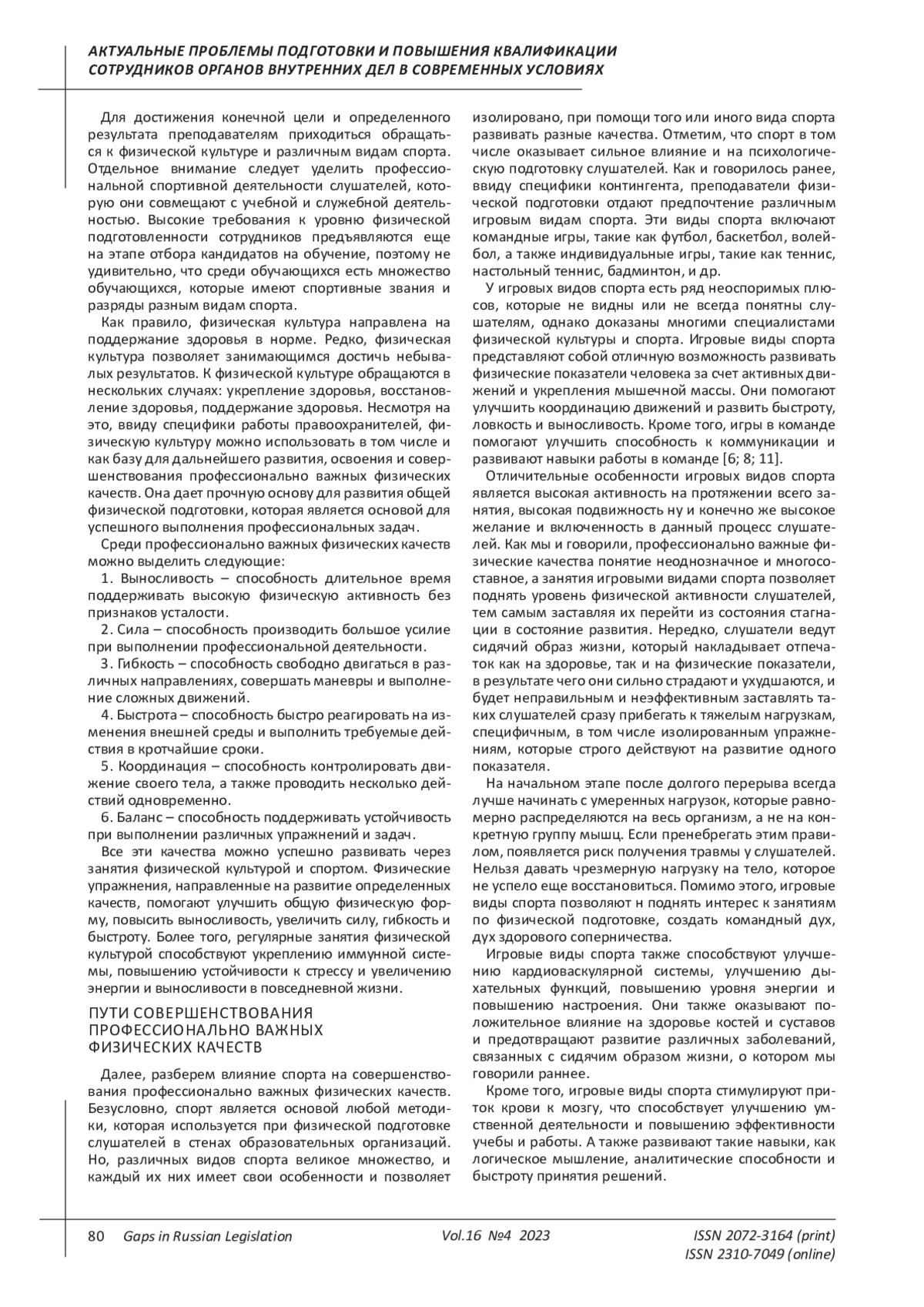 В данной статье изучены ключевые аспекты, способствующие совершенствованию профессионально важных физических качеств у обучающегося контингента слушателей - сотрудников ОВД на занятиях по физической подготовке посредством упражнений из физической культуры и занятий спортом. Профессионально важными физическими качествами являются те качества, которые напрямую влияют на успешное выполнение поставленных перед полицейским служебных задач. А именно такие показатели как сила, выносливость, гибкость, ловкость и быстрота. Как показывает практика и требования, предъявляемые к сотрудникам ОВД, физическая подготовка, несомненно, важна и стоит неким особняком. Однако, существующая методика и некоторые системы, которые чаще всего используемые преподавателями, направлены на формировании минимальных физических показателей, которые являются своеобразным порогом входа для прохождения обучения и освоения различных приемов и движений. Но этого не всегда достаточно, так как в профессиональной деятельности правоохранителям приходится сталкиваться с различными ситуациями, которые не позволяют преподавателям прибегая к классическим методам подготовить слушателей. Установлено, что физическая культура и спорт являются основой любой методики, которая используется при физической подготовке слушателей в стенах образовательных организаций. Спорт в том числе оказывает сильное влияние и на психологическую подготовку слушателей. Ввиду специфики контингента, преподаватели физической подготовки отдают предпочтение различным игровым видам спорта. Эти виды спорта включают командные игры, такие как футбол, баскетбол, волейбол, а также индивидуальные игры, такие как теннис, настольный теннис, бадминтон, и др. Игровые виды спорта способствуют улучшению кардиоваскулярной системы, улучшению дыхательных функций, повышению уровня энергии и повышению настроения. Сделан вывод о том, что физическая культура и спорт являются важнейшими элементами поддержания здорового образа жизни. Упражнения и занятия спортом позволяют поддерживать физическую форму, укреплять сердечно-сосудистую систему и организм в целом.