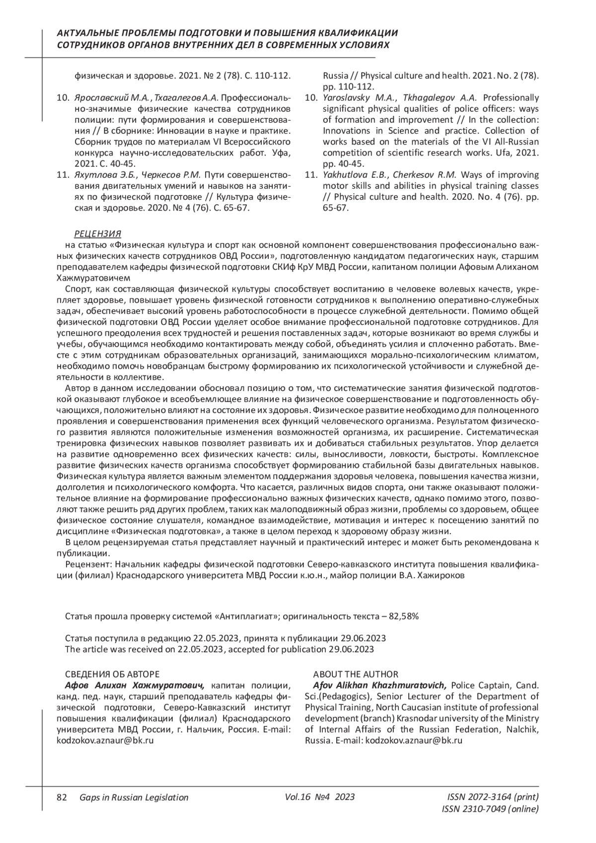 10. Ярославский М.А., Тхагалегов А.А. Профессионально-значимые физические качества сотрудников полиции: пути формирования и совершенствования // В сборнике: Инновации в науке и практике. Сборник трудов по материалам VI Всероссийского конкурса научно-исследовательских работ. Уфа, 2021. С. 40-45. EDN: EUXLHX