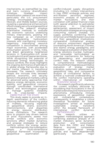 В данном исследовании анализируется влияние конфликтогенных факторов на международный рынок нефти, включая геополитическую напряженность, экономические зависимости и цивилизационные различия в распределении энергоресурсов. Рассматривается, как геополитические конфликты (например, войны, санкции) и экономическая политика (например, доминирование нефтедоллара) определяют волатильность цен на нефть и глобальную энергетическую безопасность. Вводится цивилизационный подход для анализа конкуренции между североамериканской, китайской, исламской и другими цивилизациями за контроль над нефтяными ресурсами. Используются статистический анализ, историко-логические методы и экономическое моделирование для оценки последствий военных интервенций (например, вторжение США в Ирак) и стратегий диверсификации энергопоставок. Результаты показывают, что нестабильность нефтяного рынка обусловлена глубинными геополитическими и цивилизационными противоречиями, что требует многостороннего сотрудничества и внедрения инновационных технологий (например, ВИЭ, ядерная энергетика) для снижения конфликтного потенциала.