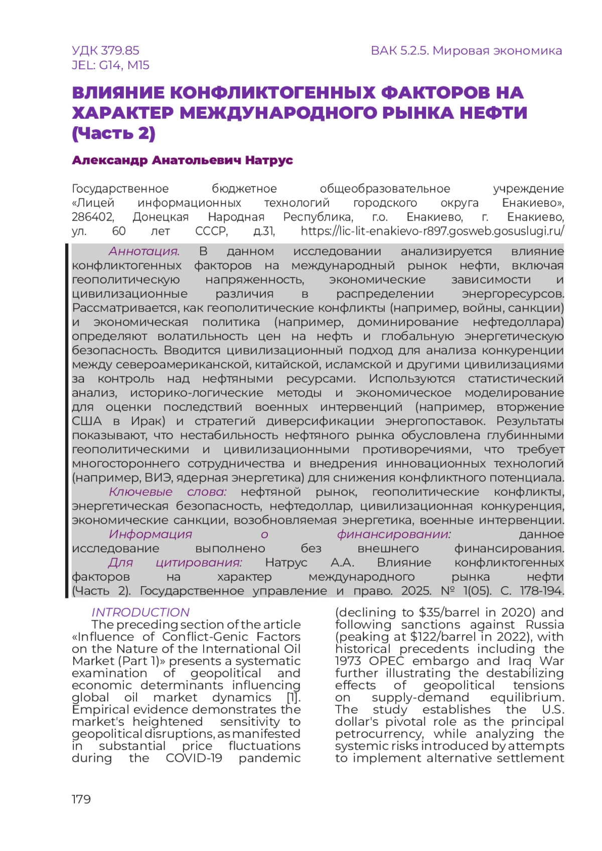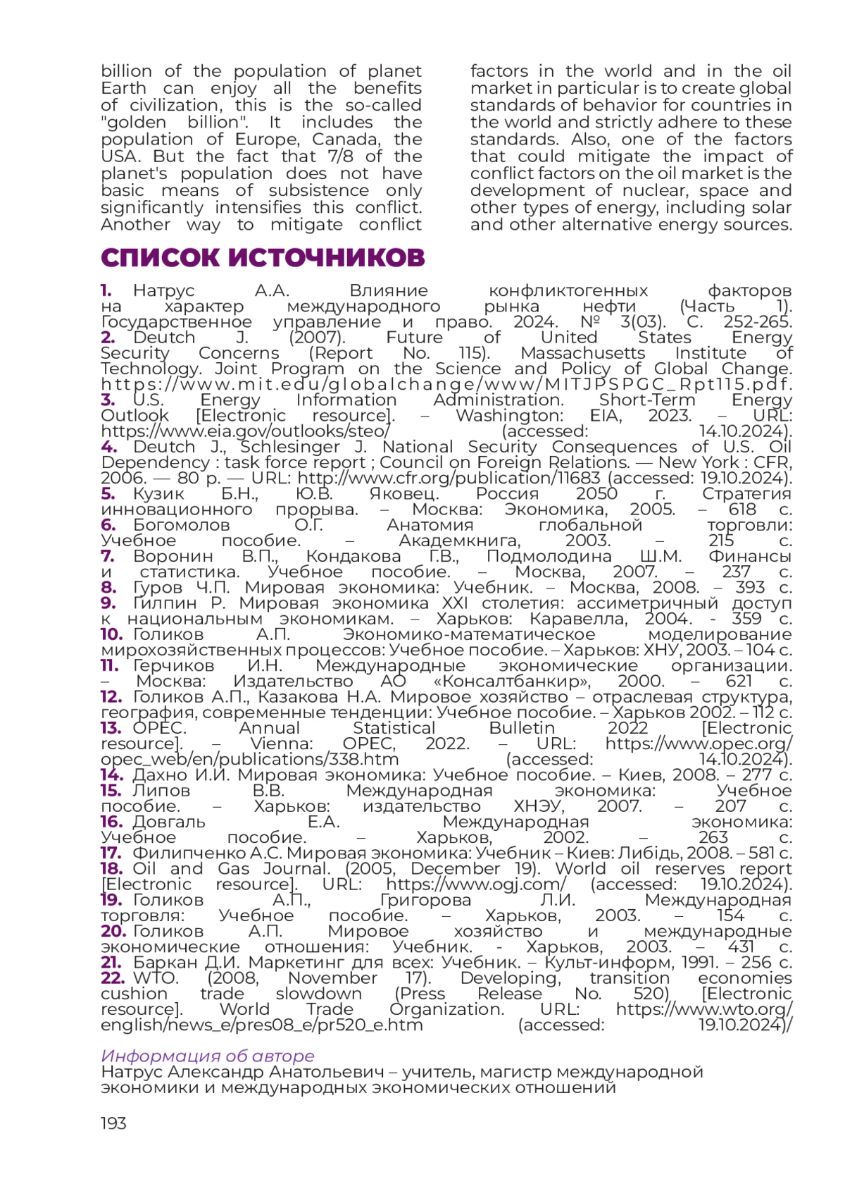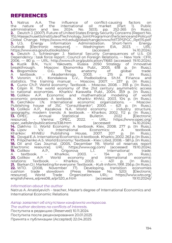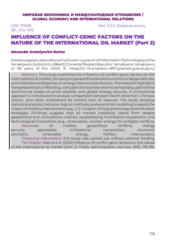 1. Натрус А.А. Влияние конфликтогенных факторов на характер международного рынка нефти (Часть 1). Государственное управление и право. 2024. № 3(03). С. 252-265.