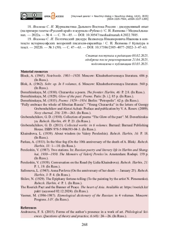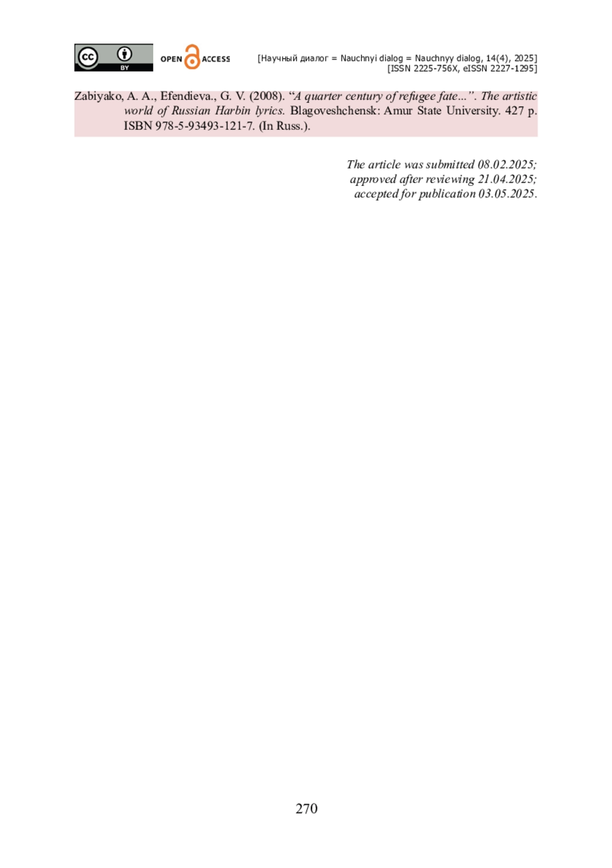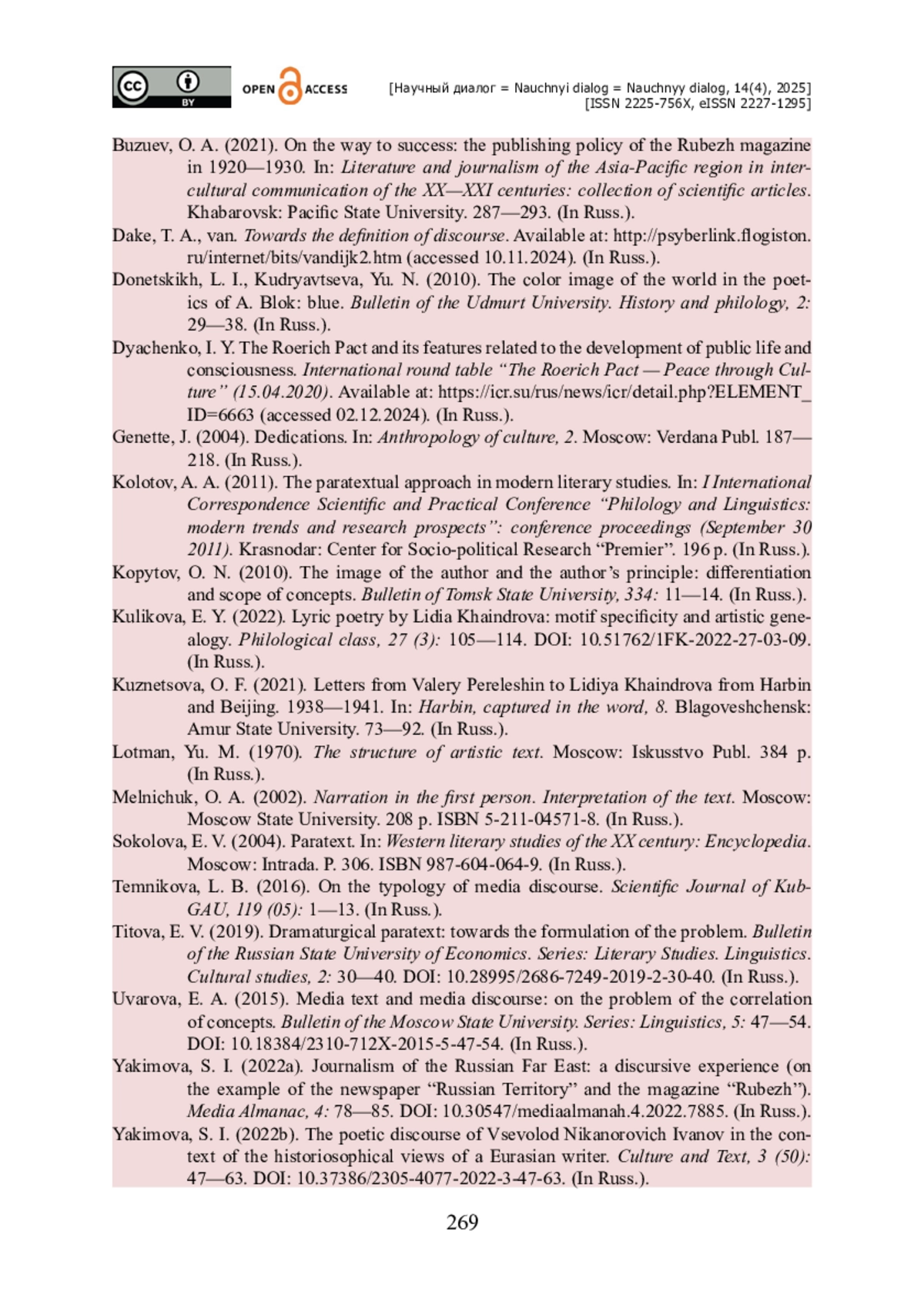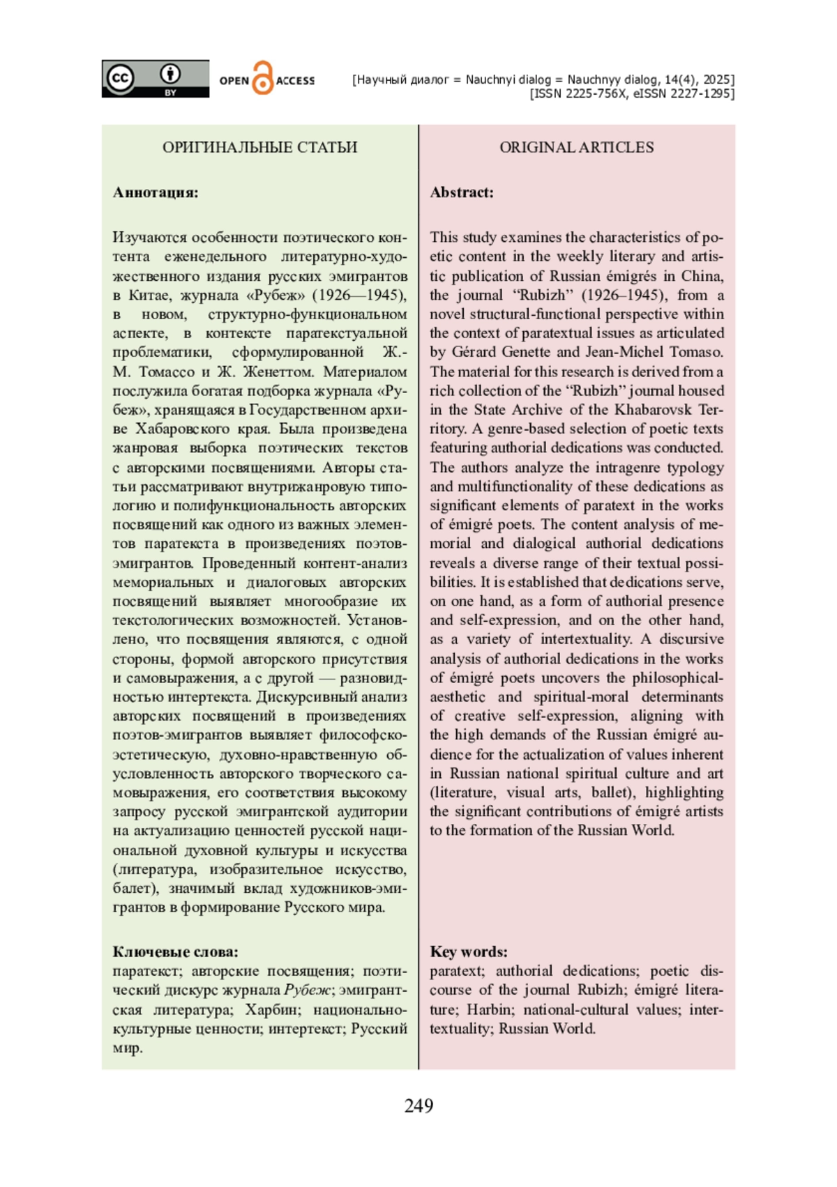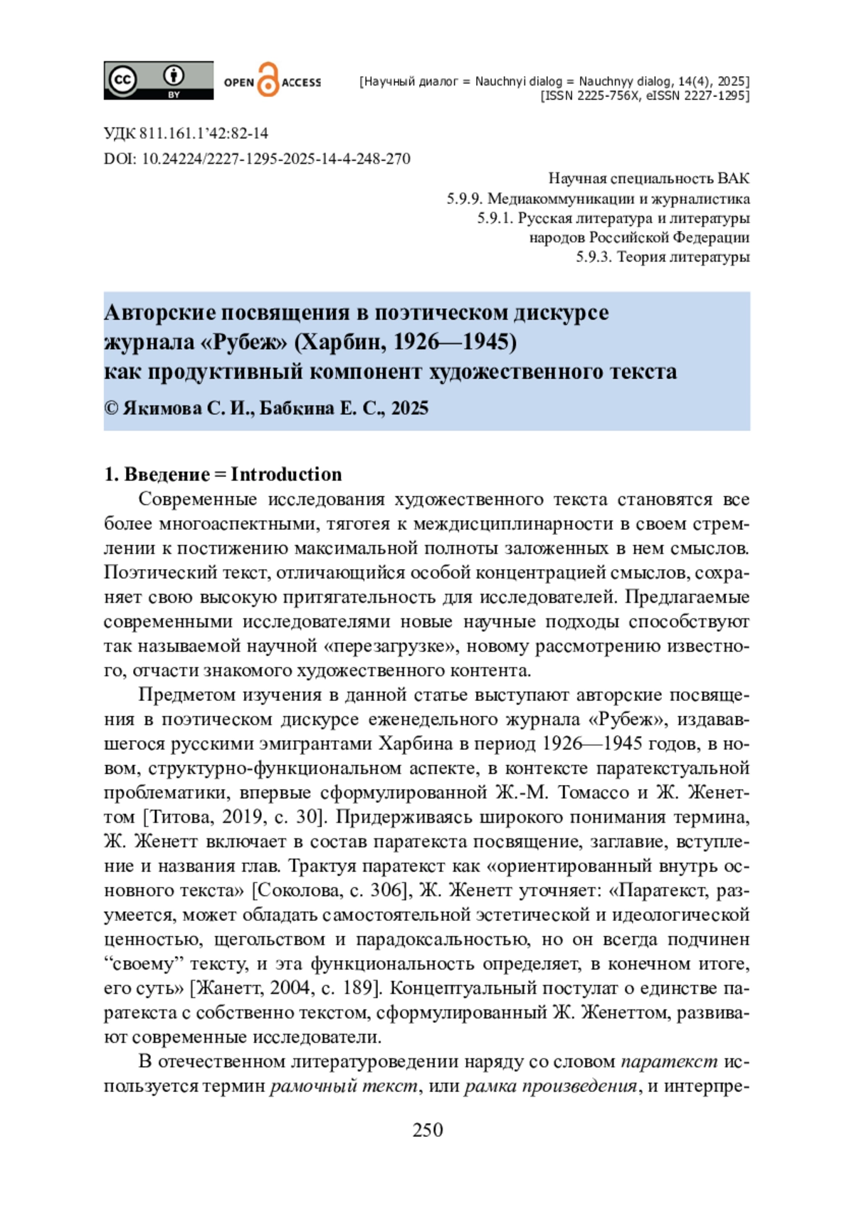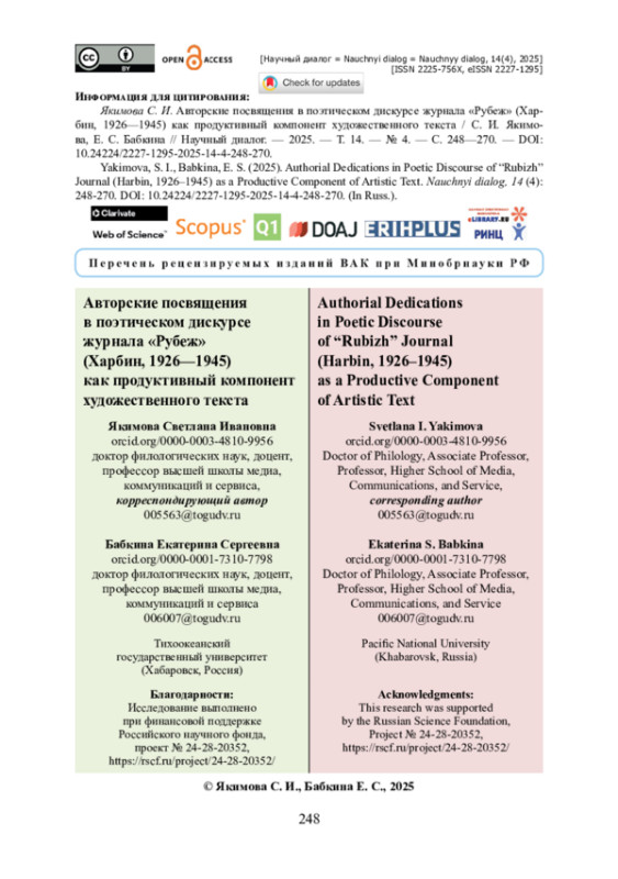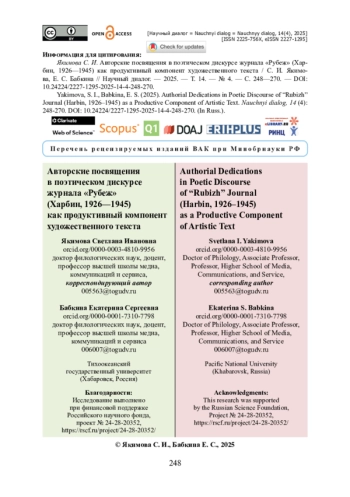 ЯКИМОВА С. И., БАБКИНА Е. С. АВТОРСКИЕ ПОСВЯЩЕНИЯ В ПОЭТИЧЕСКОМ ДИСКУРСЕ ЖУРНАЛА «РУБЕЖ» (ХАРБИН, 1926—1945) КАК ПРОДУКТИВНЫЙ КОМПОНЕНТ ХУДОЖЕСТВЕННОГО ТЕКСТА // НАУЧНЫЙ ДИАЛОГ. 2025. ТОМ 14, № 4