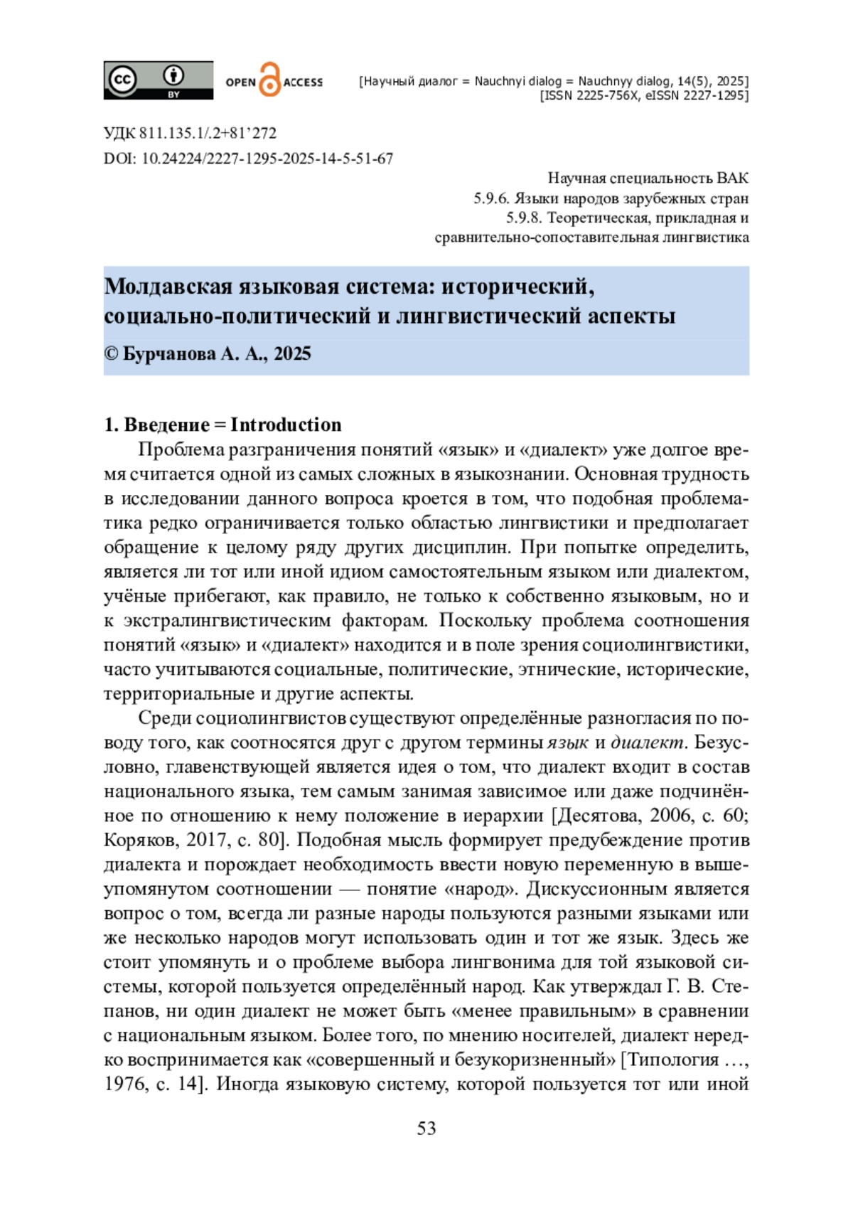 Настоящая статья посвящена статусу молдавской языковой системы по отношению к румынскому языку. В исследовании проведён комплексный анализ молдавского идиома в рамках исторического, социально-политического и лингвистического аспектов. В работе представлено развёрнутое описание истории становления и развития молдавского идиома, систематизированы точки зрения советских, молдавских и румынских лингвистов относительно его статуса. Особое внимание уделяется проблематике деактуализации лингвонима молдавский язык в Республике Молдова, при этом подчёркивается его сохранение в статистических документах Российской Федерации. Эмпирическую базу исследования составляют материалы социолингвистического интервьюирования, проведённого в 2024 году в городах Республики Крым среди представителей молдавского сообщества. Новизна работы заключается в том, что впервые осуществлено комплексное исследование статуса молдавского идиома с привлечением данных об оценке и идентификации родного языка, полученных в ходе опроса крымских молдаван. Делаются выводы о том, что молдавский идиом действительно имеет целый ряд специфических характеристик на фонетическом, лексико-семантическом и на грамматическом уровнях, а представители молдавского сообщества в Республике Крым остаются хранителями самобытных традиций своего родного языка.
