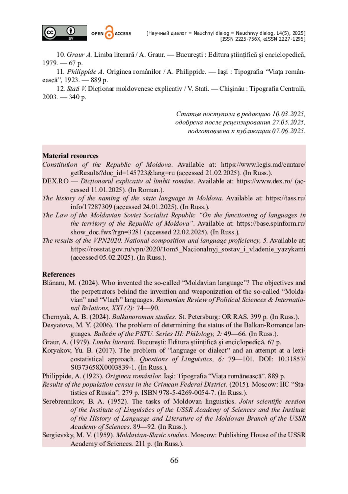 8. Blănaru M. Who invented the so-called “Moldavian language”? The objectives and the perpetrators behind the invention and weaponization of the so-called “Moldavian” and “Vlach” languages / M. Blănaru // Romanian Review of Political Sciences & International Relations. - 2024. - Vol. XXI. - № 2. - Pp. 74-90.