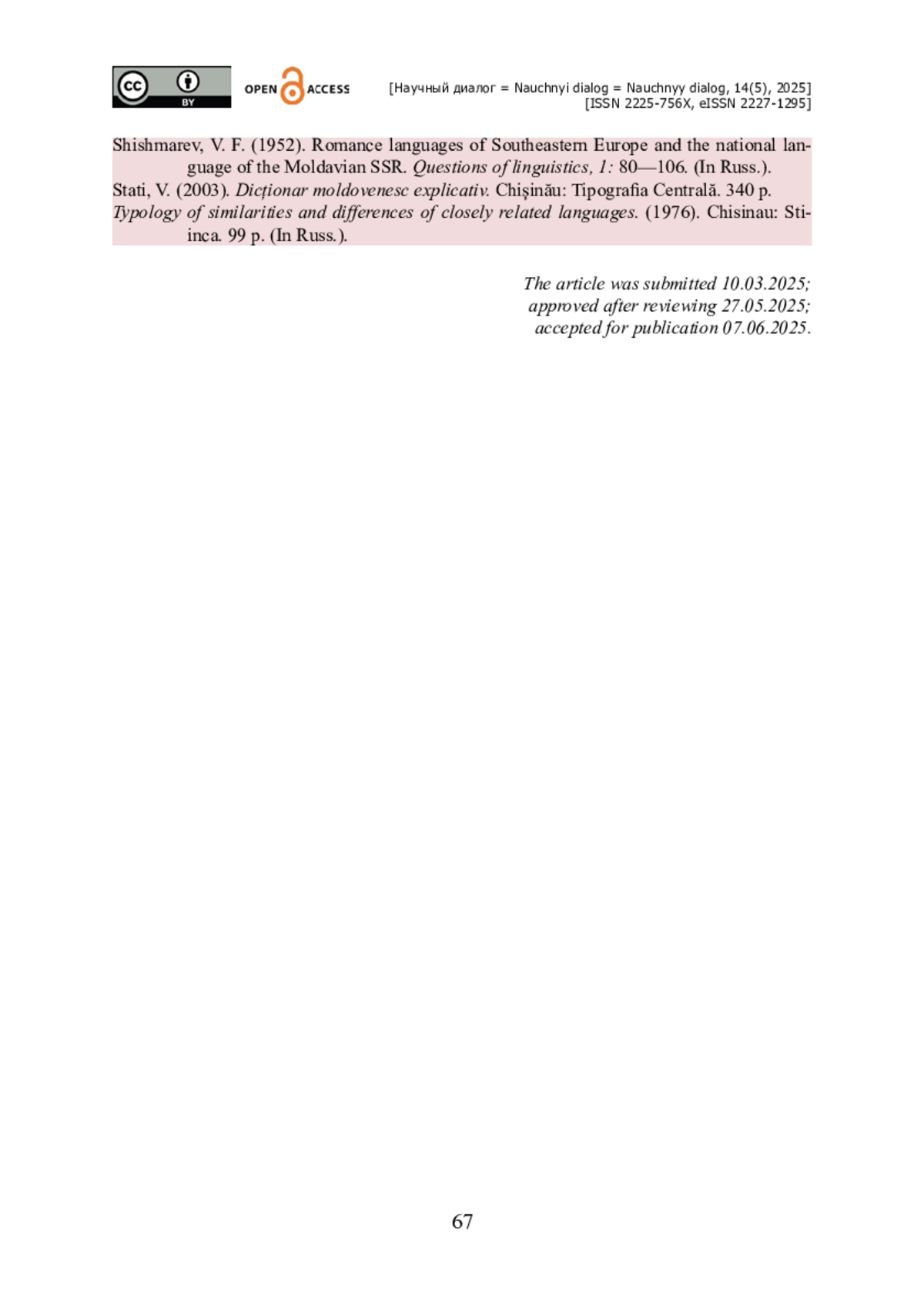 7. Черняк А. Б. Балканороманские этюды / А. Б. Черняк. - Санкт-Петербург : ИЛИ РАН, 2024. - 399 с. 8. Шишмарёв В. Ф. Романские языки Юго-Восточной Европы и национальный язык Молдавской ССР / В. Ф. Шишмарёв // Вопросы языкознания. - 1952. - № 1. - С. 80-106.