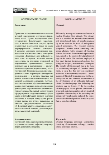 Проведено исследование консонантных сочетаний современного осетинского (иронского) языка. Целью исследования стало установление фонетических характеристик и фонологического статуса звуков, реализуемых носителями языка на месте орфографических звонких согласных. В качестве материала исследования привлекаются осетинские слова с кластерами согласных. Дикторами для цифровой записи слов выступили носители осетинского языка, не имеющие отклонений от нормативного произношения. Методы, используемые в исследовании — инструментальный (анализ осциллограмм) и статистический. Новизна исследования определяется самим характером проводимого исследования — в научном дискурсе нет данных относительно комбинаторных изменений осетинских согласных. Актуальность исследования обусловлена необходимостью полученных в ходе работы данных для создания орфоэпического словаря осетинского языка. На данный момент можно сформулировать следующие выводы: (1) на месте орфографических звонких смычных согласных в позиции конца слова реализуются парные им глухие, независимо от качества предшествующего согласного; (2) фонемный статус согласного, реализуемого в конечной позиции, должен определяться как глухой смычный.