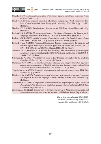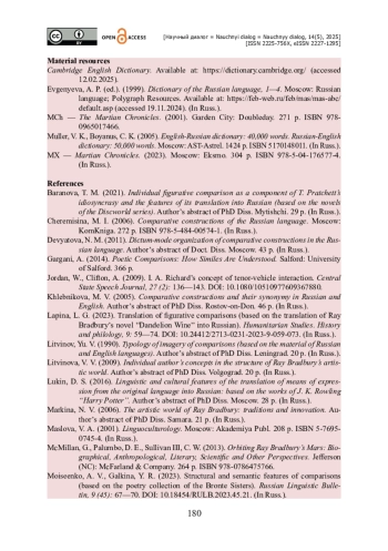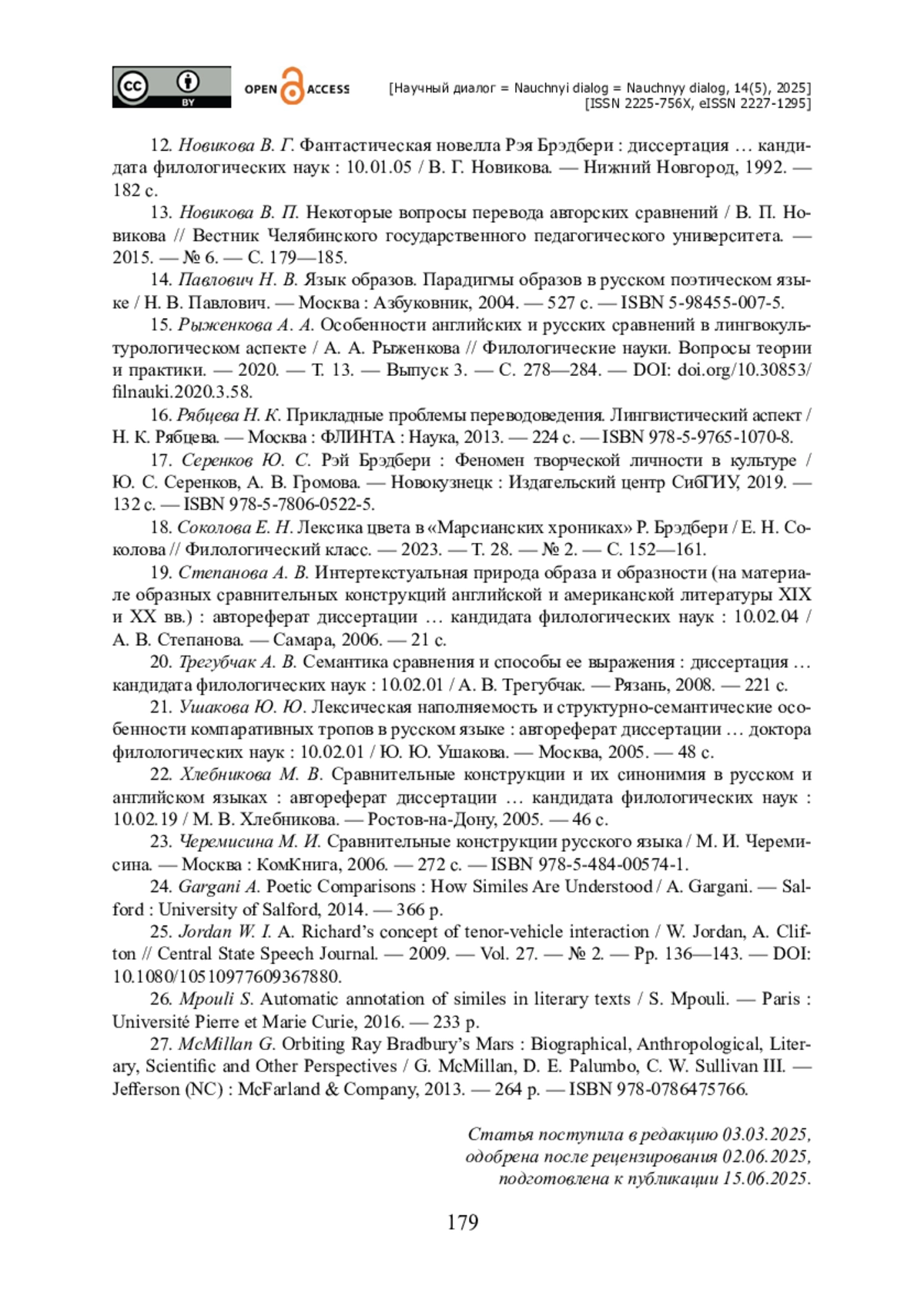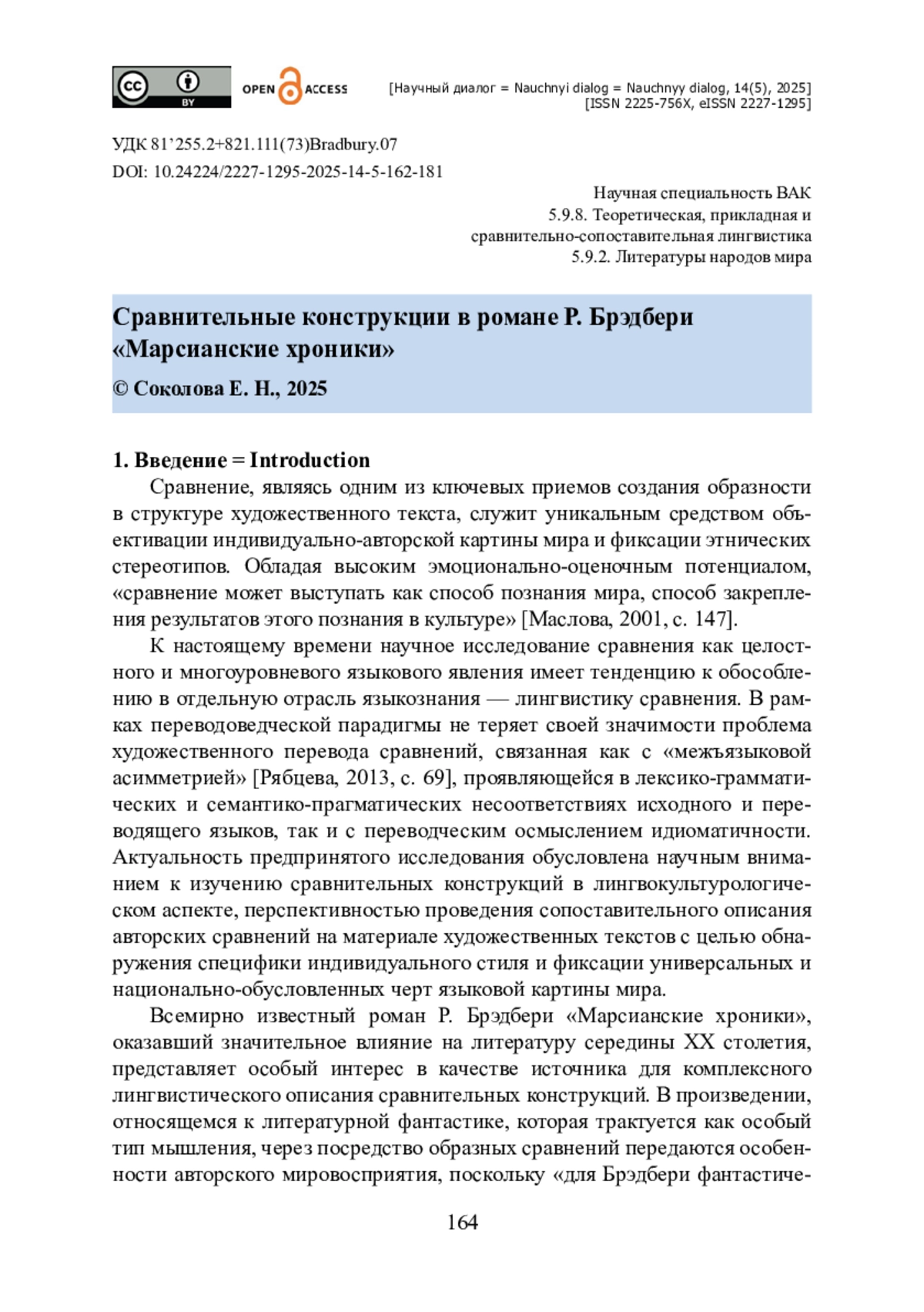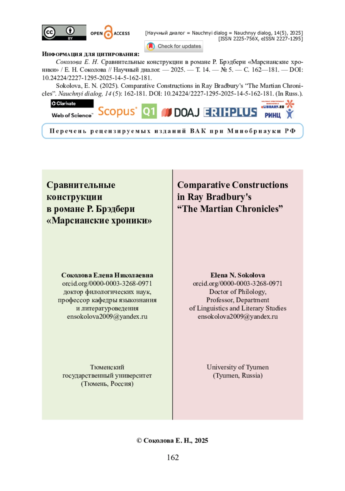 СОКОЛОВА Е. Н. СРАВНИТЕЛЬНЫЕ КОНСТРУКЦИИ В РОМАНЕ Р. БРЭДБЕРИ «МАРСИАНСКИЕ ХРОНИКИ» // НАУЧНЫЙ ДИАЛОГ. 2025. ТОМ 14, № 5