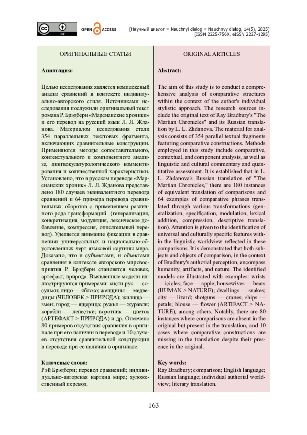 Целью исследования является комплексный анализ сравнений в контексте индивидуально-авторского стиля. Источниками исследования послужили оригинальный текст романа Р. Брэдбери «Марсианские хроники» и его перевод на русский язык Л. Л. Жданова. Материалом исследования стали 354 параллельных текстовых фрагмента, включающих сравнительные конструкции. Применяются методы сопоставительного, контекстуального и компонентного анализа, лингвокультурологического комментирования и количественной характеристики. Установлено, что в русском переводе «Марсианских хроник» Л. Л. Жданова представлено 180 случаев эквивалентного перевода сравнений и 64 примера перевода сравнительных оборотов с применением различного рода трансформаций (генерализация, конкретизация, модуляция, лексическое добавление, компрессия, описательный перевод). Уделяется внимание фиксации в сравнениях универсальных и национально-обусловленных черт языковой картины мира. Доказано, что и субъектами, и объектами сравнения в контексте авторского мировосприятия Р. Брэдбери становятся человек, артефакт, природа. Выявленные модели иллюстрируются примерами: кисти рук — сосульки; лицо — яблоко; женщины — медведицы (ЧЕЛОВЕК > ПРИРОДА); жилища — змеи; город — ящерица; ружья — журавли; корабли — лепестки; воротник — цветок (АРТЕФАКТ > ПРИРОДА) и др. Отмечено 80 примеров отсутствия сравнения в оригинале при его наличии в переводе и 10 случаев отсутствия сравнительной конструкции в переводе при ее наличии в оригинале.