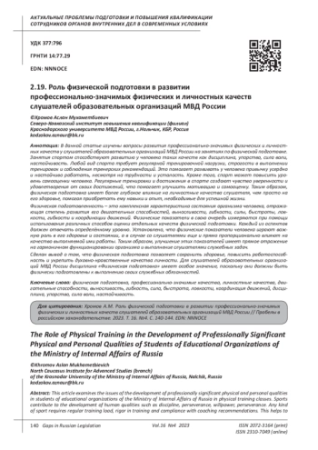 Khazhirokov V.A. Organization and improvement of physical training skills of students studying in universities of the Ministry of Internal Affairs of Russia // Education. The science. Scientific personnel. 2019. No. 1. pp. 203-205. EDN: VXELFO