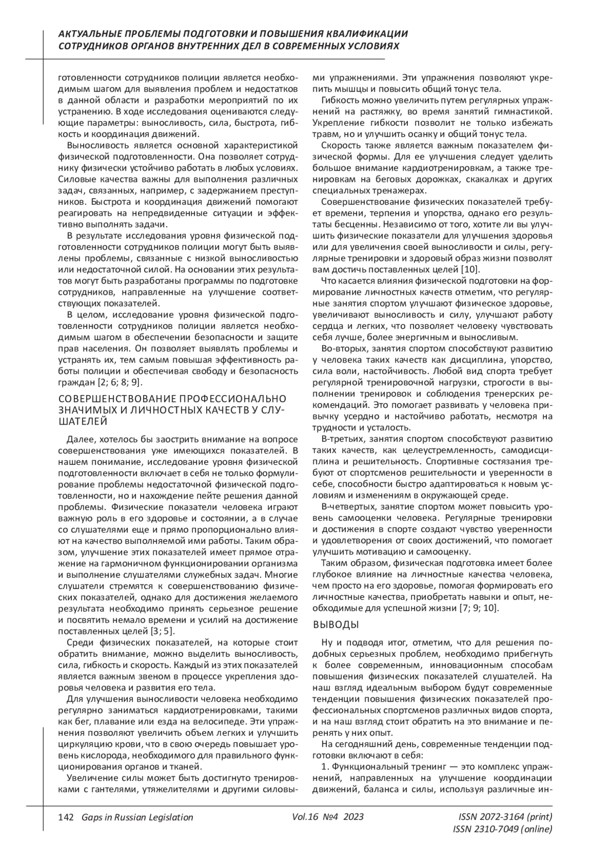 9. Хажироков В.А. Место и роль дисциплины “Физическая подготовка” в формировании профессионально важных качеств у слушателей образовательных организаций МВД России // Культура физическая и здоровье. 2021. № 2 (78). С. 110-112. EDN: YYZGGS