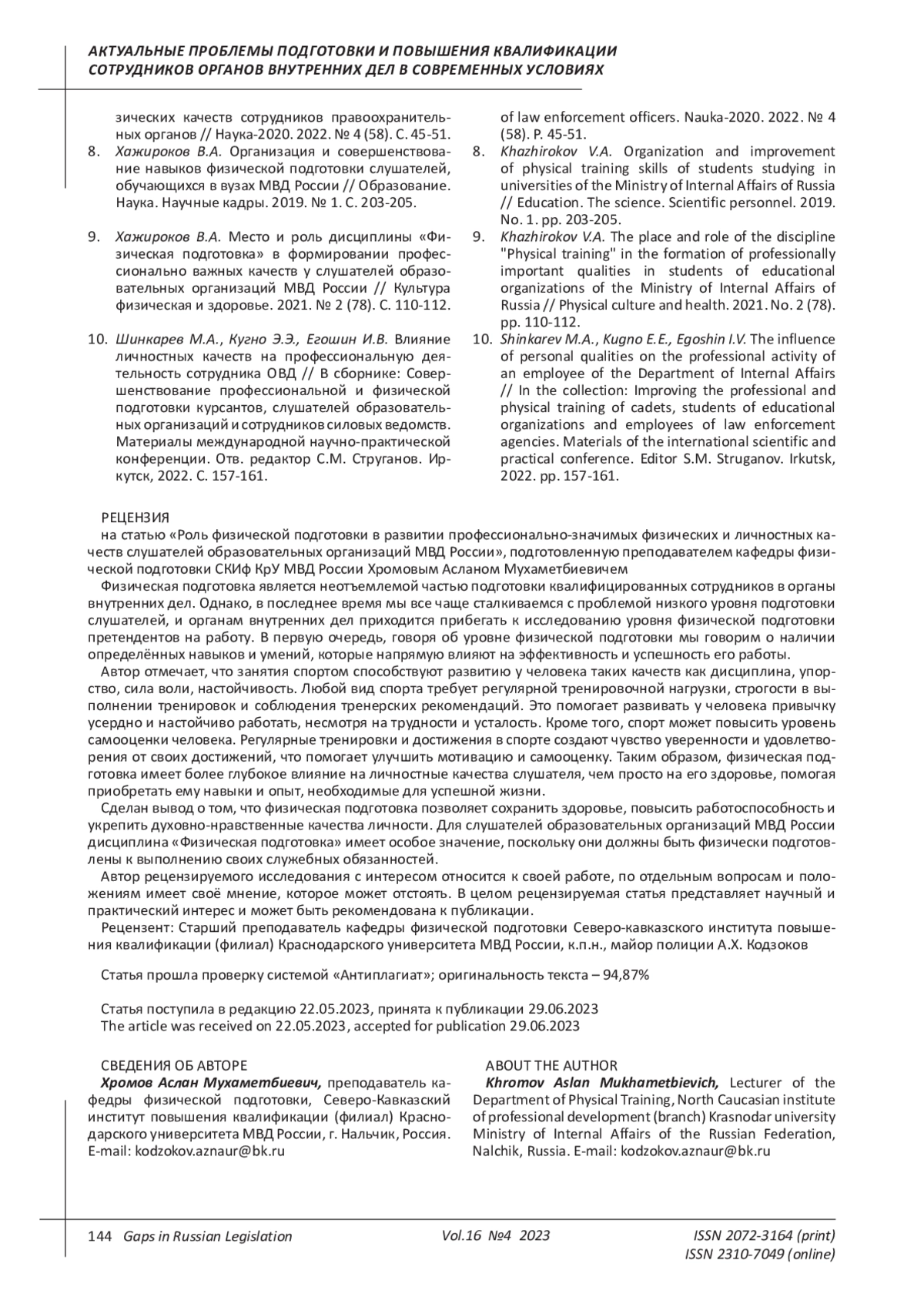 8. Хажироков В.А. Организация и совершенствование навыков физической подготовки слушателей, обучающихся в вузах МВД России // Образование. Наука. Научные кадры. 2019. № 1. С. 203-205. EDN: VXELFO
