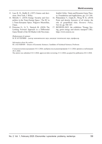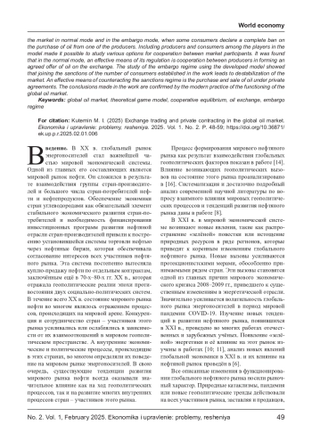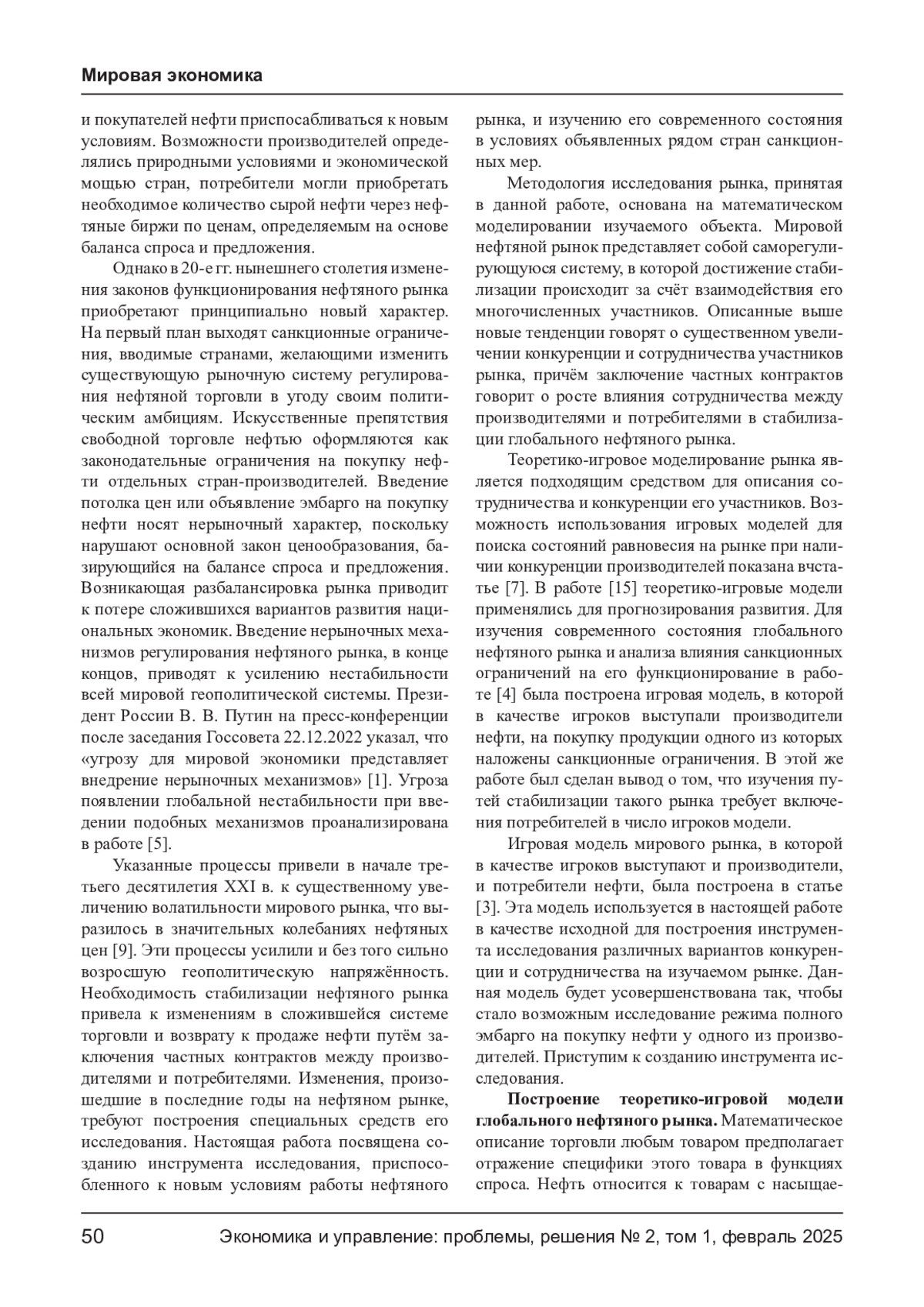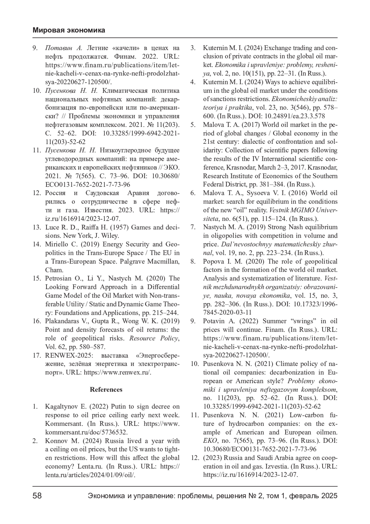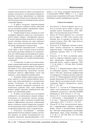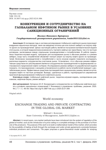 КУТЕРНИН М. И. КОНКУРЕНЦИЯ И СОТРУДНИЧЕСТВО НА ГЛОБАЛЬНОМ НЕФТЯНОМ РЫНКЕ В УСЛОВИЯХ САНКЦИОННЫХ ОГРАНИЧЕНИЙ // ЭКОНОМИКА И УПРАВЛЕНИЕ: ПРОБЛЕМЫ, РЕШЕНИЯ. 2025. ТОМ 1 № 2
