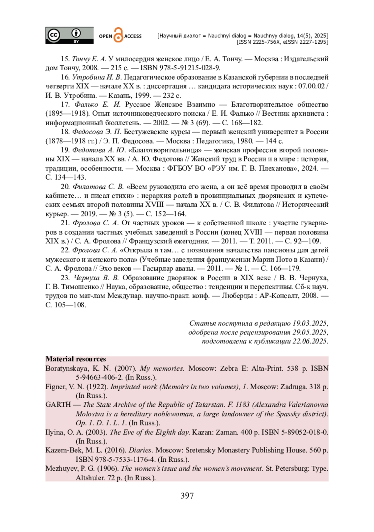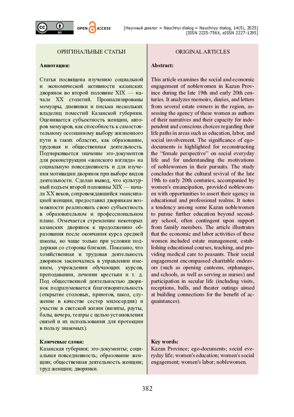 МИРОНОВА Е. В. СОЦИАЛЬНО-ЭКОНОМИЧЕСКАЯ ДЕЯТЕЛЬНОСТЬ ДВОРЯНОК КАЗАНСКОЙ ГУБЕРНИИ ВО ВТОРОЙ ПОЛОВИНЕ XIX — НАЧАЛЕ XX ВЕКОВ // НАУЧНЫЙ ДИАЛОГ. 2025. ТОМ 14, № 5