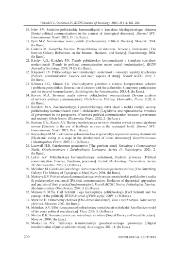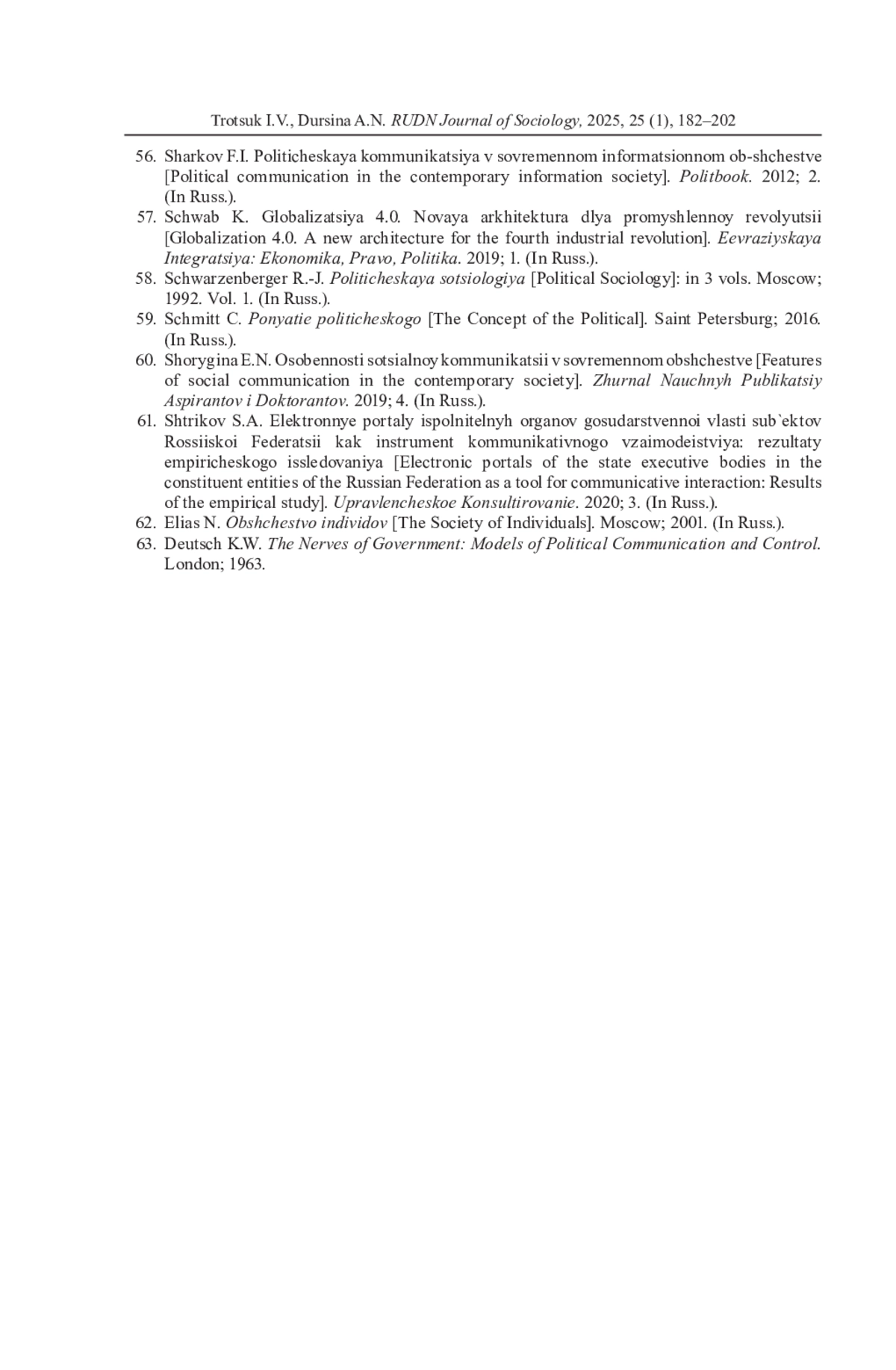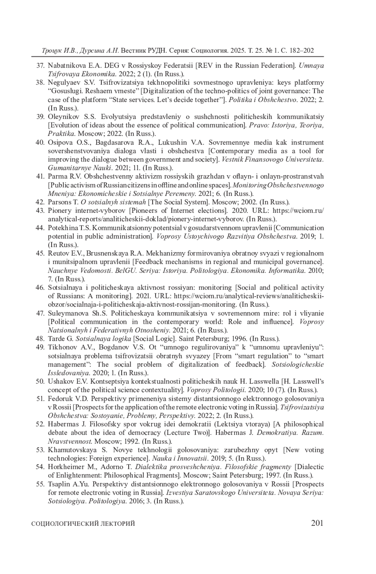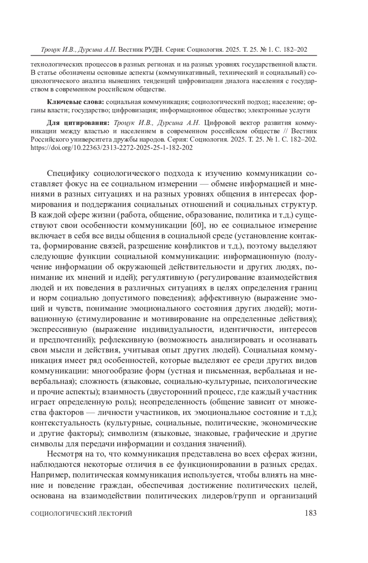 ТРОЦУК И. В., ДУРСИНА А. Н. ЦИФРОВОЙ ВЕКТОР РАЗВИТИЯ КОММУНИКАЦИИ МЕЖДУ ВЛАСТЬЮ И НАСЕЛЕНИЕМ В СОВРЕМЕННОМ РОССИЙСКОМ ОБЩЕСТВЕ // ВЕСТНИК РОССИЙСКОГО УНИВЕРСИТЕТА ДРУЖБЫ НАРОДОВ. СЕРИЯ: СОЦИОЛОГИЯ. 2025. Т. 25 № 1
