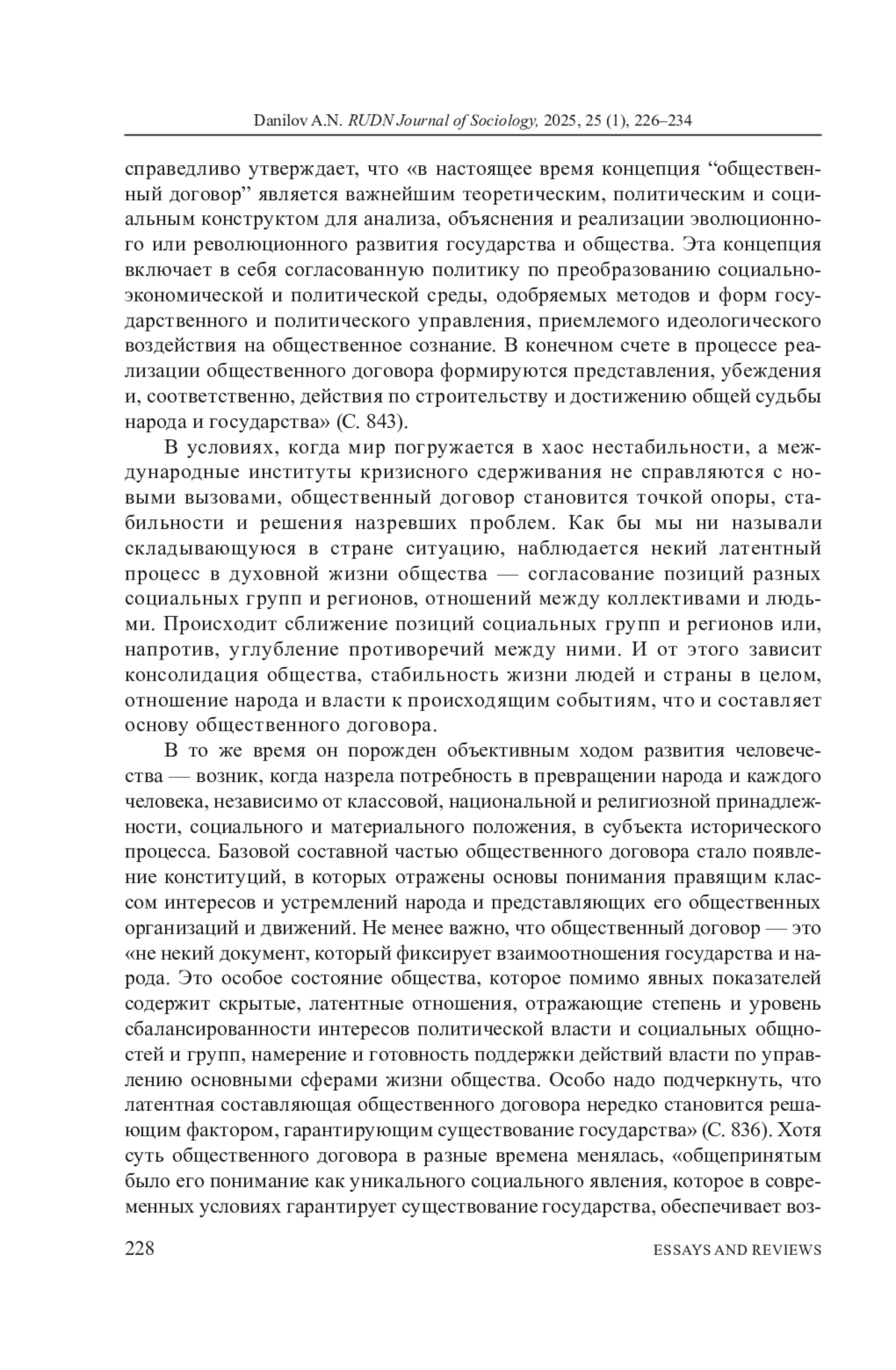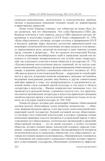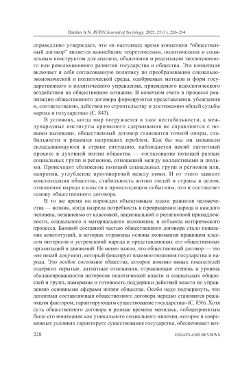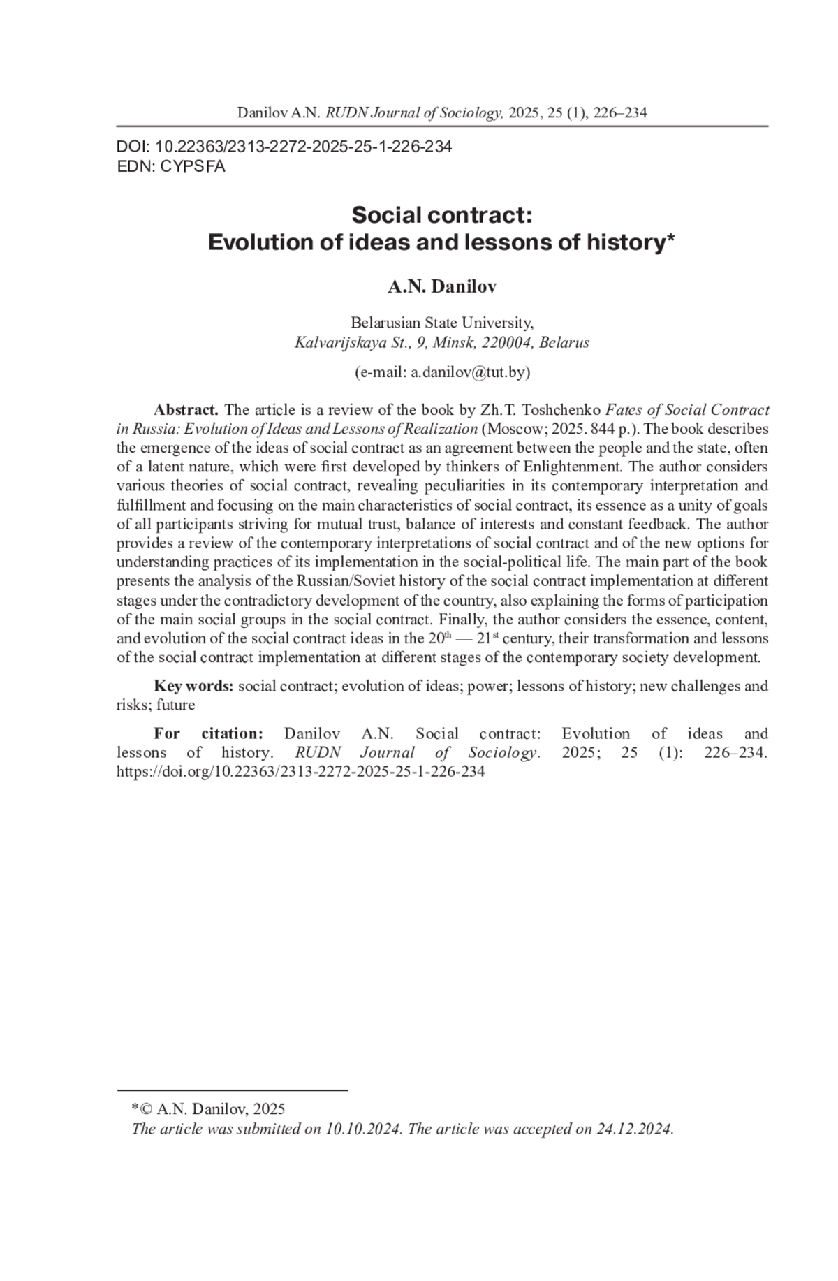 Статья представляет собой рецензию на книгу Ж. Т. Тощенко «Судьбы общественного договора в России: эволюция идей и уроки реализации» (М.: ФНИСЦ РАН; РГГУ, 2025. 844 с.). В монографии описано возникновение и проанализировано содержание концепции общественного договора, впервые выдвинутой и обоснованной мыслителями эпохи Просвещения как идеи социального контракта между народом и государством, причем латентного характера. Значительное внимание в книге уделено сложившимся теориям общественного договора и их особенностям, многообразным вариантам его толкования и осуществления в современной социальной практике. Особый акцент автор делает на выявлении основных характеристик общественного договора, его смысловой сущности как единства целей участников, ориентированных на взаимное доверие, баланс интересов и постоянное использование обратной связи. Представлены современные интерпретации общественного договора и новые варианты осмысления практик его реализации в современной общественно-политической жизни. Проведен обстоятельный анализ исторического опыта реализации общественного договора на разных этапах существования России/СССР в противоречивом развитии и функционировании страны, а также форм участия основных социальных групп в общественном договоре. Обозначены суть, содержание и эволюция идей общественного договора в XX-XXI веках, их трансформация и уроки реализации общественного договора на различных этапах общественного развития.
