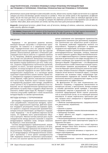 Статья: АНАЛИЗ ОПЫТА ЗАРУБЕЖНЫХ СТРАН В БОРЬБЕ С МЕЖДУНАРОДНЫМ ТЕРРОРИЗМОМ (2023)