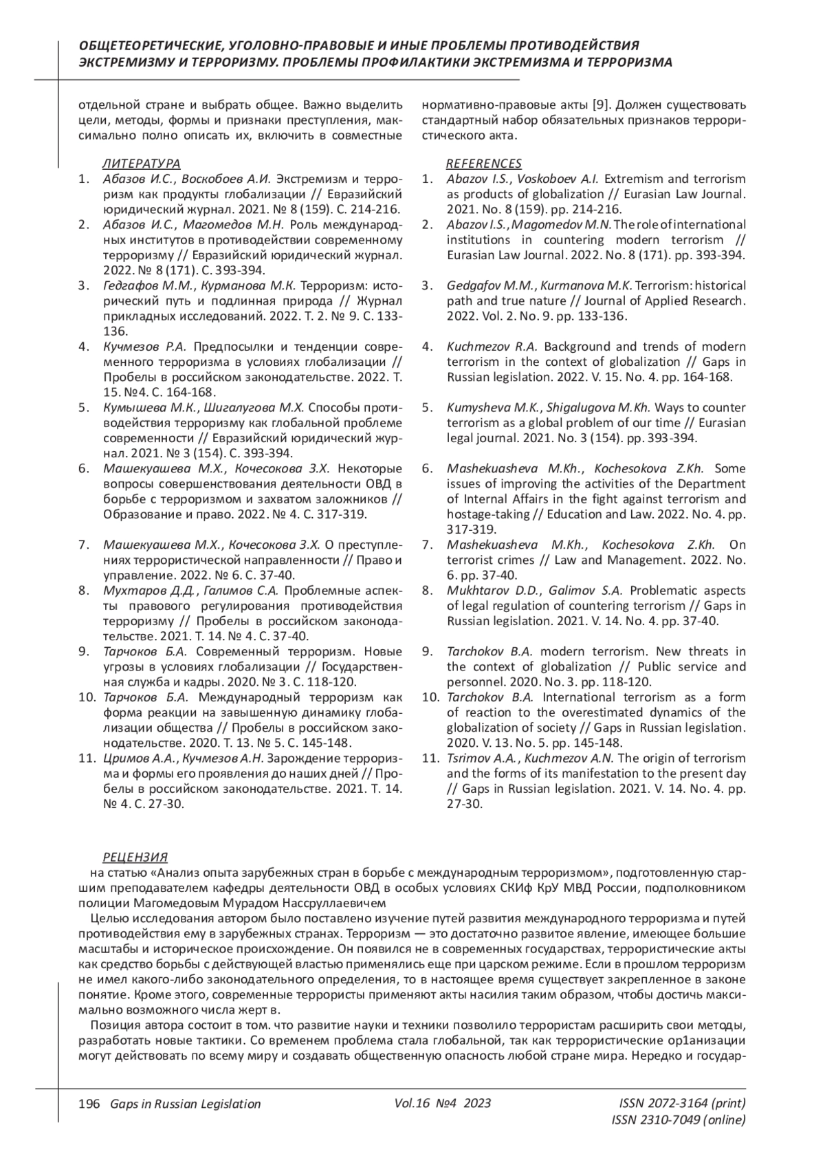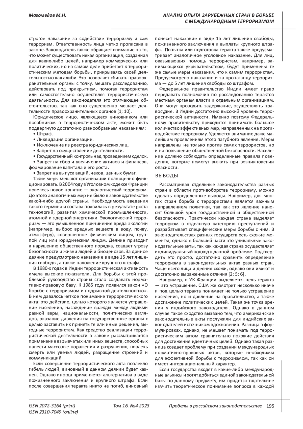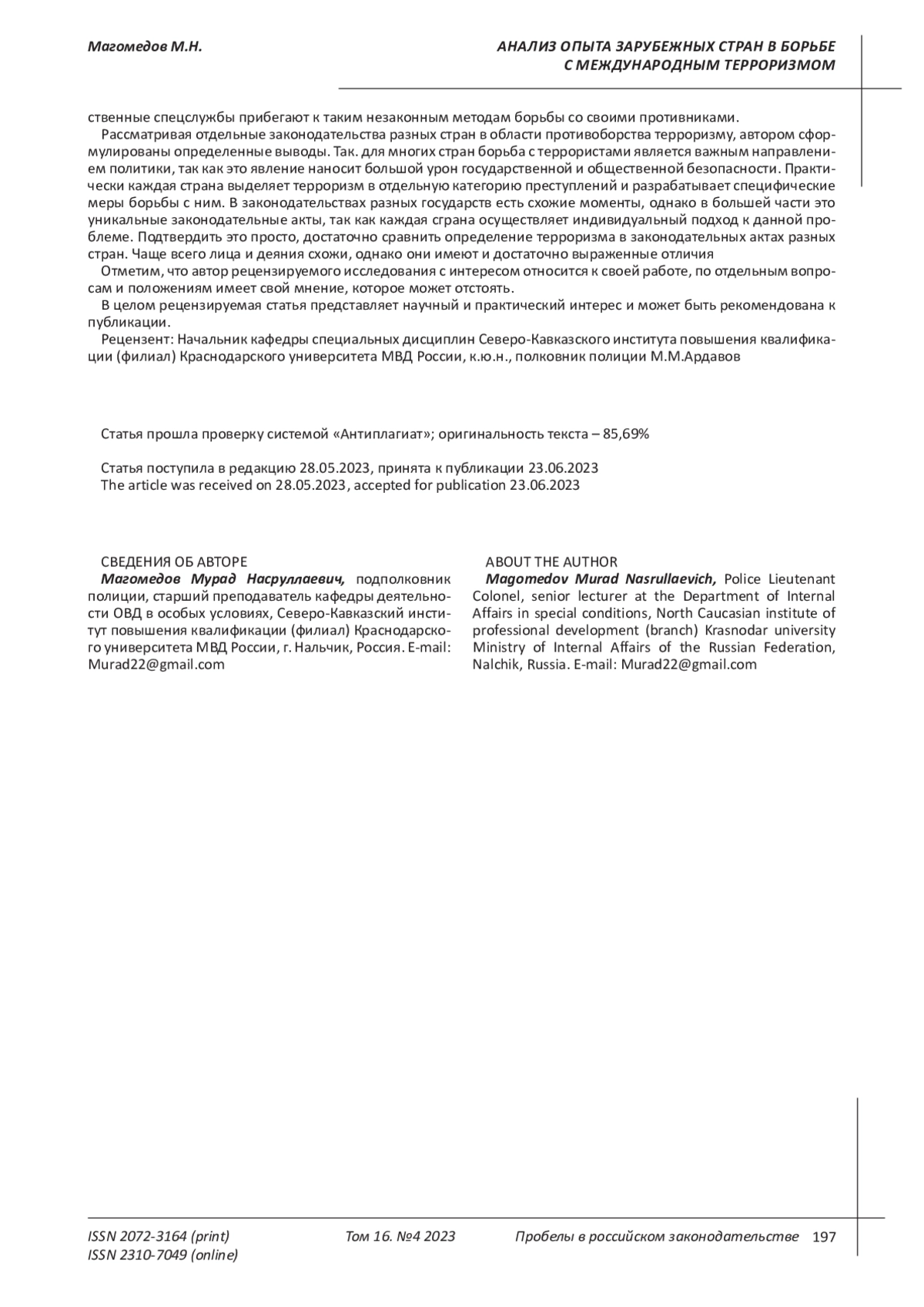 МАГОМЕДОВ М. Н. АНАЛИЗ ОПЫТА ЗАРУБЕЖНЫХ СТРАН В БОРЬБЕ С МЕЖДУНАРОДНЫМ ТЕРРОРИЗМОМ // ПРОБЕЛЫ В РОССИЙСКОМ ЗАКОНОДАТЕЛЬСТВЕ. 2023. Т. 16 № 4