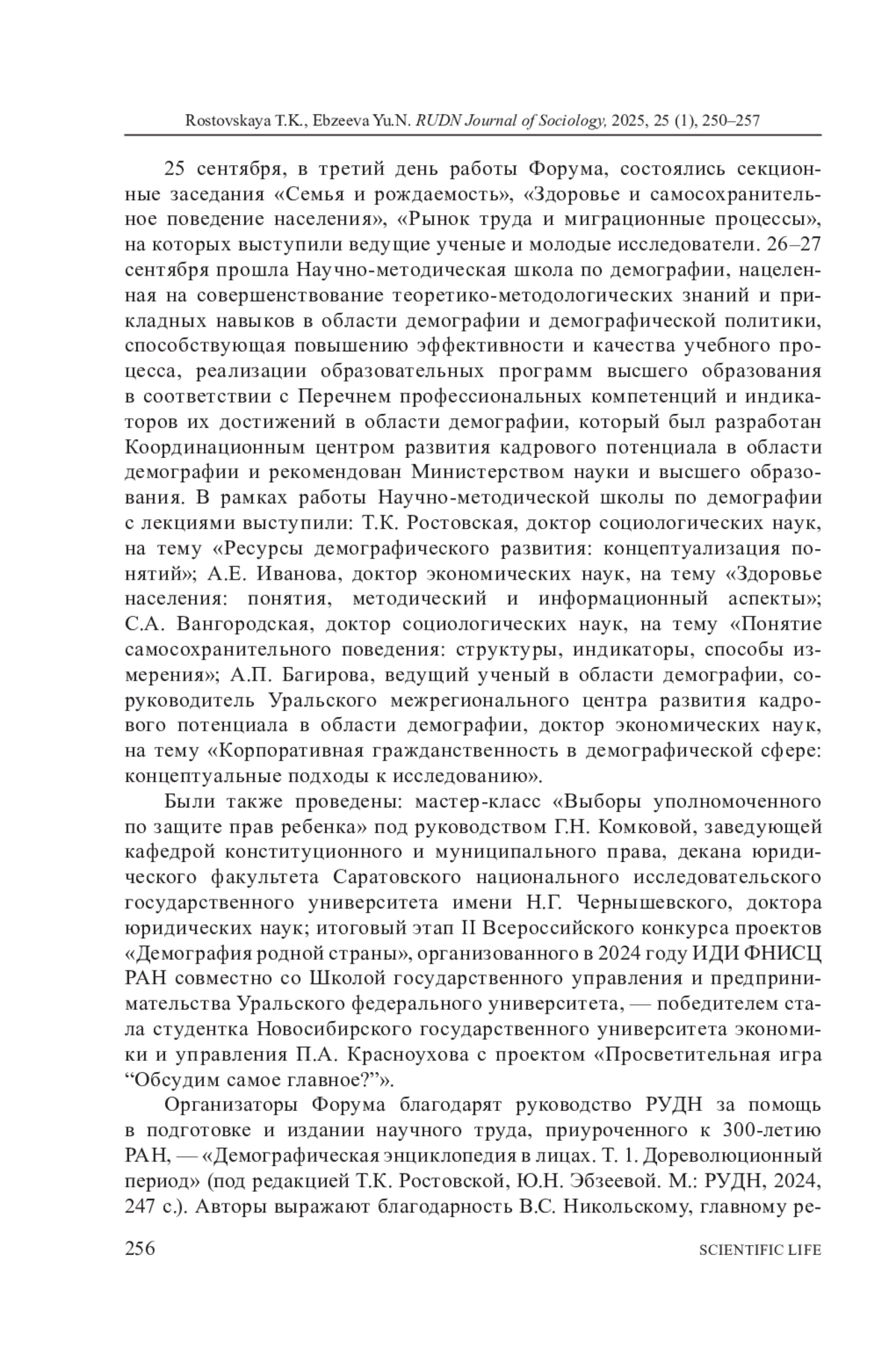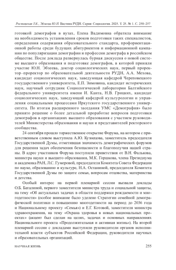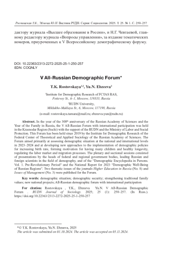 В год 300-летия Российской академии наук и Год семьи в Российской Федерации в Краснодарском крае (городе Сочи) при поддержке РУДН и Министерства труда и социальной защиты состоялся V Всероссийский форум с международным участием, который проводится с 2019 года Институтом демографических исследований (ИДИ) ФНИСЦ РАН. Ключевая цель Форума - оценка демографической ситуации на национальном и международном уровнях в 2023-2024 годы; выработка новых подходов к реализации демографической политики, направленной на повышение рождаемости, формирование мотивации к многодетности и здоровому долгожительству, регулирование рынка труда и миграционных процессов. На пленарных и секционных заседаниях были представлены доклады руководителей федеральных и региональных органов государственной власти, ведущих российских и зарубежных ученых в области демографии, а также «Демографическая энциклопедия в лицах. Т. 1. Дореволюционный период» и Национальный доклад за 2023 год «Демографическое самочувствие регионов России». К Форуму были подготовлены два тематических номера журналов «Высшее образование в России» (№ 8) и «Вопросы управления» (№ 3).