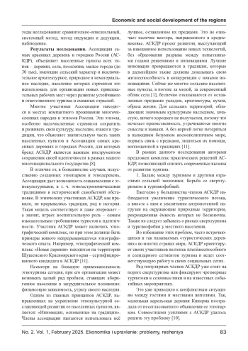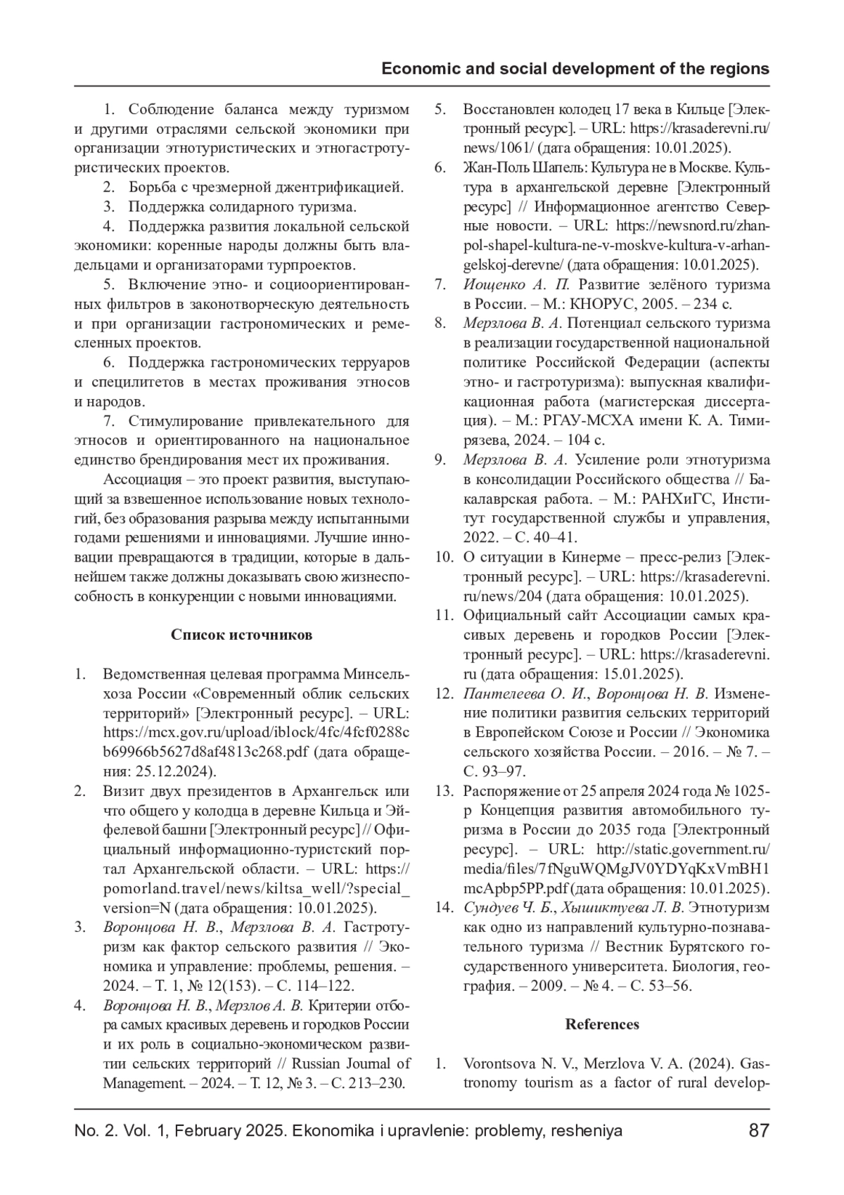 3. Воронцова Н. В., Мерзлова В. А. Гастротуризм как фактор сельского развития // Экономика и управление: проблемы, решения. - 2024. - Т. 1, № 12(153). - С. 114-122. EDN: CJQJGQ