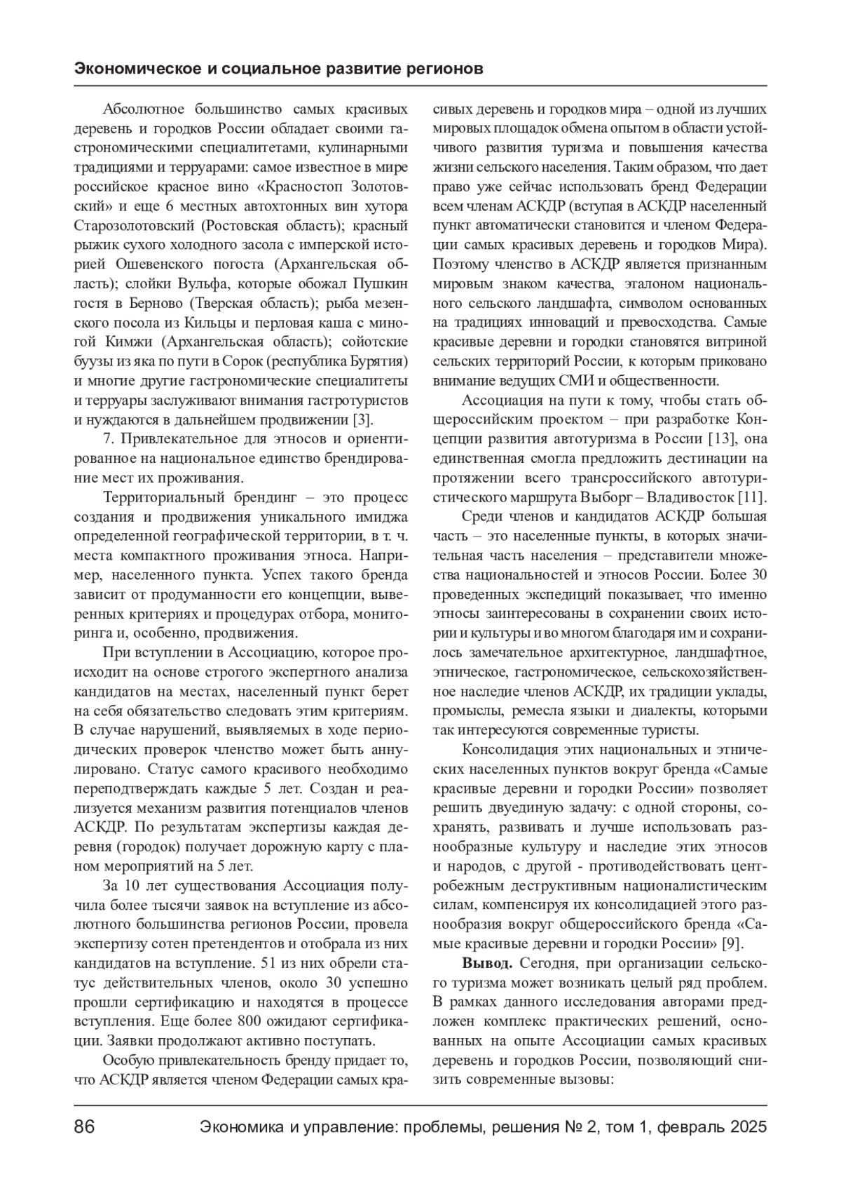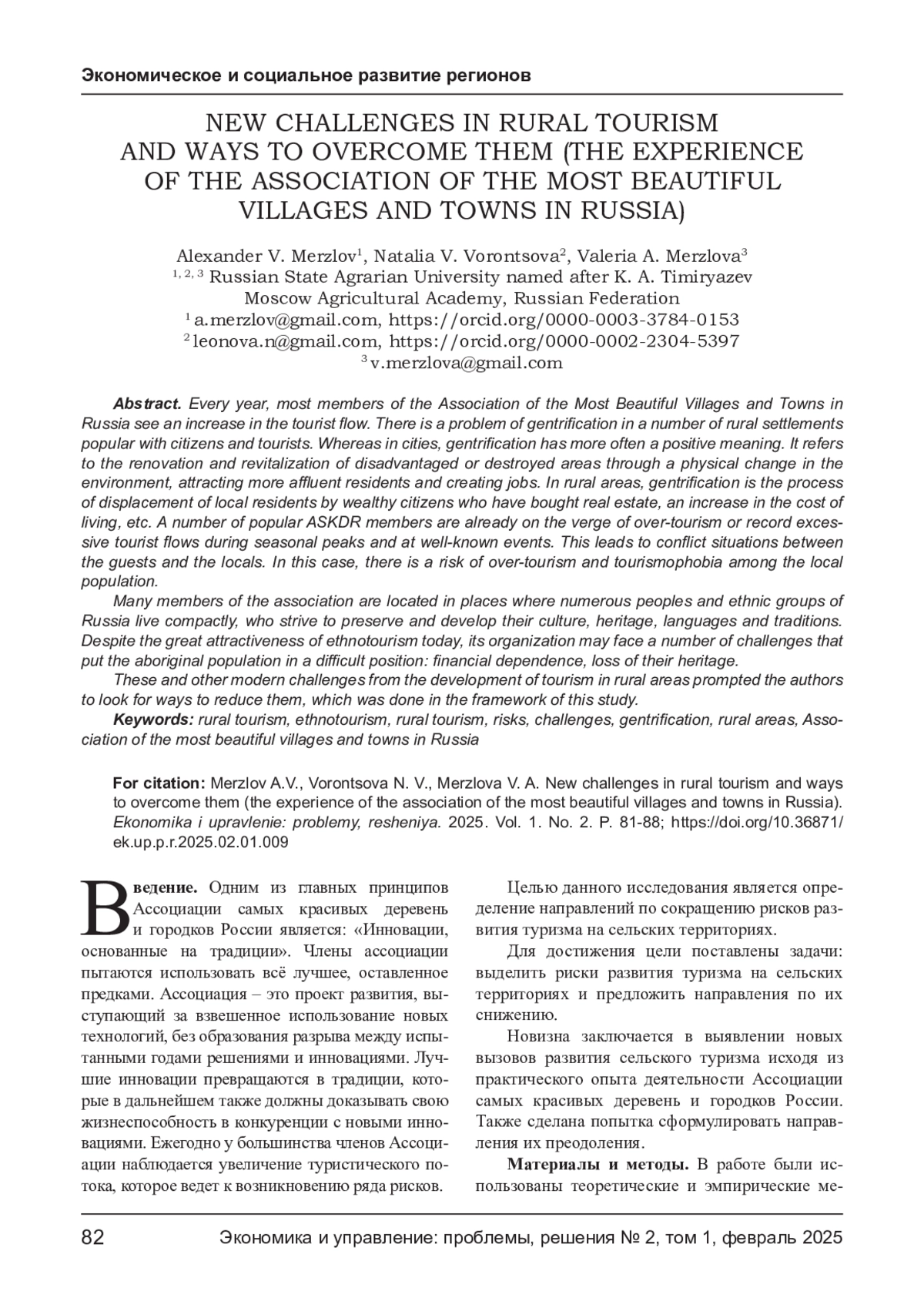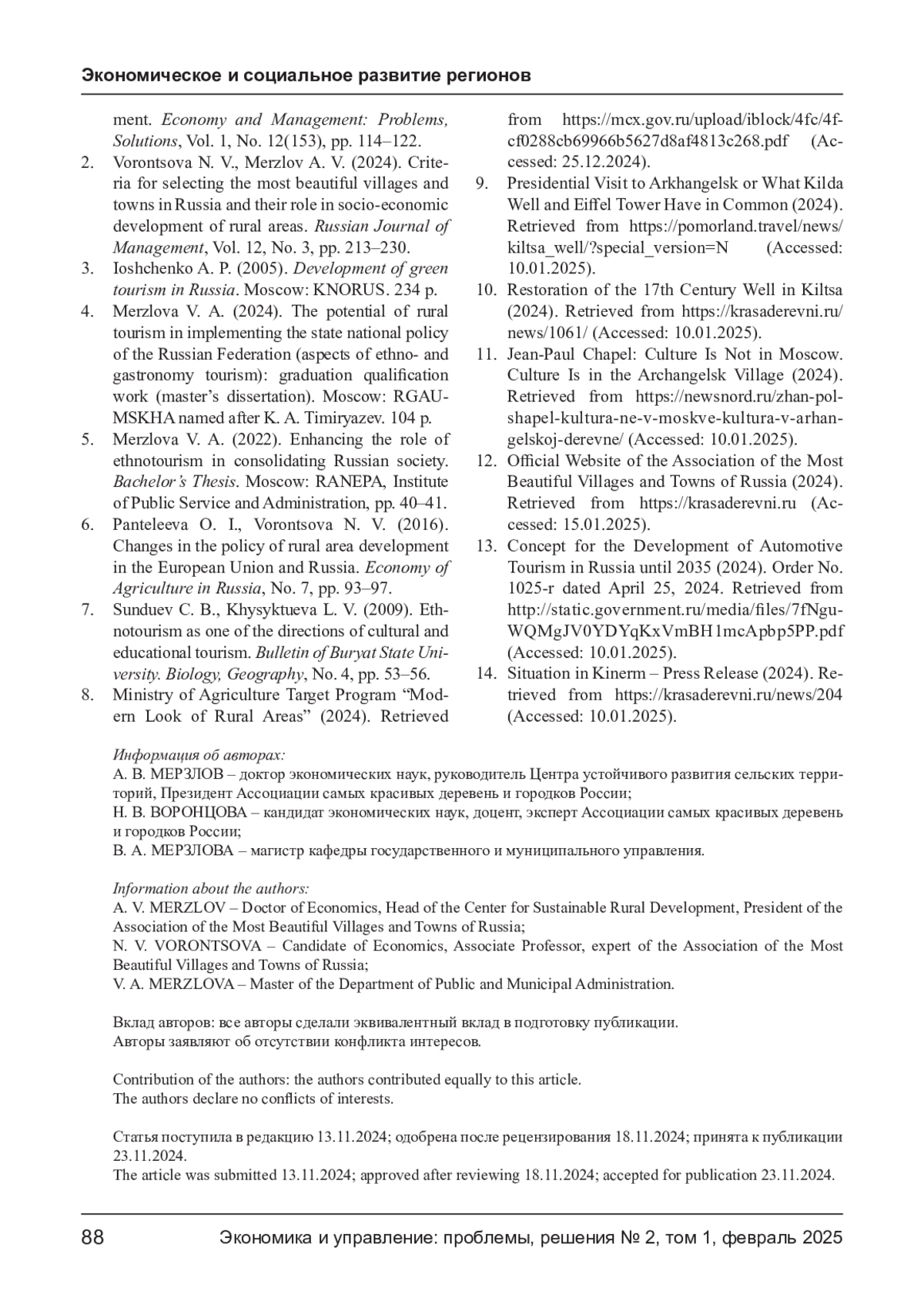 4. Воронцова Н. В., Мерзлов А. В. Критерии отбора самых красивых деревень и городков России и их роль в социально-экономическом развитии сельских территорий // Russian Journal of Management. - 2024. - Т. 12, № 3. - С. 213-230. EDN: PRYPIH
