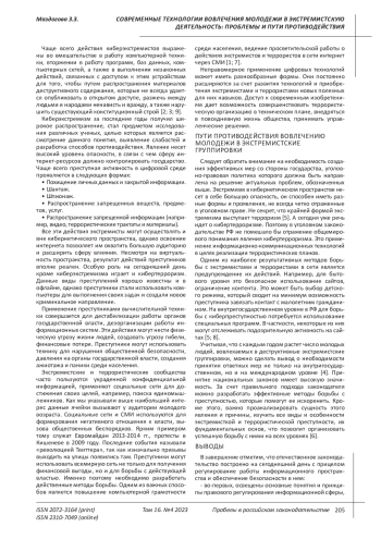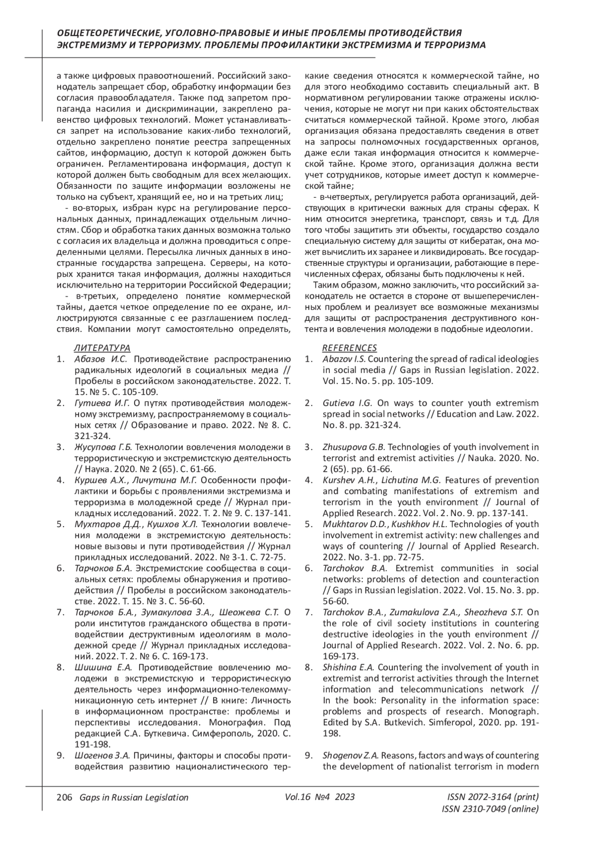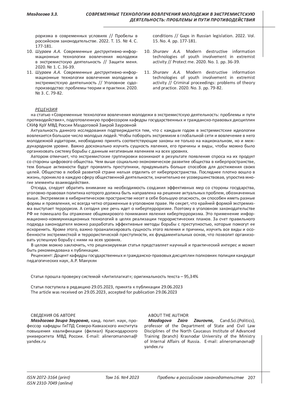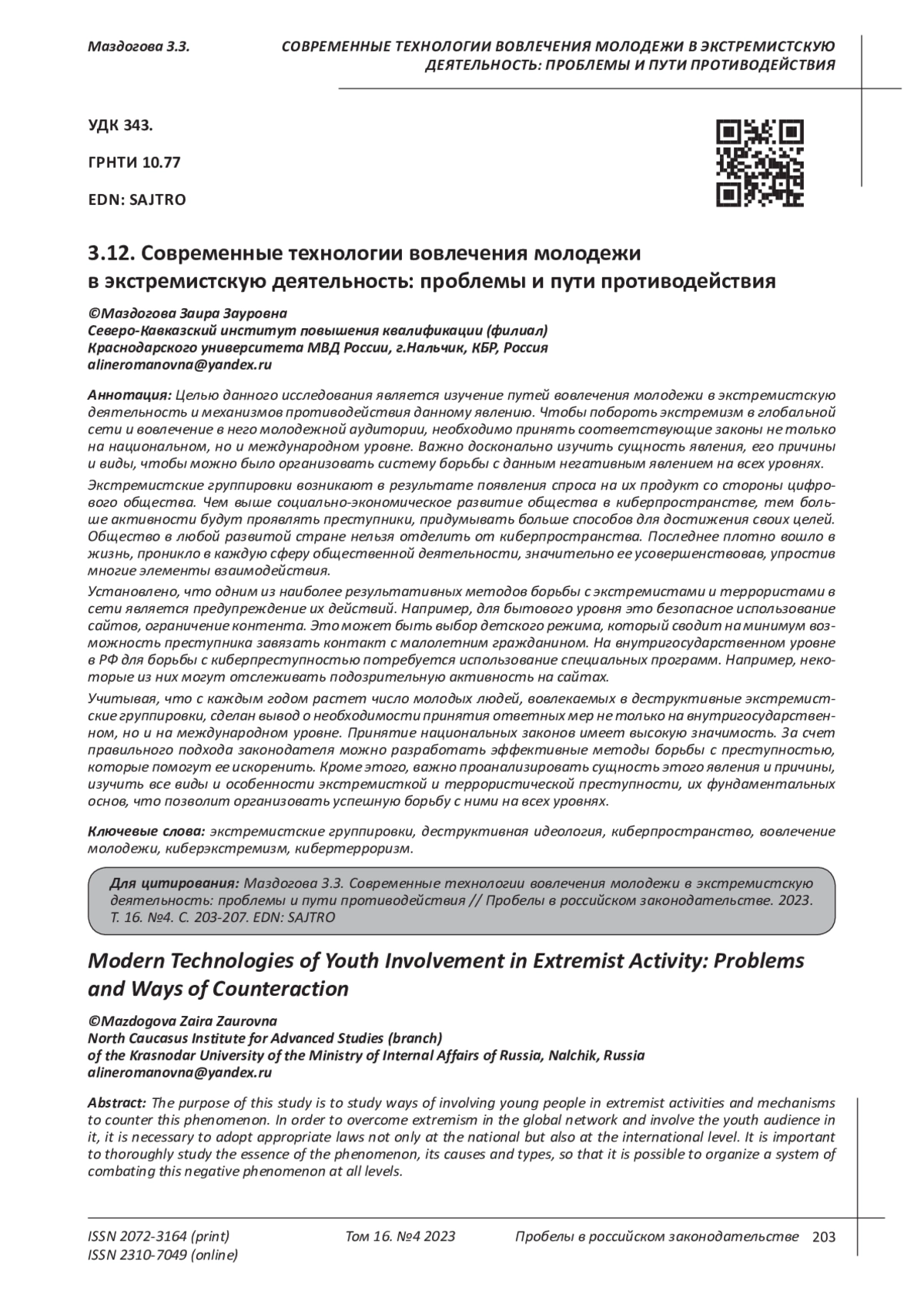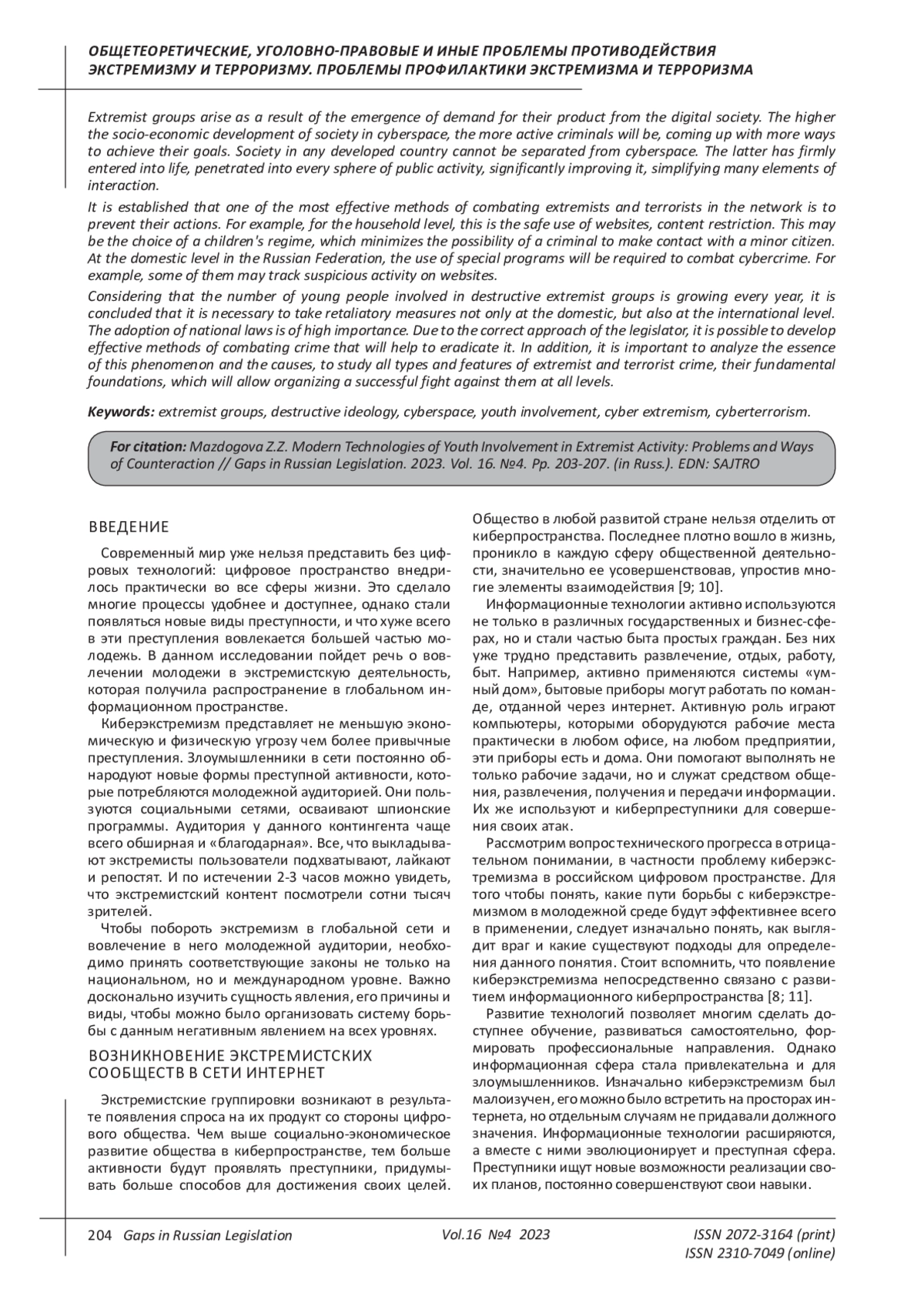 МАЗДОГОВА З. З. СОВРЕМЕННЫЕ ТЕХНОЛОГИИ ВОВЛЕЧЕНИЯ МОЛОДЕЖИ В ЭКСТРЕМИСТСКУЮ ДЕЯТЕЛЬНОСТЬ: ПРОБЛЕМЫ И ПУТИ ПРОТИВОДЕЙСТВИЯ // ПРОБЕЛЫ В РОССИЙСКОМ ЗАКОНОДАТЕЛЬСТВЕ. 2023. Т. 16 № 4