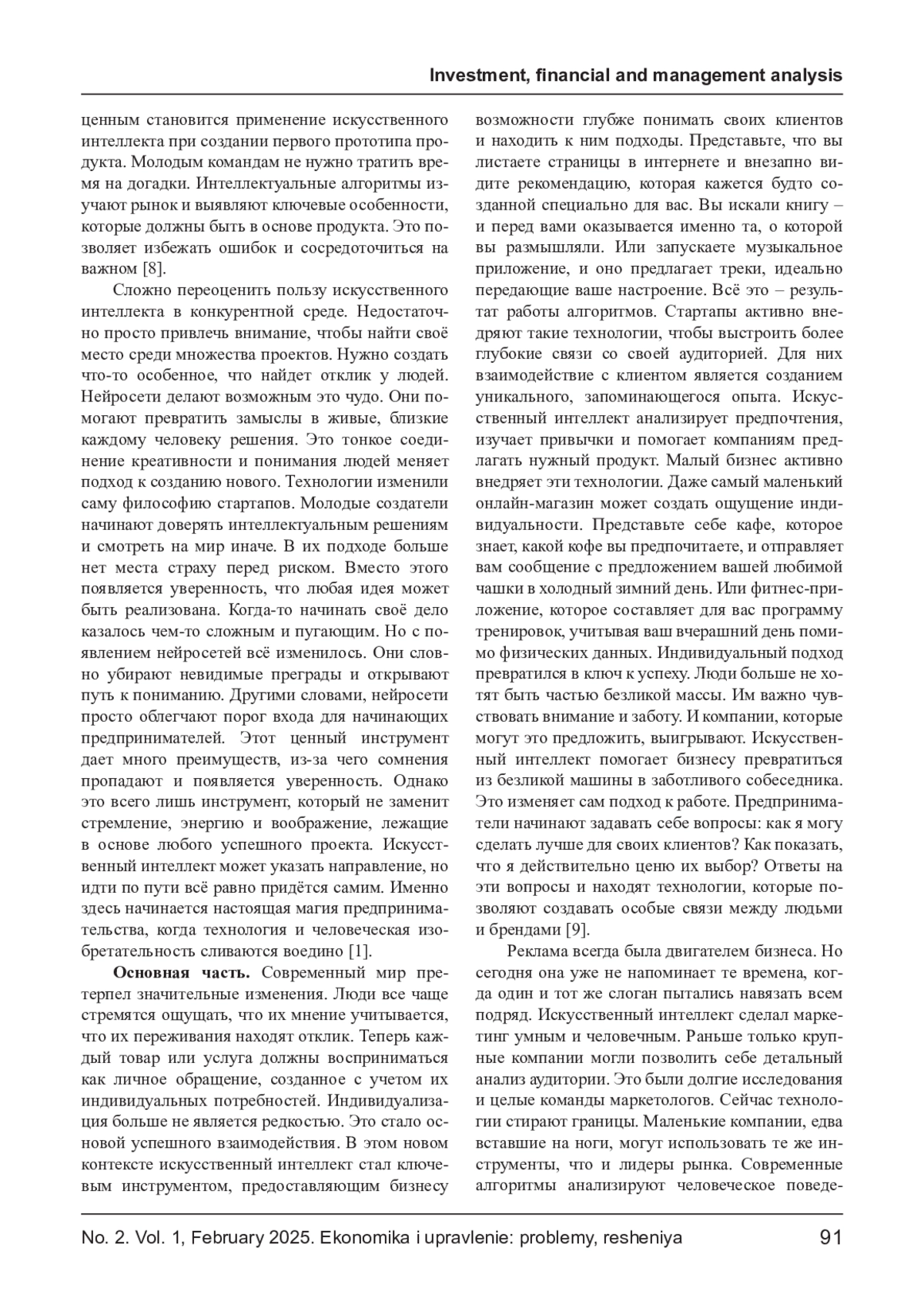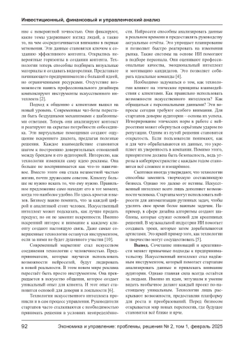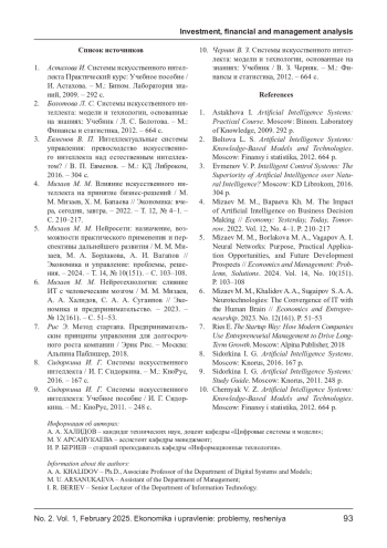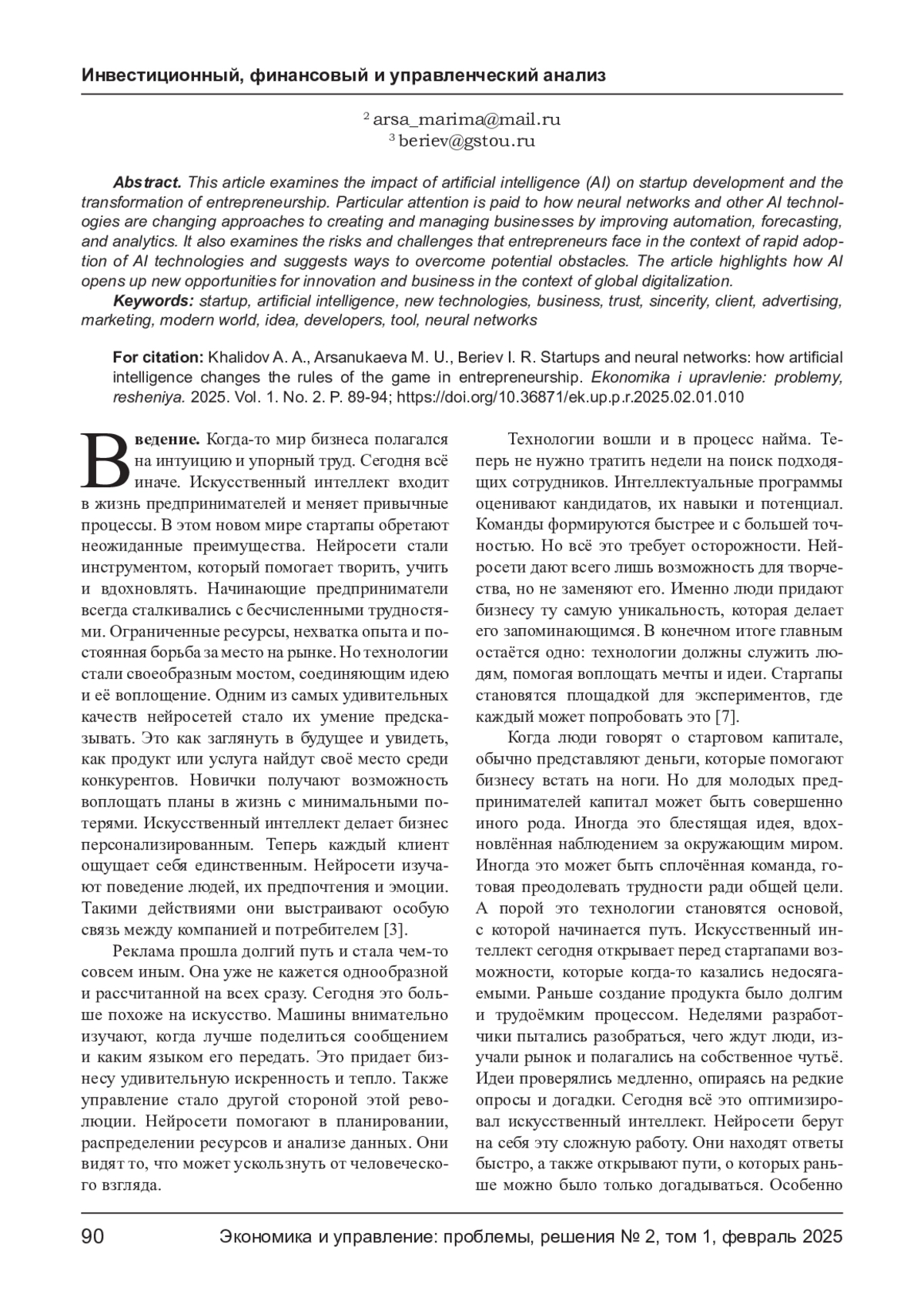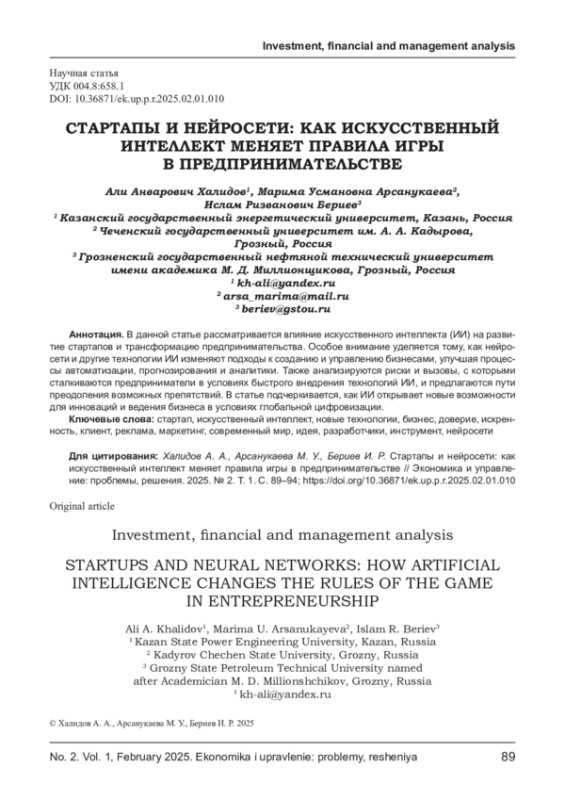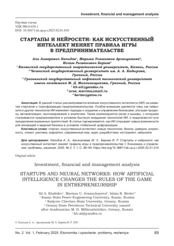 ХАЛИДОВ А. А., АРСАНУКАЕВА М. У., БЕРИЕВ И. Р. СТАРТАПЫ И НЕЙРОСЕТИ: КАК ИСКУССТВЕННЫЙ ИНТЕЛЛЕКТ МЕНЯЕТ ПРАВИЛА ИГРЫ В ПРЕДПРИНИМАТЕЛЬСТВЕ // ЭКОНОМИКА И УПРАВЛЕНИЕ: ПРОБЛЕМЫ, РЕШЕНИЯ. 2025. ТОМ 1 № 2