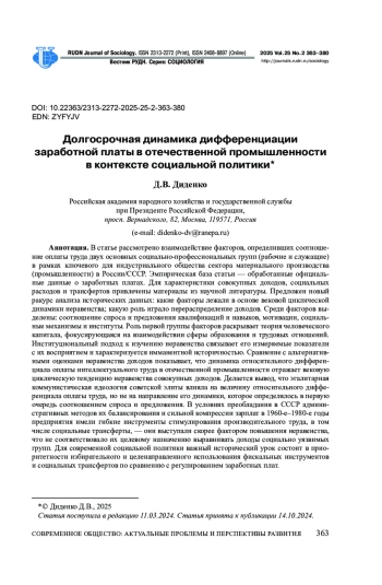 В статье рассмотрено взаимодействие факторов, определивших соотношение оплаты труда двух основных социально-профессиональных групп (рабочие и служащие) в рамках ключевого для индустриального общества сектора материального производства (промышленности) в России/СССР. Эмпирическая база статьи - обработанные официальные данные о заработных платах. Для характеристики совокупных доходов, социальных расходов и трансфертов привлечены материалы из научной литературы. Предложен новый ракурс анализа исторических данных: какие факторы лежали в основе вековой циклической динамики неравенства; какую роль играло перераспределение доходов. Среди факторов выделены: соотношение спроса и предложения квалификаций и навыков, мотивации, социальные механизмы и институты. Роль первой группы факторов раскрывает теория человеческого капитала, фокусирующаяся на взаимодействии сферы образования и трудовых отношений. Институциональный подход к изучению неравенства связывает его измеряемые показатели с их восприятием и характеризуется имманентной историчностью. Сравнение с альтернативными оценками неравенства доходов показывает, что динамика относительного дифференциала оплаты интеллектуального труда в отечественной промышленности отражает вековую циклическую тенденцию неравенства совокупных доходов. Делается вывод, что эгалитарная коммунистическая идеология советской элиты влияла на величину относительного дифференциала оплаты труда, но не на направление его динамики, которое определялось в первую очередь соотношением спроса и предложения. В условиях преобладания в СССР административных методов их балансирования и сильной компрессии зарплат в 1960-е-1980-е годы предприятия имели гибкие инструменты стимулирования производительного труда, в том числе социальные трансферты, - они выступали скорее фактором повышения неравенства, что не соответствовало их целевому назначению выравнивать доходы социально уязвимых групп. Для современной социальной политики важный исторический урок состоит в приоритетности избирательного и целенаправленного использования фискальных инструментов и социальных трансфертов по сравнению с регулированием заработных плат.